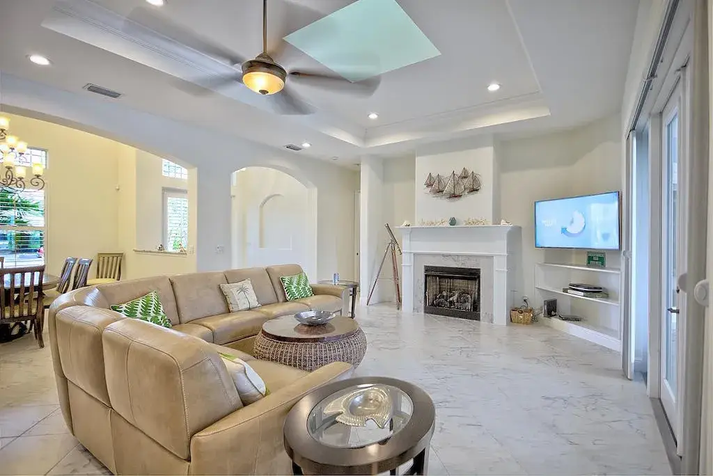 Open floor plan with fireplace and water views throughout