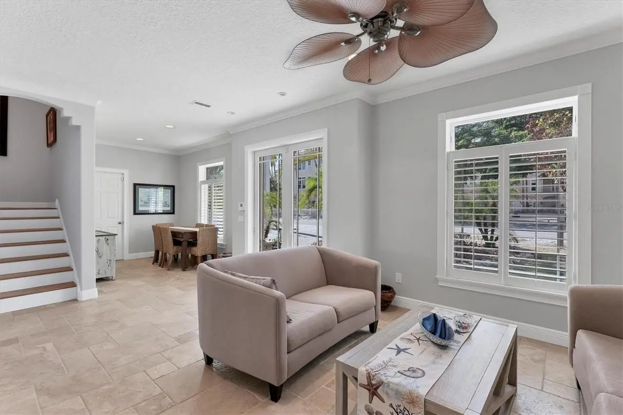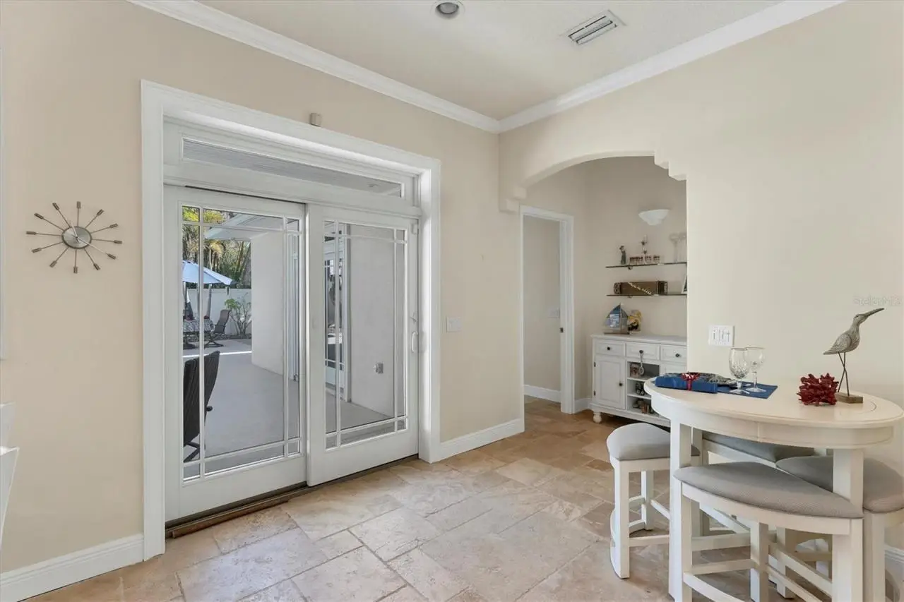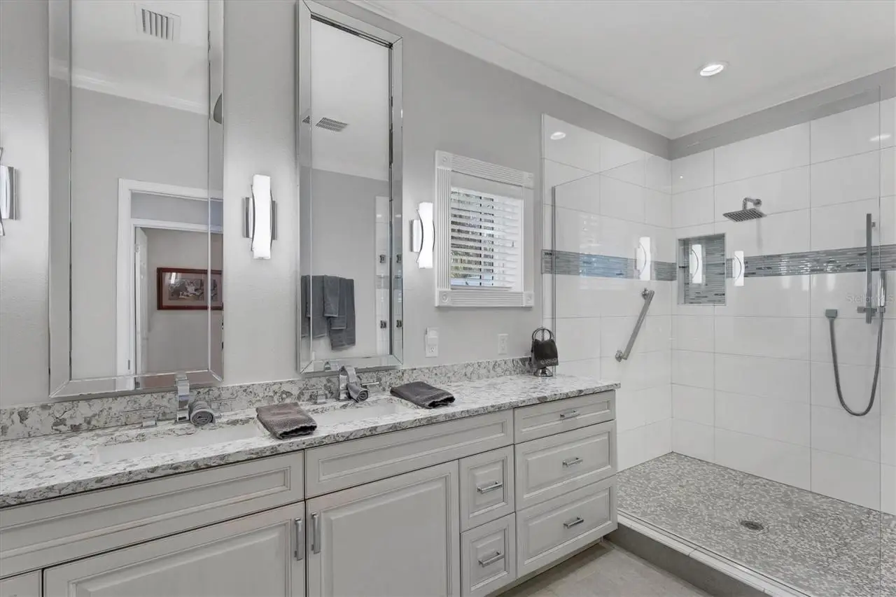 Location, location, location! This beautiful custom home in West Wind Shores is just across the street from the beach and minutes from Anna Maria Island. With an oasis-like backyard and swimming pool, this property offers the ultimate coastal lifestyle. Custom features abound, including high ceilings, arched entryways, travertine flooring, plantation shutters, 5-inch baseboards, recessed lighting, and large walk-in closets. As you enter through the front French doors, you're greeted by a cozy main living area complete with a gas fireplace. To the right, a versatile bonus space awaits, ideal for a dining area or hobby room. The thoughtfully designed split floor plan flows seamlessly, offering two primary bedrooms-one on each floor. The kitchen is a chef's delight, featuring granite countertops, custom cabinetry, newer Bosch appliances, including a Wolf gas stovetop with electric Wolf oven (rare on the island), a breakfast bar with pendant lighting, a glass-tiled backsplash, a wine refrigerator, and elegant travertine flooring. The downstairs primary suite overlooks the pool and offers ample space and luxurious details, including an oversized marble-tiled shower with a glass enclosure, dual sinks, extra storage, and a makeup/dressing table. Upstairs, the second primary suite boasts a large walk-in closet, an ensuite bath, and double doors leading to a loft area with large, picturesque windows that invite you to relax with a book in the afternoon light. The third bedroom is currently being used as an office, complete with built-in bookshelves and a Murphy bed for added flexibility. Sliding glass doors lead to a backyard oasis featuring palm trees, a pergola, a partially covered paver patio, and a completely fenced-in yard. The heated pool and outdoor kitchen, complete with a gas fireplace, create the perfect setting for entertaining. The space is wired for cable, allowing you to enjoy your favorite games while lounging or barbecuing. For pet lovers, there is a separate fenced area and a convenient storage shed. This custom home combines luxury, comfort, and an unbeatable location near the beach and Anna Maria Island. Convenient and complimentary trolley across the street. Walk across the street for sunset every night on the other side of a tall building complex. Don't miss your chance to own this coastal retreat