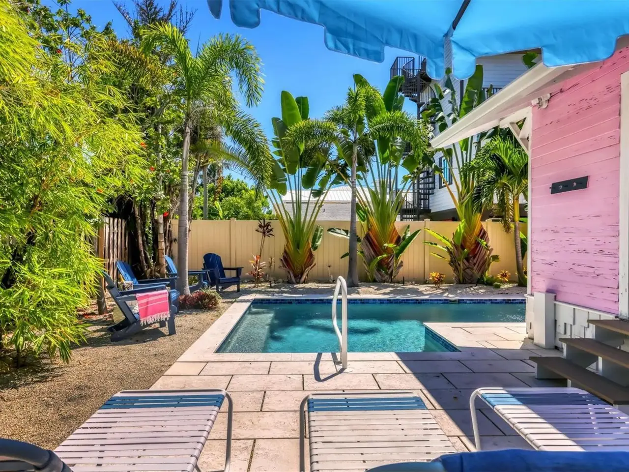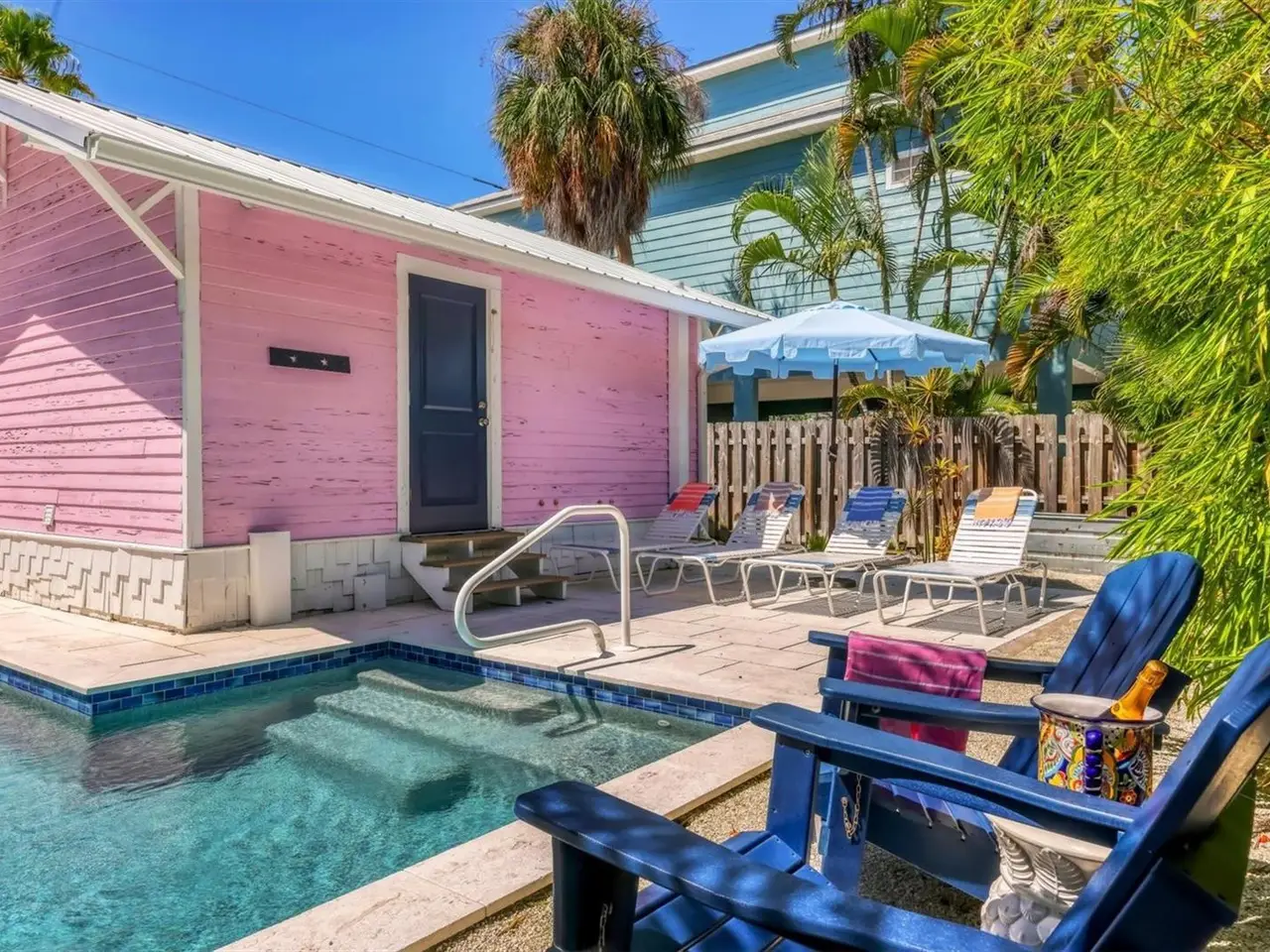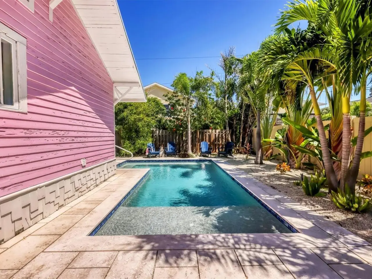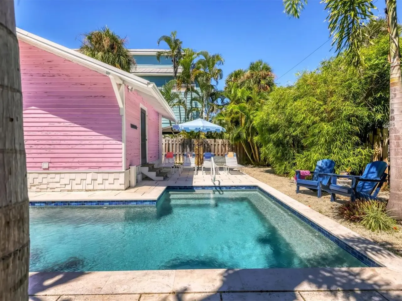 Step onto the spacious screened front porch, now featuring Timber Tech by Azek Porch Collection decking, framed by original Pecky Cypress siding, and enjoy the timeless charm of this lovingly restored 1940s 2 bed / 2 bath craftsman beach cottage just steps from the Gulf. This home blends Old Florida character with today’s comfort. Inside, new shiplap walls pair with Daltile’s Asher Bend luxury vinyl flooring in a herringbone pattern over a brand-new subfloor. This waterproof, scratch resistant surface combines the warmth of wood with the resilient vinyl, perfect for beachside living. The open kitchen boasts custom floor-to-ceiling cabinetry handcrafted in Pennsylvania, a built-in breakfast nook with matching benches, a Café Series appliance package in matte white, brushed bronze hardware, and Carrara. Emporio acrylic solid surface countertops for beauty and practicality. Both bathrooms feature spa-inspired tilework, one with a custom glass shower enclosure. The primary suite opens directly to the pool, while the guest bedroom provides its own private layout. A newly designed laundry suite adds everyday convenience with an Electrolux washer and dryer plus a high built-in countertop for organization. Outdoors, enjoy a fenced backyard oasis with an Agnelli-installed, custom-designed saltwater pool completed in 2022, surrounded by palm-lined landscaping for a private retreat. Behind the scenes are new plumbing and light fixtures throughout, spray foam insulation under the floors, new batt insulation in the walls, and carefully sourced finishes, all completed in 2025. With proven rental income managed by the owner and even stronger potential under professional management, the Pink Palm is an iconic island cottage reimagined for today.