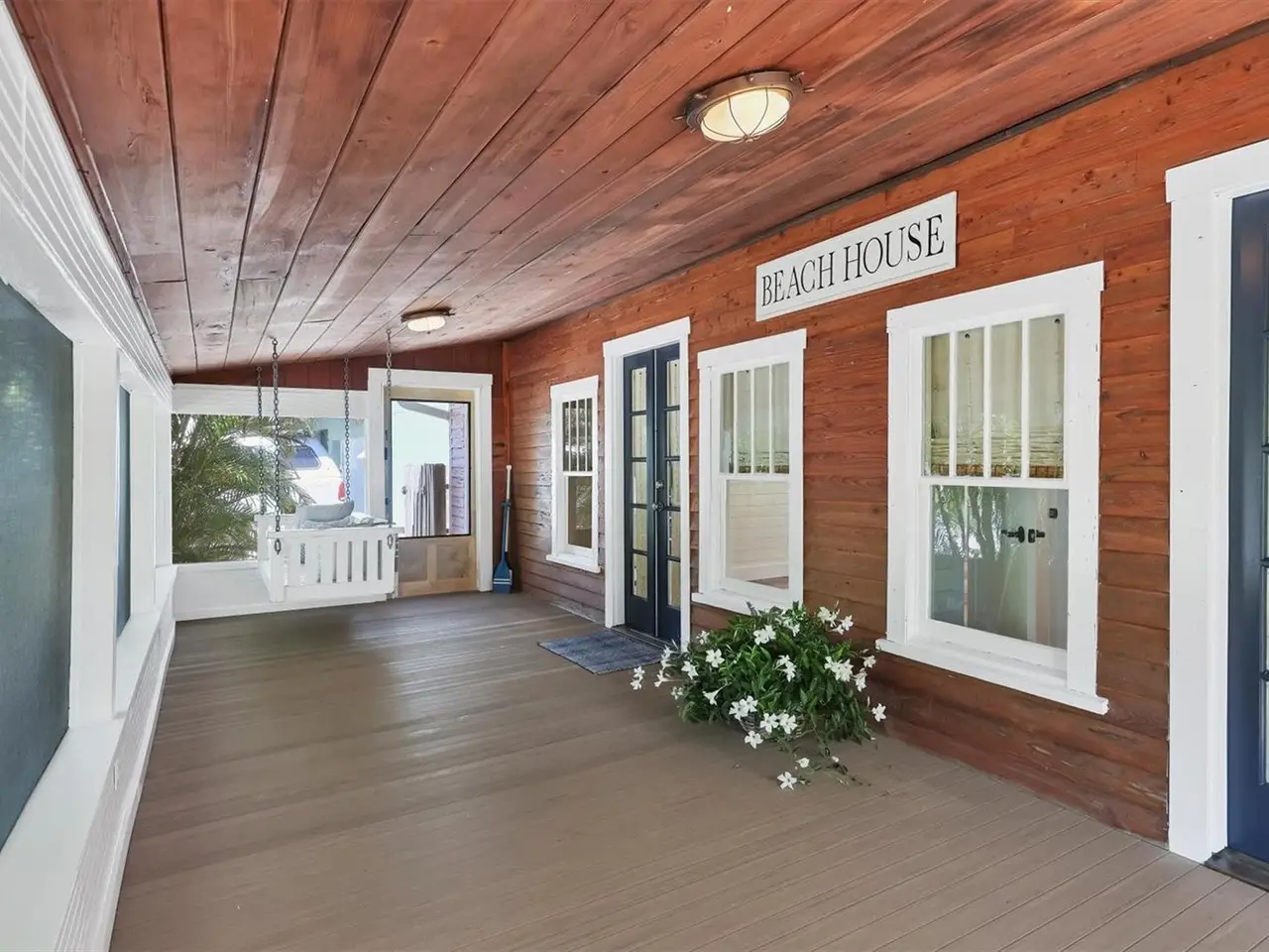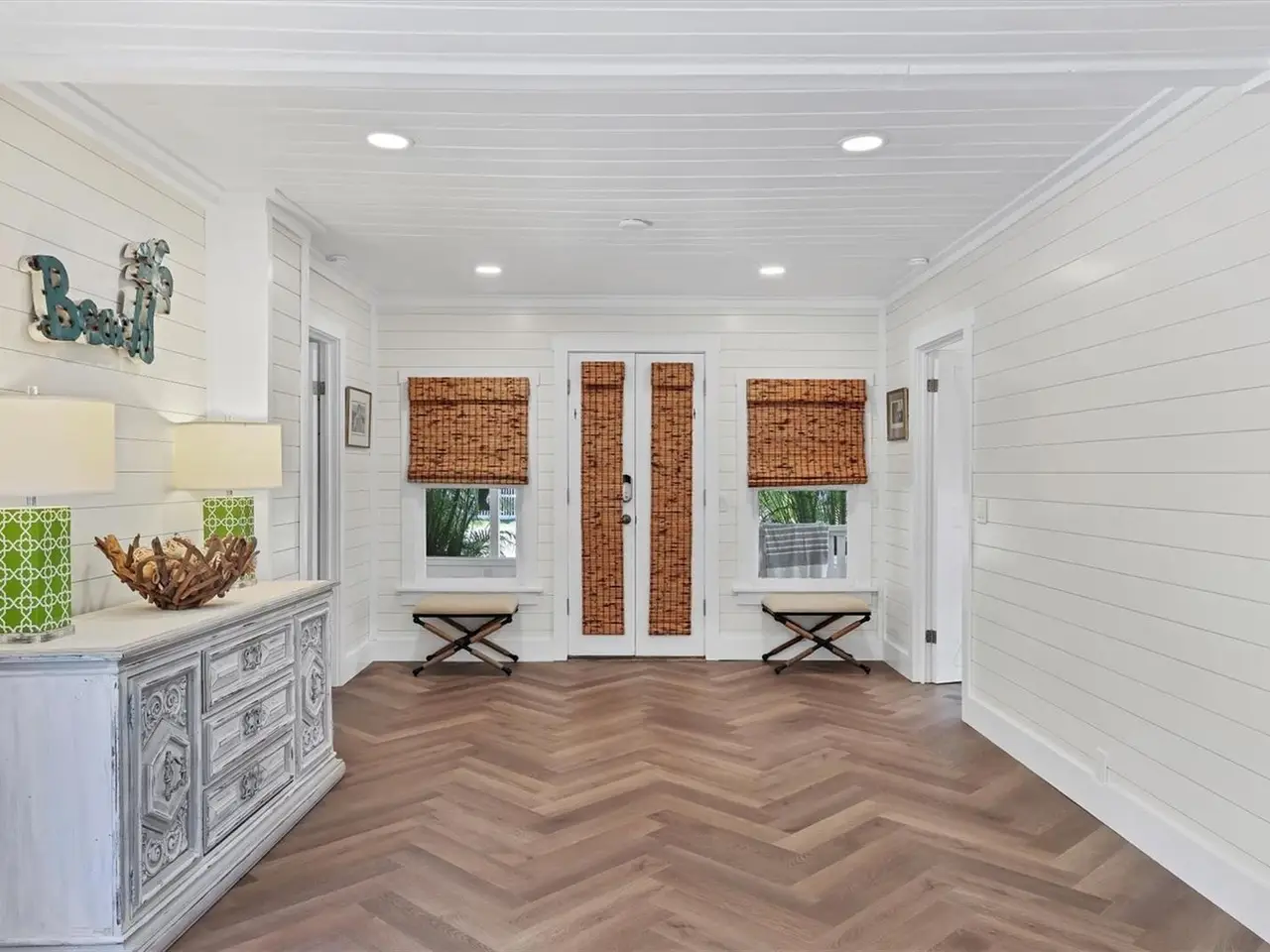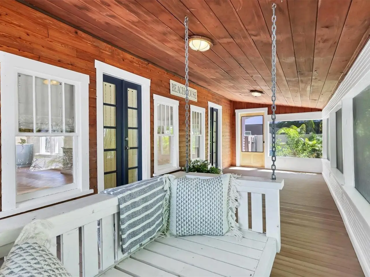 Step onto the spacious screened front porch, now featuring Timber Tech by Azek Porch Collection decking, framed by original Pecky Cypress siding, and enjoy the timeless charm of this lovingly restored 1940s 2 bed / 2 bath craftsman beach cottage just steps from the Gulf. This home blends Old Florida character with today’s comfort. Inside, new shiplap walls pair with Daltile’s Asher Bend luxury vinyl flooring in a herringbone pattern over a brand-new subfloor. This waterproof, scratch resistant surface combines the warmth of wood with the resilient vinyl, perfect for beachside living. The open kitchen boasts custom floor-to-ceiling cabinetry handcrafted in Pennsylvania, a built-in breakfast nook with matching benches, a Café Series appliance package in matte white, brushed bronze hardware, and Carrara. Emporio acrylic solid surface countertops for beauty and practicality. Both bathrooms feature spa-inspired tilework, one with a custom glass shower enclosure. The primary suite opens directly to the pool, while the guest bedroom provides its own private layout. A newly designed laundry suite adds everyday convenience with an Electrolux washer and dryer plus a high built-in countertop for organization. Outdoors, enjoy a fenced backyard oasis with an Agnelli-installed, custom-designed saltwater pool completed in 2022, surrounded by palm-lined landscaping for a private retreat. Behind the scenes are new plumbing and light fixtures throughout, spray foam insulation under the floors, new batt insulation in the walls, and carefully sourced finishes, all completed in 2025. With proven rental income managed by the owner and even stronger potential under professional management, the Pink Palm is an iconic island cottage reimagined for today.