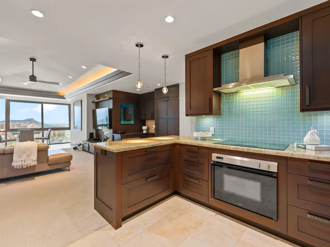 A Rare Opportunity for Elevated Island Living – 44th-Floor Residence in Hawaiki Towers. Experience luxury in this exquisitely renovated 2-bedroom, 2-bathroom residence perched on the 44th floor of the coveted Hawaiki Towers. Expansive floor-to-ceiling windows in living and bedrooms. This stunning home offers panoramic views of Magic Island, Ala Moana Beach Park, sunsets over Diamond Head, and the Koolau slopes. This fully furnished and redesigned (2006/2014) unit offers the perfect blend of luxury, convenience, and breathtaking views. Two secured covered parking stalls and storage, this home provides unbeatable comfort and functionality. Custom high-end finishes, including sapele wood cabinetry, gourmet kitchen, and a primary suite to enhance the refined living experience. Resort-style amenities make this property truly exceptional. The infinity-edge pool & spa offer a perfect place to relax, and the pickleball & tennis courts offer a great way to stay active. Located across from Ala Moana Center and just steps from the beach, this unit provides an unbeatable island lifestyle, where everything you need is right at your doorstep. Se Owner is Licensed HI Realtor