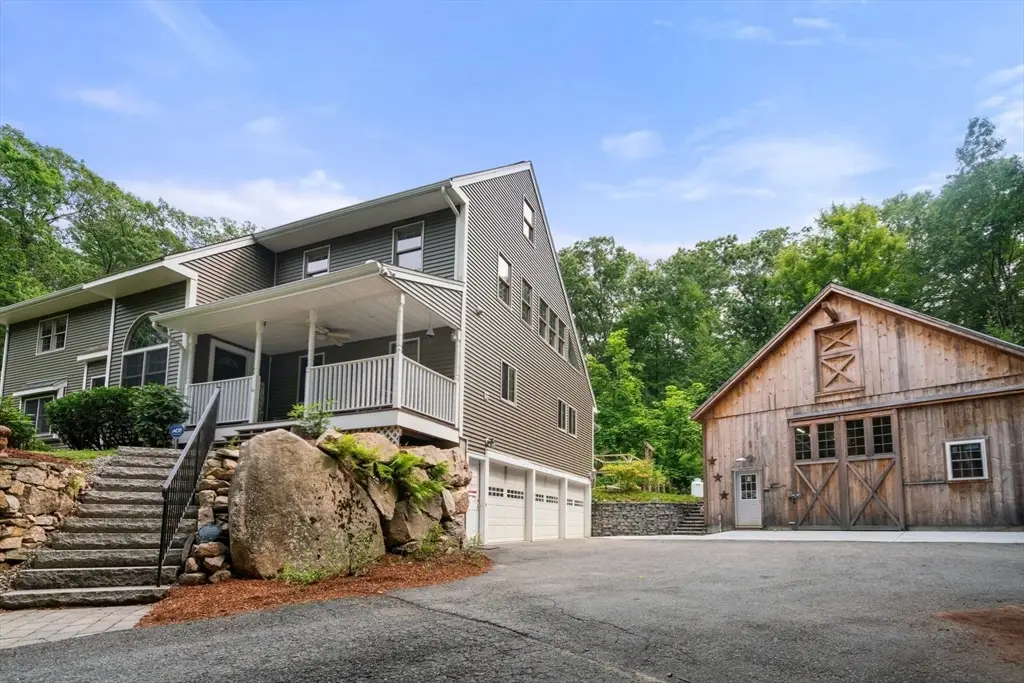Tucked away in a stunning natural setting, steps from trails & Hopkinton State Park, this beautiful sun-splashed home impresses with thoughtful design throughout. The gorgeous chef's kitchen with a fabulous walk-in pantry flows seamlessly into a cathedral-ceiling family room and a spectacular four-season sunroom filled with natural light & picturesque views. Incredible office with built-ins provides the perfect work-from-home setup. The first-floor primary suite has soaring ceilings, walk-in closets, and an enchanting spa-like bath with radiant heat. Upstairs, you'll find a two spacious bedrooms, one with an ensuite bath. A large bonus room, a den/potential fourth bedroom and an additional bath complete this level. This property is an outdoor lover's dream with impressive gardens, mature plantings, chicken coop and a spectacular four-car heated barn with 14-ft ceilings and loft. Enjoy ultimate privacy, yet be just a short walk to the South Boro train, a commuter's dream. Don't miss this one-of-a-kind opportunity!