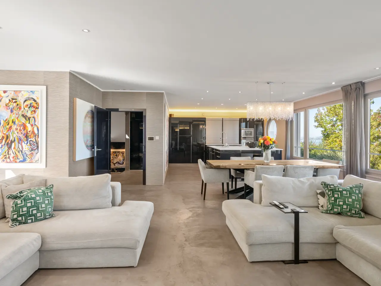 This luxurious 6.5-room semi-detached villa in Horgen combines timeless architecture, state-of-the-art technology, and an incomparable sense of living – featuring breathtaking panoramic views over Lake Zurich and the surrounding mountains. Here, design, privacy, and quality of life come together in perfect harmony – a home for those who appreciate aesthetics, space, and comfort. With a net living space of approximately 292 m² spread across three floors, the home offers room for individuality, comfort, and style. The spacious living and dining area with its fireplace opens harmoniously onto the terrace, creating a seamless transition between indoor and outdoor living. Every detail of this home reflects an uncompromising commitment to quality and design. Premium materials, refined details, and cutting-edge home technology define the concept. Each room has been carefully planned – from the open designer kitchen to the bright bedrooms and the elegantly appointed bathrooms. The interior design combines comfort with understated aesthetics, creating a sense of calm sophistication.