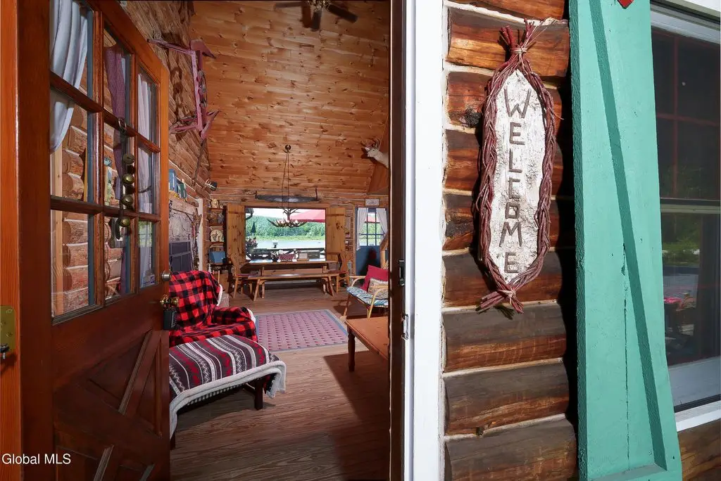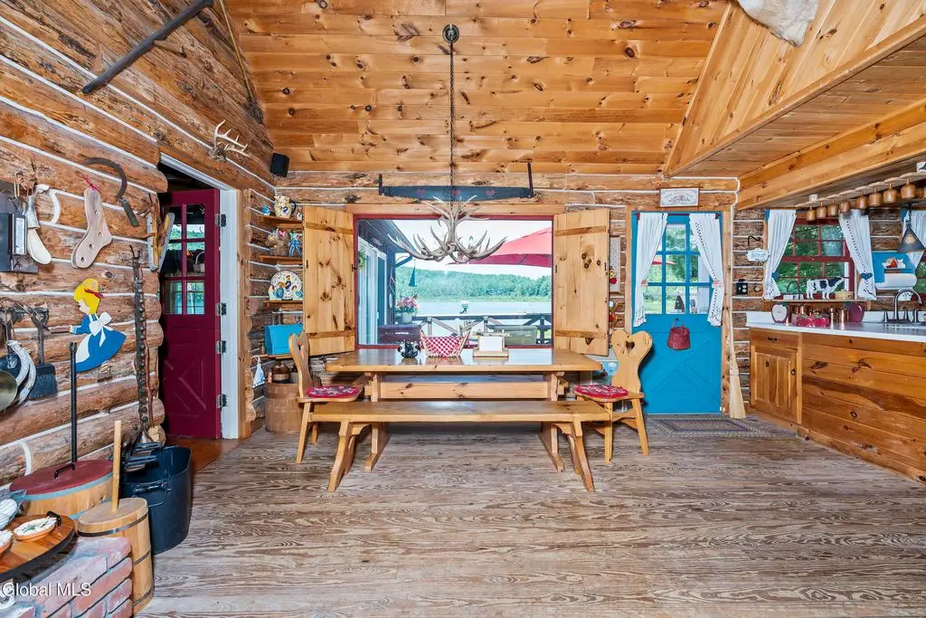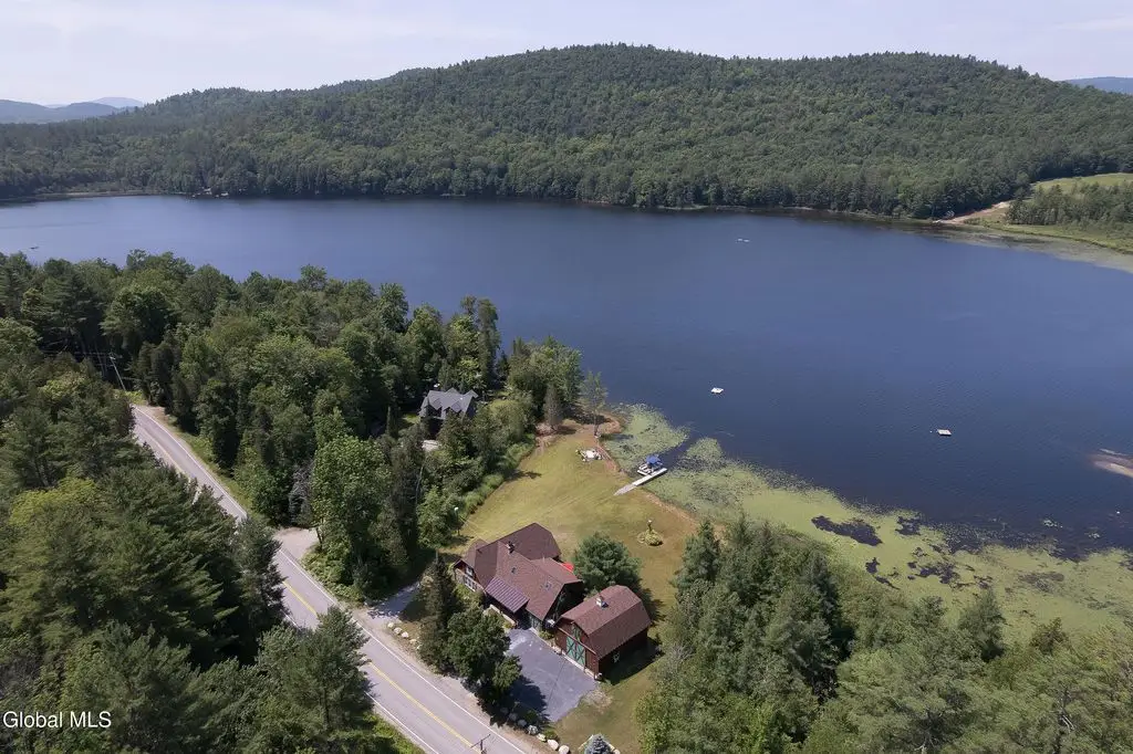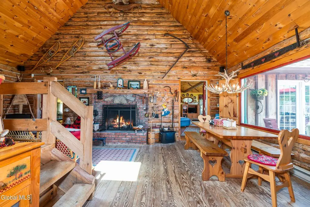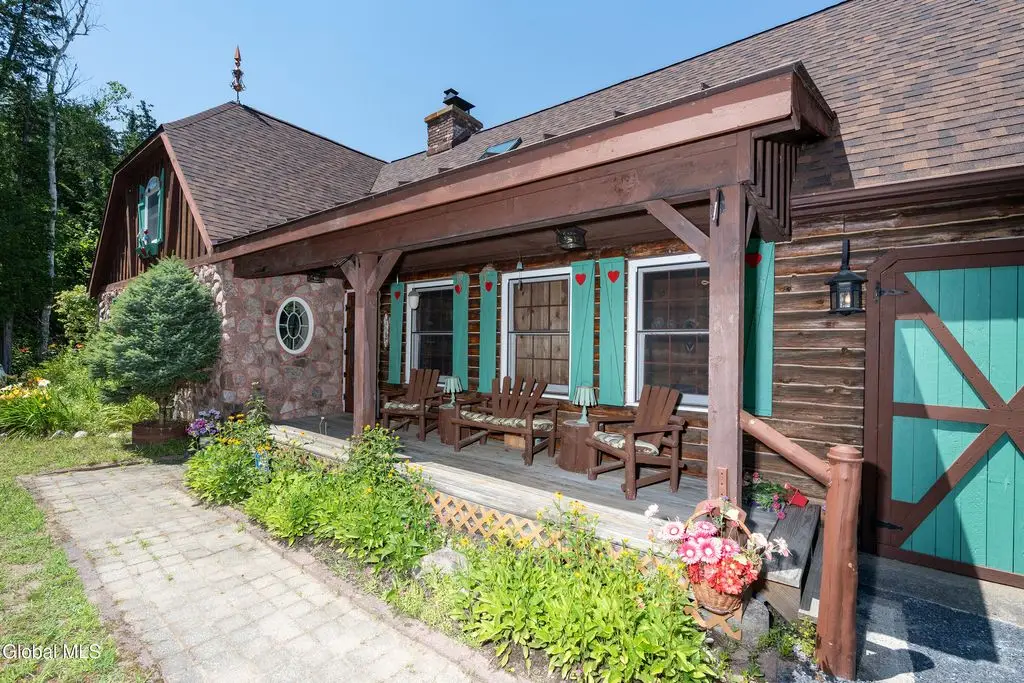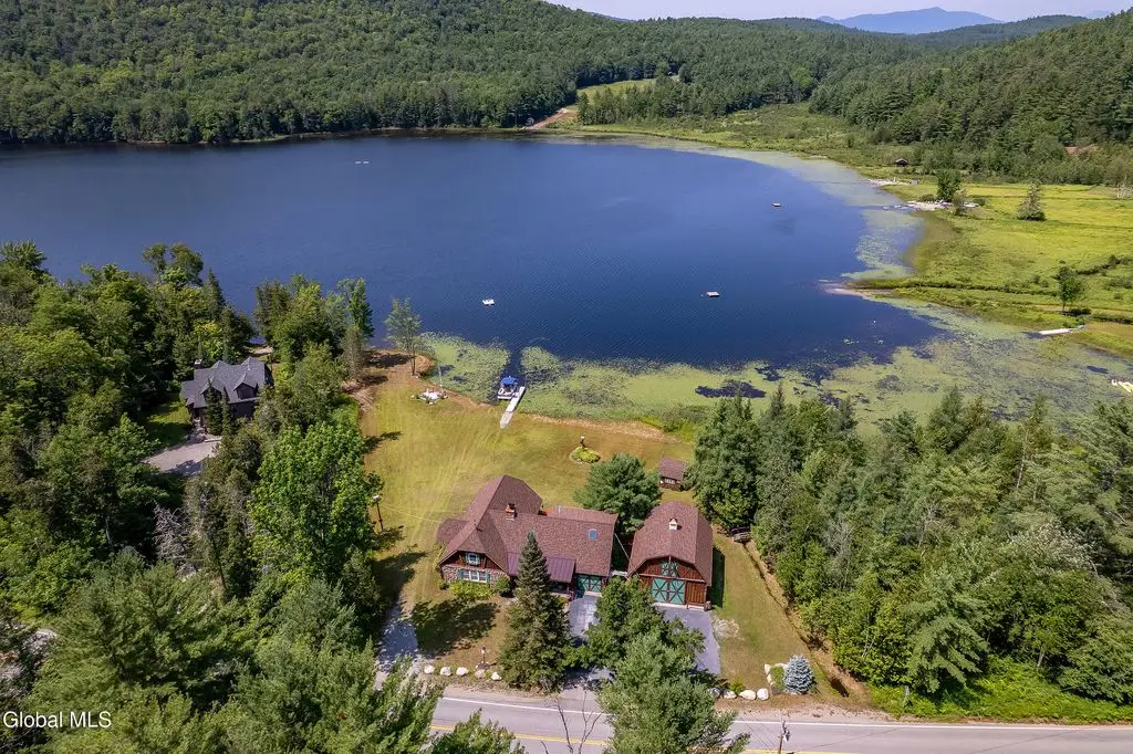 Incredible year-round waterfront home on beautiful and peaceful Valentine Pond, with water views from nearly every room. This 3,267 sq ft. log home, featuring a Bavarian flair, boasts cathedral ceilings, a spacious great room, sleeping lofts, and a cozy family room with a fireplace. The outdoor area is perfect for entertaining, with a deck, a lovely grassy area ideal for lawn games, and just steps from the water and your dock. The huge barn-style garage, with storage above, provides room for storing your boat. Whether you're seeking summertime fun, such as swimming, boating, & fishing, or winter activities like ice skating & ice fishing, this exceptional property offers it all, while being just minutes away from Gore, Lake George, and the Adirondack High Peaks. Make this sanctuary yours!