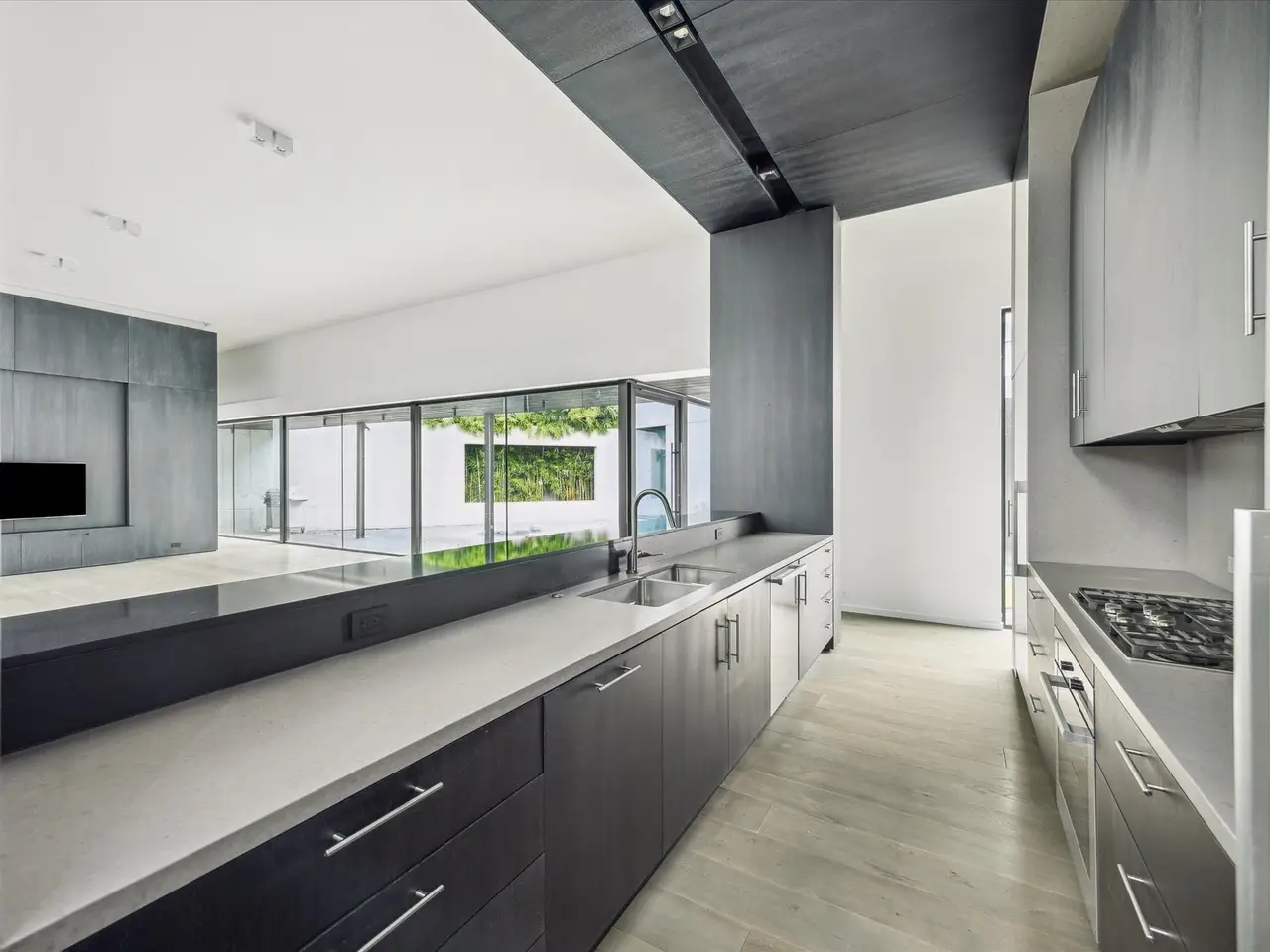 This chic home was created by Robertson Design with clean lines, 14-foot ceilings, an abundance of natural light, open floor plan, and floor-to-ceiling windows with views to a Zen-like courtyard. In addition to a stunning living/dining room the home includes three bedrooms, 3.5 baths, with two primary suites. Both of the primary suites have spa-like bathrooms and large walk-in closets. Additional rooms include an office, gym and a guest bedroom with an en-suite bath. The kitchen has Miele appliances, built-in refrigerator/freezer, with breakfast bar opening to the living area. Other special features include an elevator and a generator. Per Seller.
