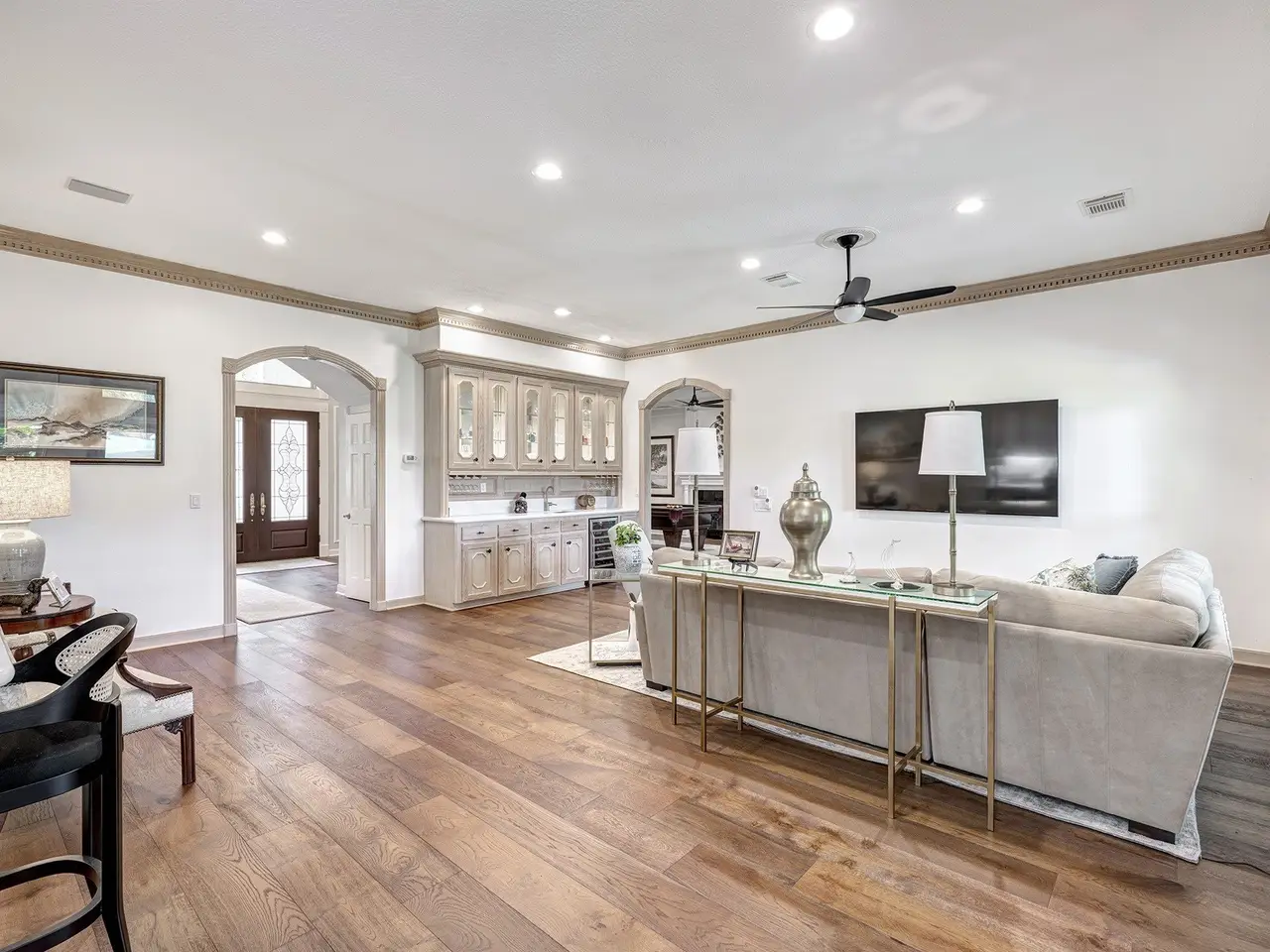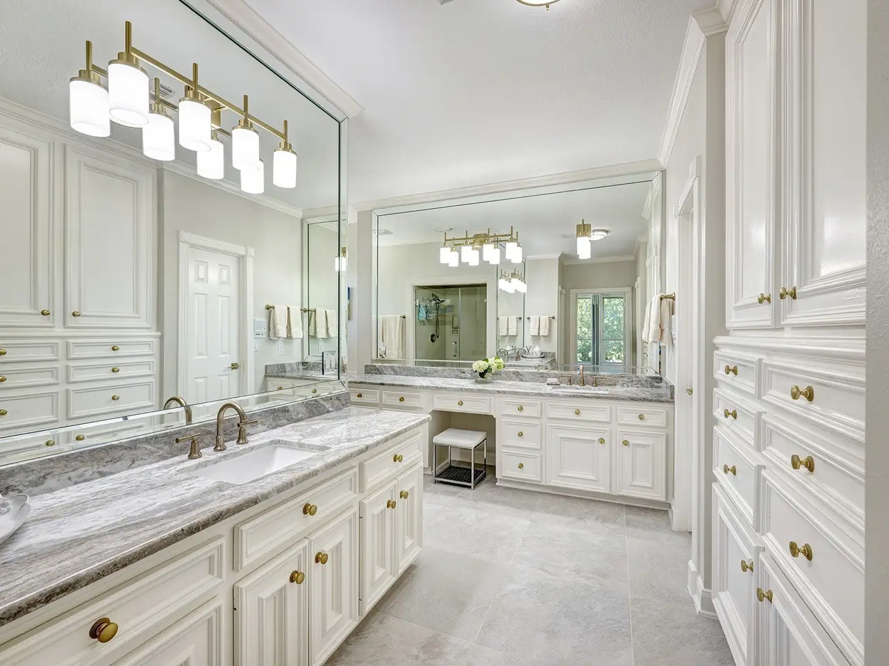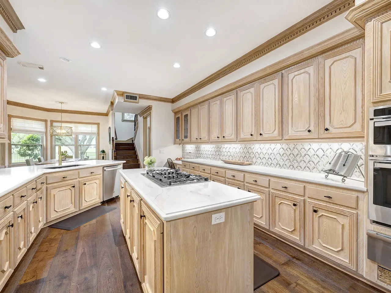 Enjoy gorgeous views of Bay Oaks Golf Course’s 5th hole from this beautifully renovated estate, completed in 2024–2025 with new floors, windows, and updated kitchen and baths. A two-story foyer with winding staircase opens to an office with cathedral ceilings and built-ins, while elegant dentil moldings and fine woodwork add timeless detail. Features include a formal living with fireplace, formal dining with china/crystal storage, oversized den with wet bar overlooking the golf course, and an island kitchen with an ideal layout for entertaining. Upstairs offers a luxurious primary suite with jetted tub and walk-in shower, a gameroom with wet bar and balcony, a second primary suite, and three oversized guest rooms with en-suite or Jack & Jill baths. Outside, a gated motor court leads to a three-car air-conditioned garage with workshop and a pool-sized yard, all within close proximity to the country club, pool, and tennis courts. All info per Seller.
