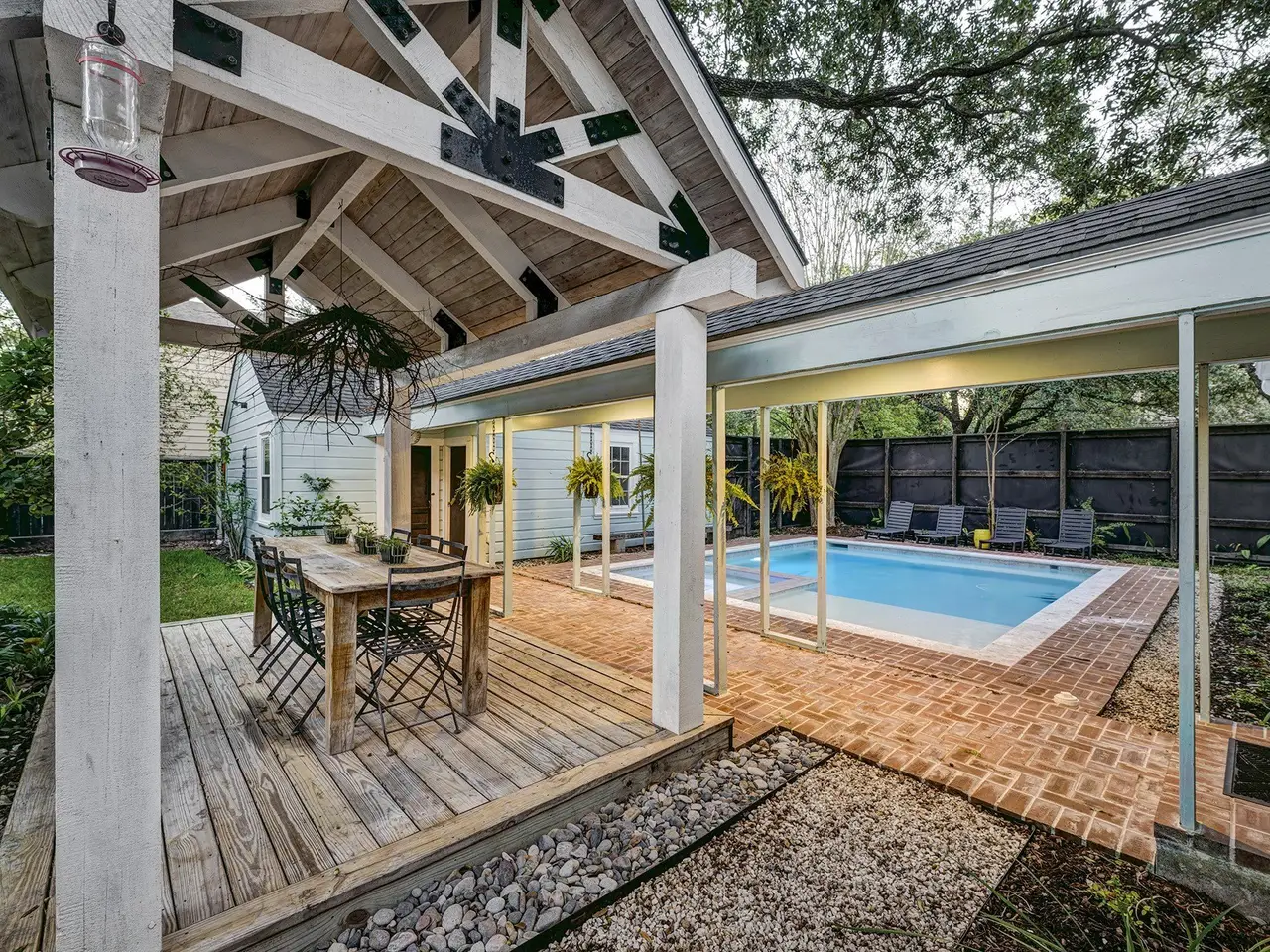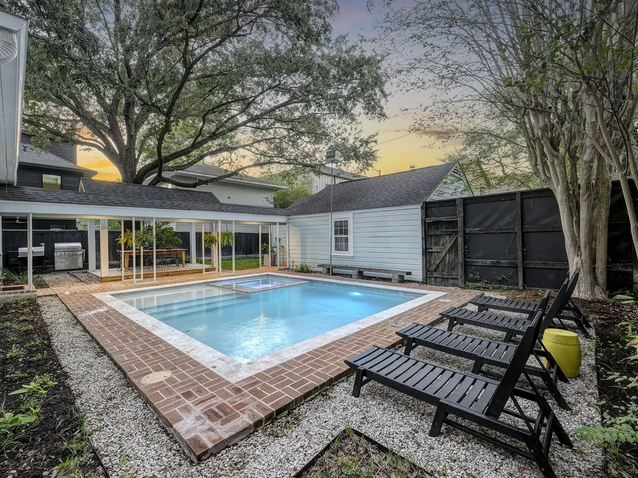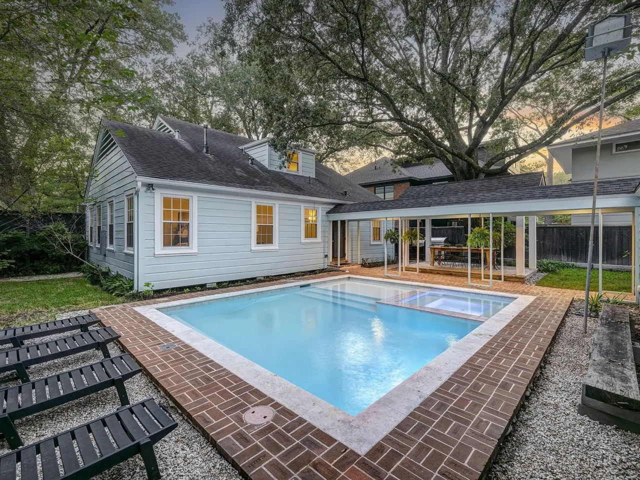Situated on a coveted corner lot in Southampton area, this charming 1941 (HCAD) Federal-style home beautifully blends timeless character with extensive 2017 updates! All mechanical, electrical, and plumbing systems were replaced, along with new Trane HVAC units, PEX plumbing, wiring, roof, & double-pane windows. The gorgeous kitchen features a Wolf range, Sub-Zero refrigerator, Bosch dishwasher, marble backsplash, & honed granite counter—perfect for gathering with family & friends. Enjoy effortless entertaining in the inviting backyard oasis with sparkling pool, hot tub, covered cabana, and gas grill! A first-floor bedroom & full bath offer flexibility for guests plus there is a home office! Original shiplap walls, vintage lighting, & thoughtful updates preserve the home’s warmth & historic charm. Minutes from the Medical Center, Rice University, Rice Village, & Hermann Park Golf Course, this gem combines modern luxury with classic Southampton appeal. Tour it today! All info per Seller