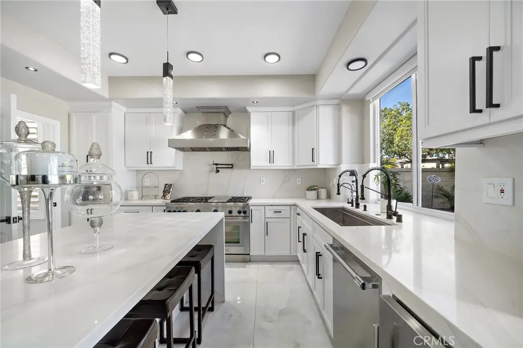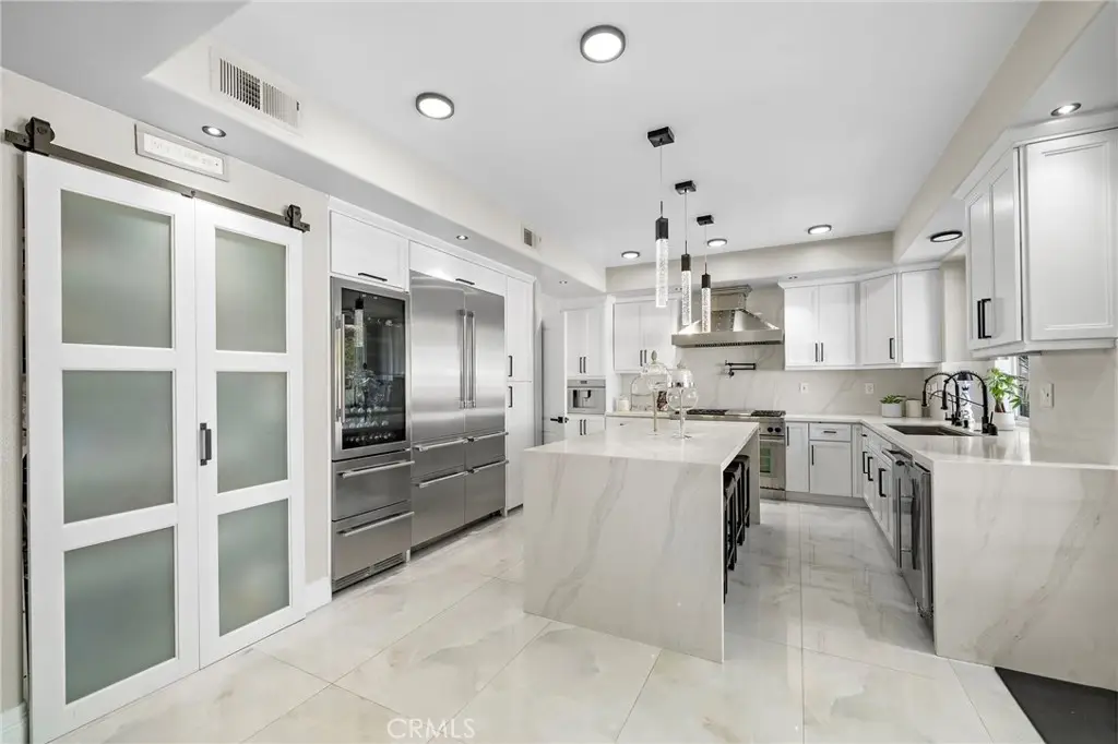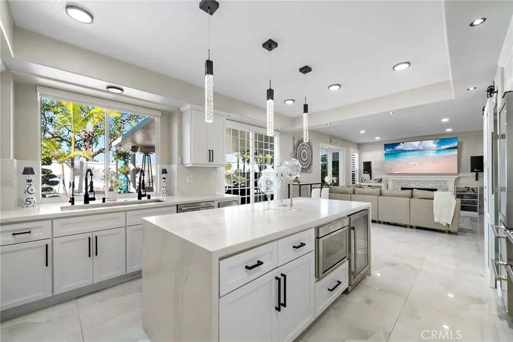 Breathtaking Lyon Shores Estate in the exclusive beach-close community of SeaGate! Rarely available largest model (Residence 3/F) with 5 bedrooms (1 downstairs), 4 baths, 3-car garage, and nearly 3,000 SF of luxurious open-concept living, completely reimagined with no expense spared on top-tier craftsmanship and materials. Architectural excellence begins with the brick-accented flagstone walkway, arched portico, and resort-style balustrade walls. Step inside to soaring two-story ceilings, dramatic palladium windows flooding the home with natural light, Italian porcelain flooring, a grand rotunda foyer with chandelier, sweeping handcrafted staircase, elegant formal living room, and banquet-style dining room. The chef's kitchen is a showpiece with quartz counters and full backsplash, waterfall island with seating, pantry with frosted glass barn door, white shaker self-closing cabinetry with deep drawers/pull-outs, 48-inch double-faucet sink, and professional-grade Thermador professional appliances including 6-burner + griddle/double-oven stove, high-capacity hood/vent, pot filler, dishwasher, microwave, plus 2 Yeego wine/beverage refrigerators, separate icemaker, and built-in coffee maker. The kitchen opens to a family room with custom built-ins, glass-display cabinetry, marble stacked-stone fireplace, and bay window. French doors lead to a backyard oasis with 2 covered patios, flagstone decking, outdoor marble kitchen with Lynx BBQ, koi pond with waterfalls, and lush tropical landscaping. Upstairs includes a built-in desk/vanity, balcony, and 4 more bedrooms (one as a bonus/den). The enormous primary suite boasts a sitting area, 3 walk-in closets, and a spa-inspired bath with wet room shower and freestanding soaking tub, plus dual quartz vanities with vessel sinks. Additional highlights: plantation shutters, recessed lighting, coffered ceiling, chic fixtures, tall raised-panel doors, waterproof wood-vinyl flooring upstairs, frosted-glass barn-style closets, and upgraded bathrooms with designer tile finishes, LED touch-light mirrors, multi-head showers, and frameless clear-glass enclosures. Close to award-winning schools, Seagate Park with walking trails, beach, downtown HB, GW Sports Complex, and Central Park & Library.