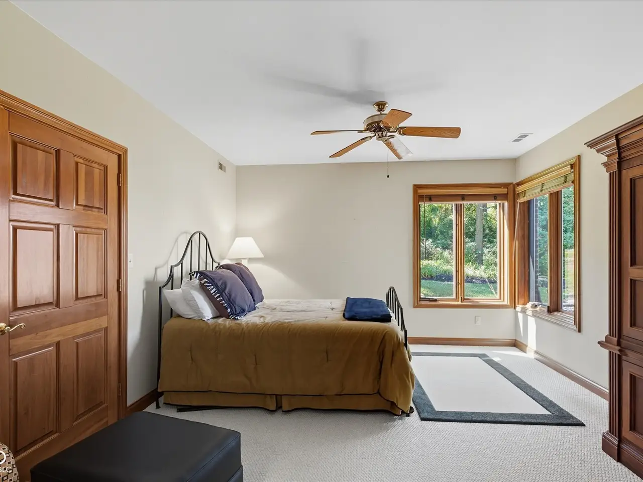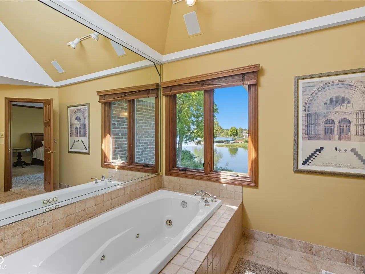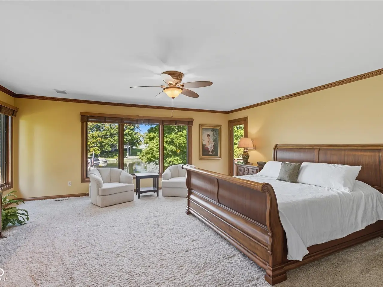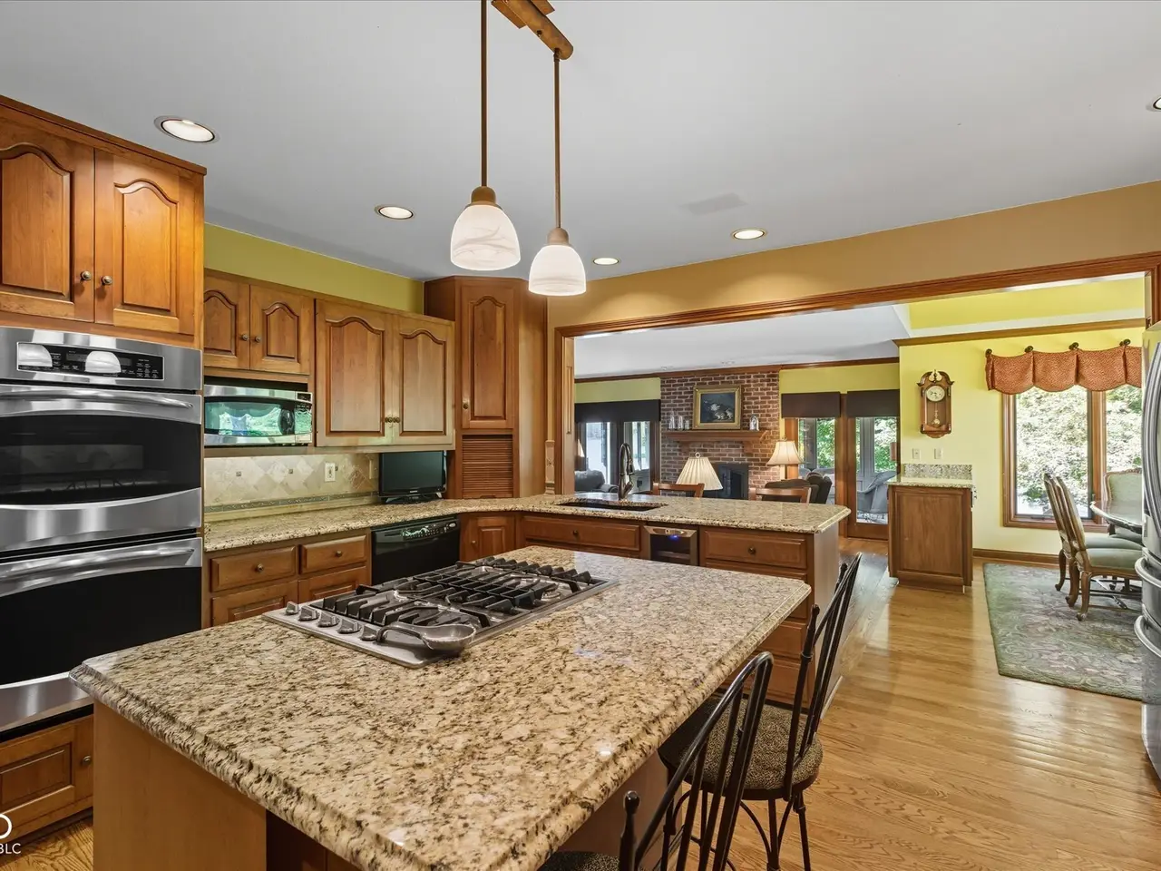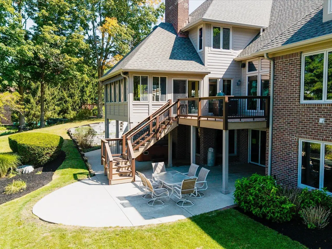 Discover lakeside living at its finest in this stunning 5BR, 4.5BA home with 100' of shoreline on a .40-acre lot with mature trees. This home offers the perfect blend of luxury, comfort, and outdoor entertaining. The main level features rich hardwood floors, a spacious great room with lake views, a formal office with built-ins, and a main-level primary suite with two walk-in closets, luxurious full bath and a door to the main level deck. The gourmet kitchen is equipped with granite countertops, stainless steel appliances, custom cabinetry, a breakfast bar, and a breakfast nook with views of the lake. A hearth room with fireplace, wet bar and door to a 3-season sunroom. The 3-season sunroom offers beautiful lake views and a door to the deck with stairs leading to a large patio-ideal for outdoor dining, music, and sunset views. Upstairs you'll find a private ensuite bedroom and two additional bedrooms connected by a Jack & Jill bath. The walkout lower level lives like a second home with a 5th bedroom, full bath, den, rec. room, wet bar, and family room with fireplace. An unfinished area with double doors to the backyard is perfect for a workshop, storage, or hobbies. Outside, enjoy direct access to the reservoir from your private dock with space for 4-5 boats. Whether you're entertaining guests or enjoying peaceful mornings on the water, this home offers year-round comfort, function, and a true lakeside lifestyle. Updates: Walkout Lower Level 4 Panel Sliding Doors & Adjacent 2 Windows, Double Doors to Storage '25, New roof/gutters/ exterior paint '24, Replaced Deck, Railings, Stairs '21, Garage Doors, Motors & Chains '19, Hardi Board Siding, All West & North Facing Windows '18, Sewage Ejector Pumps '15, Kitchen Counter Tops/Island Counter Top/Nook Counter Top & All Appliances '12, HVAC Units '12.