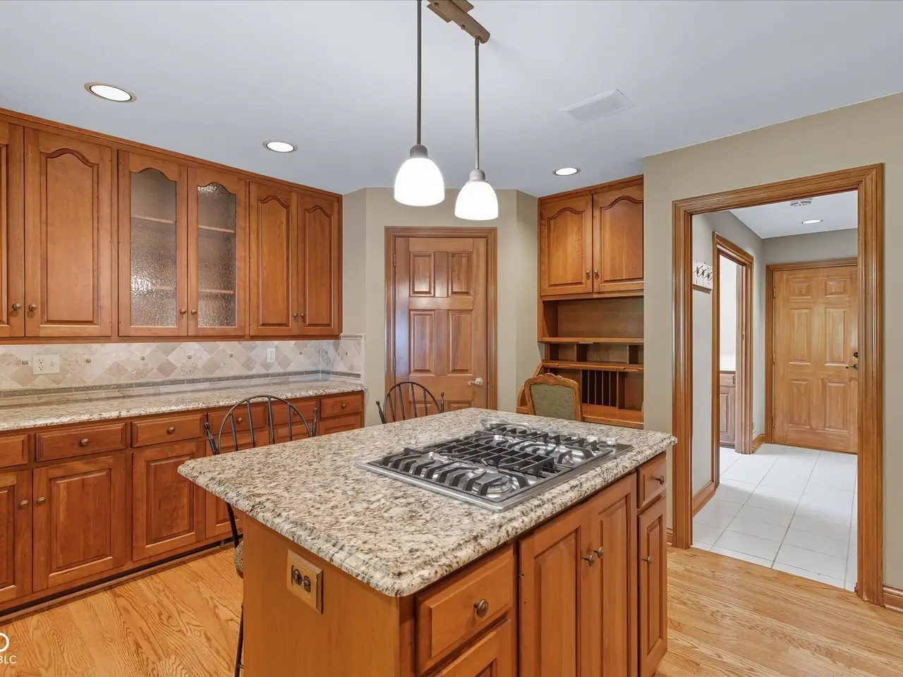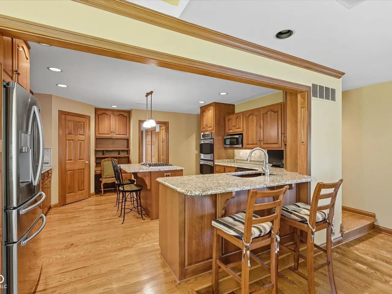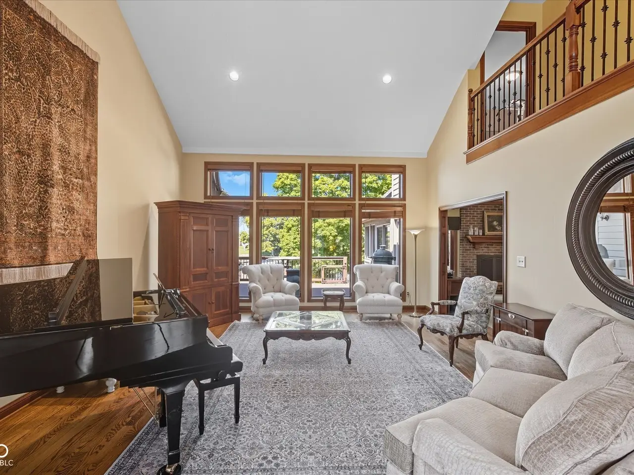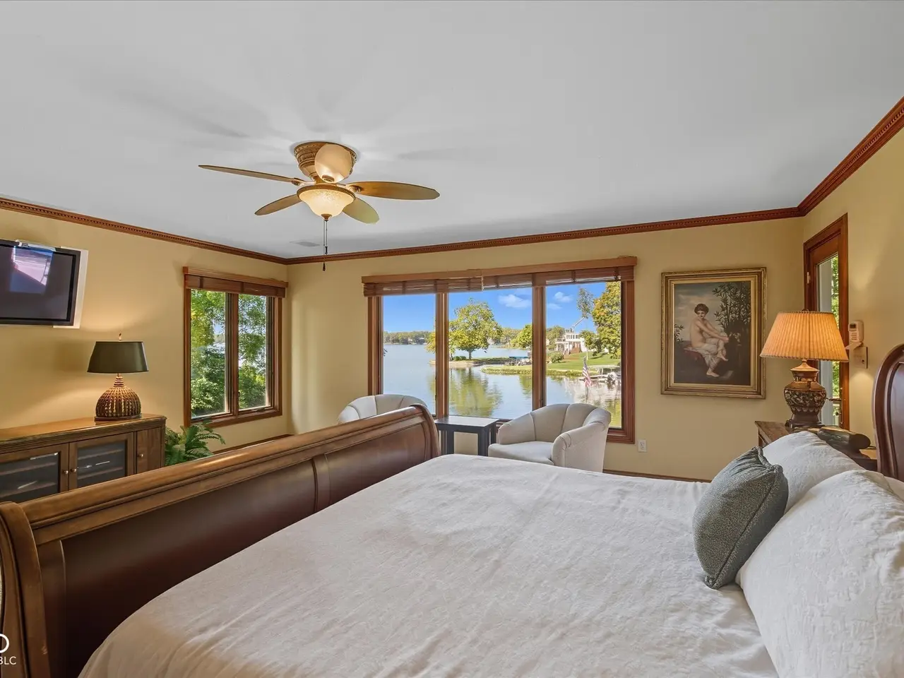 Discover lakeside living at its finest in this stunning 5BR, 4.5BA home with 100' of shoreline on a .40-acre lot with mature trees. This home offers the perfect blend of luxury, comfort, and outdoor entertaining. The main level features rich hardwood floors, a spacious great room with lake views, a formal office with built-ins, and a main-level primary suite with two walk-in closets, luxurious full bath and a door to the main level deck. The gourmet kitchen is equipped with granite countertops, stainless steel appliances, custom cabinetry, a breakfast bar, and a breakfast nook with views of the lake. A hearth room with fireplace, wet bar and door to a 3-season sunroom. The 3-season sunroom offers beautiful lake views and a door to the deck with stairs leading to a large patio-ideal for outdoor dining, music, and sunset views. Upstairs you'll find a private ensuite bedroom and two additional bedrooms connected by a Jack & Jill bath. The walkout lower level lives like a second home with a 5th bedroom, full bath, den, rec. room, wet bar, and family room with fireplace. An unfinished area with double doors to the backyard is perfect for a workshop, storage, or hobbies. Outside, enjoy direct access to the reservoir from your private dock with space for 4-5 boats. Whether you're entertaining guests or enjoying peaceful mornings on the water, this home offers year-round comfort, function, and a true lakeside lifestyle. Updates: Walkout Lower Level 4 Panel Sliding Doors & Adjacent 2 Windows, Double Doors to Storage '25, New roof/gutters/ exterior paint '24, Replaced Deck, Railings, Stairs '21, Garage Doors, Motors & Chains '19, Hardi Board Siding, All West & North Facing Windows '18, Sewage Ejector Pumps '15, Kitchen Counter Tops/Island Counter Top/Nook Counter Top & All Appliances '12, HVAC Units '12.