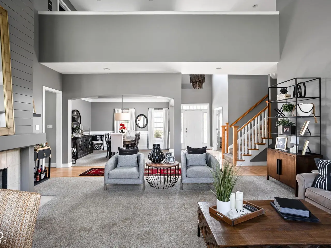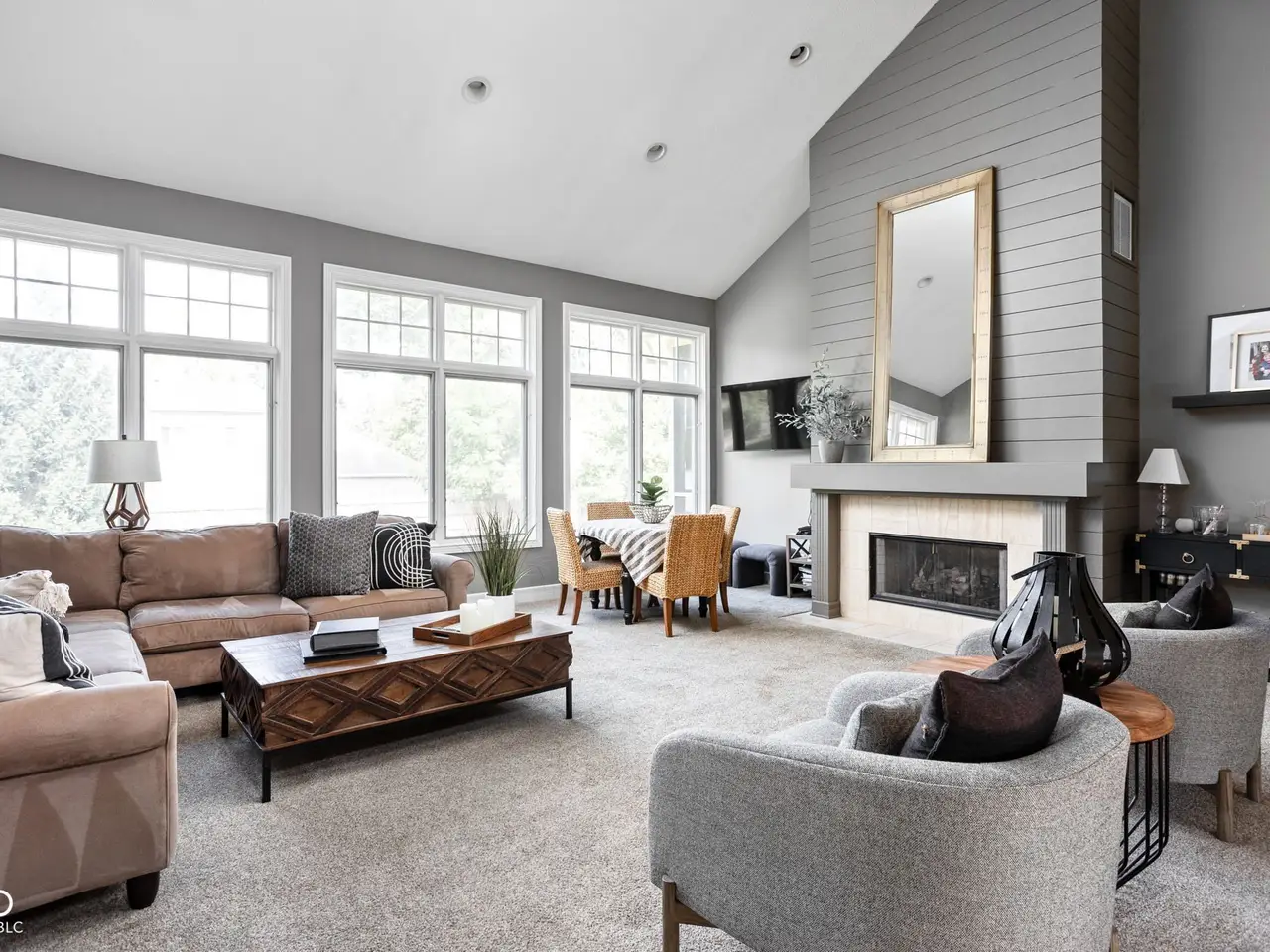 Vaulted great room with two-sided fireplace