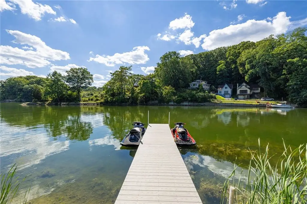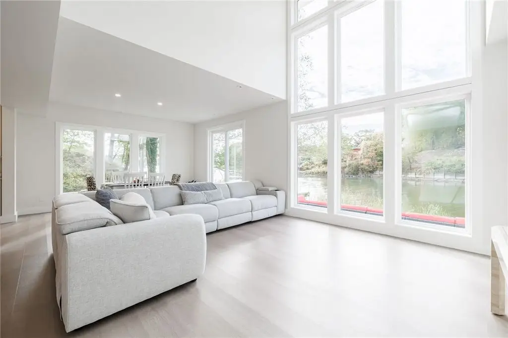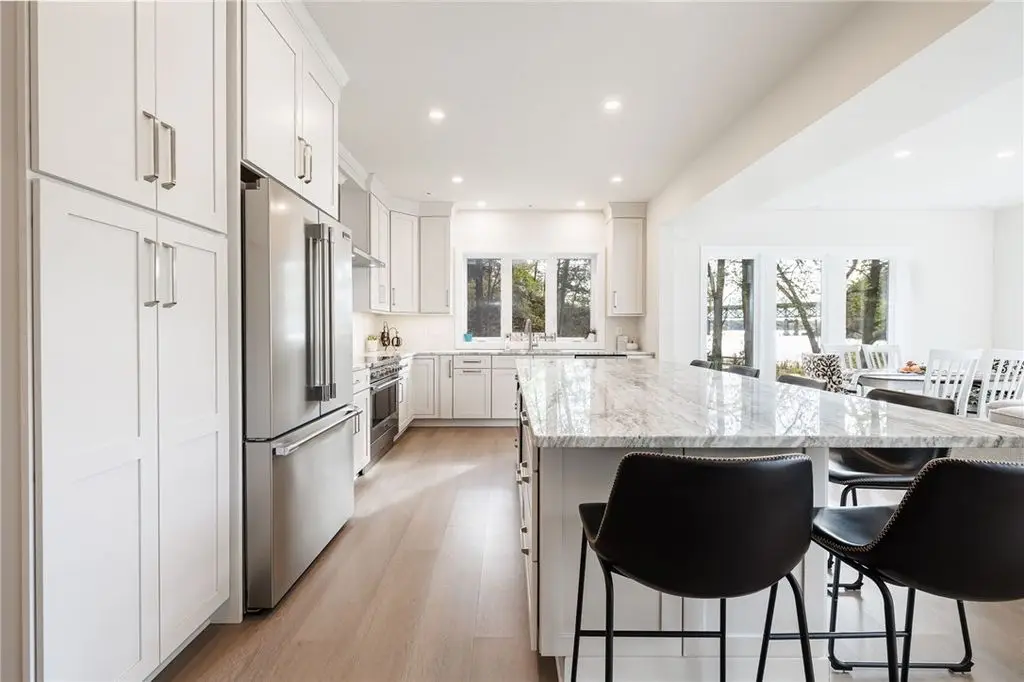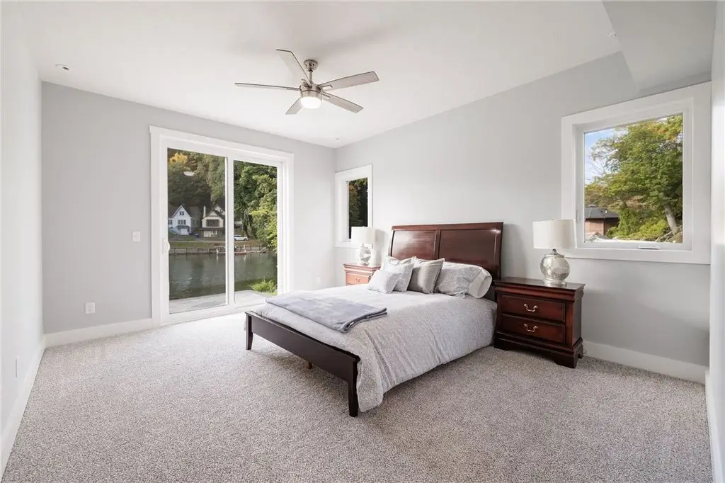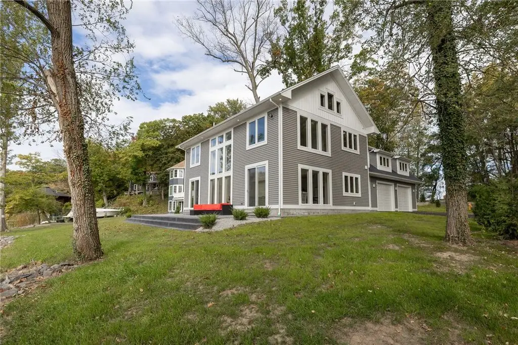 Embrace the ultimate waterfront lifestyle in this exceptional, newly constructed home on Irondequoit Bay, offering 110 feet of pristine, usable bay frontage and a private dock - your gateway to the water awaits. This 3,000+ sq. ft. residence is a masterpiece of modern design, with every detail carefully crafted for luxury living. Set on a private, plot with sweeping bay views, this stunning 4-bedroom, 5-bathroom home is the epitome of sophistication. The spacious interior is filled with natural light, thanks to an abundance of windows that highlight the gorgeous waterfront setting. Upon entering, you are greeted by a foyer that flows into the open-concept living and dining areas, perfect for both relaxation and entertaining. The gourmet kitchen is a chef's dream, featuring new stainless steel appliances, a 10'x5' island, custom granite counters, a push-button drawer microwave, a custom hood vent, double sink, and soft-close cabinetry - ideal for seamless everyday living and hosting guests. LED lighting throughout further enhances the home's bright and welcoming atmosphere. The first-floor primary suite is a serene retreat, complete with a luxurious en-suite bath offering a soaking tub, walk-in shower, and a generous walk-in closet. Upstairs, you'll find three additional well-sized bedrooms all with bathrooms and a thoughtfully designed laundry room. The attached garage is expansive, providing ample space for two vehicles along with additional room for storage or a workshop. The private, landscaped backyard features a stamped concrete patio, the perfect setting for relaxing and entertaining while enjoying stunning views of the water and surrounding nature. This home is not in a flood zone, providing peace of mind. Safety features include hard-wired smoke detectors and carbon monoxide monitors. The high-efficiency HVAC system ensures year-round comfort, no matter the season. Schedule your private showing today Open Thursday, October 23rd from 5:00-7:00pm and Saturday, October 25th from 12n to 1:30pm Delayed Showings Until October 21st at 9am. Delayed Negotiations until October 31st at 12:00pm.