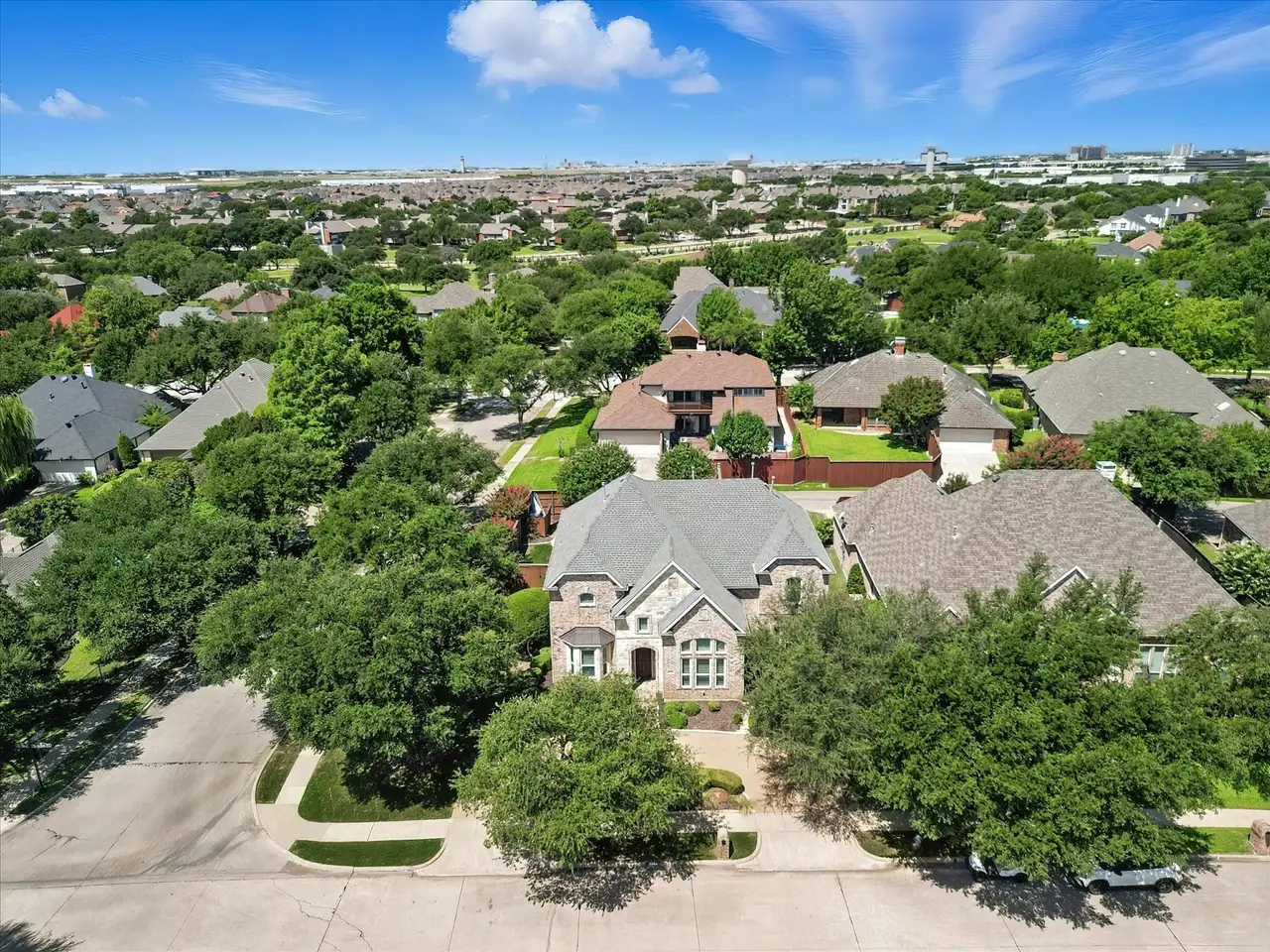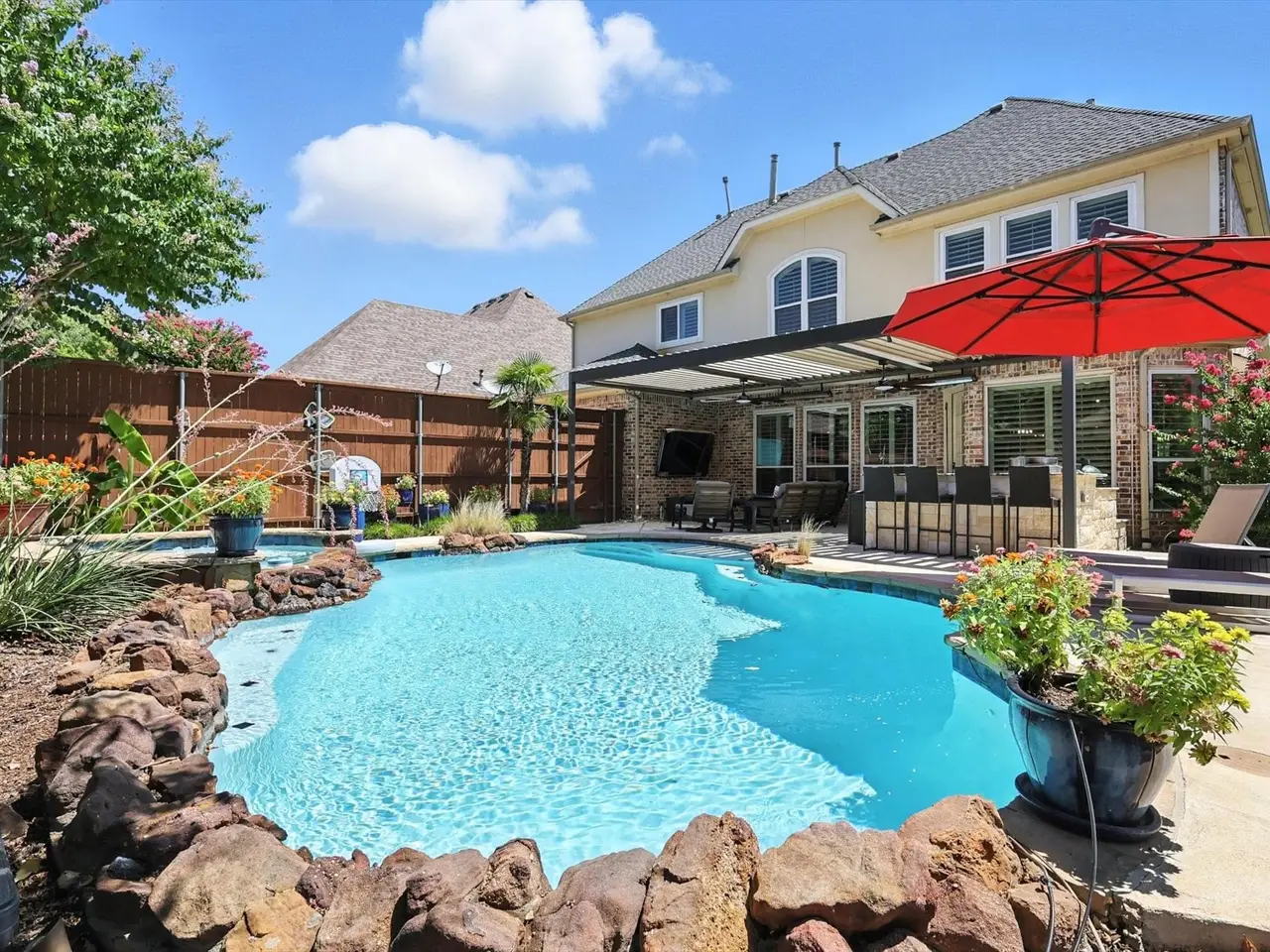 Welcome to 2354 Clearspring Drive N, located in the highly sought-after gated community of Hackberry Creek. This beautifully updated 4 bed, 3 bath home sits on a premium corner lot with circle drive, striking brick and stone exterior, and lush, professional landscaping. Step inside to a light-filled foyer that offers a direct view to the backyard retreat. The formal dining room, wrapped in custom wallpaper, complements a front flex room currently styled as a wine lounge, with views into the kitchen and front yard. The chefs kitchen features custom cabinetry, a large quartz island with bar seating, marble backsplash, stainless steel appliances, and designer lighting - all flowing seamlessly into the living and breakfast areas with backyard views. The living room centers around a custom gas fireplace with built-in shelving. A private guest suite and remodeled full bath are located downstairs. Upstairs, the spacious primary suite overlooks the pool and boasts a spa-like bath with slate floors, rain shower, jetted tub, dual vanities, and walk-in closet. Two additional bedrooms, a shared bath with separate vanities, and a game room with built-ins complete the second level. The outdoor space is a true retreat, featuring a built-in kitchen with granite counters, bar seating, propane grill, refrigerator, and drawers. A custom motorized louvered pergola with dual ceiling fans and heaters offers adjustable shade and comfort year-round. The resurfaced, heated pool with spa and water feature is bordered by flagstone and Carvestone decking - perfect for entertaining. Additional highlights include an oversized garage with epoxy flooring and bonus storage, plantation shutters throughout, and a downstairs utility room with sink. Hackberry Creek offers three private parks, neighborhood events, and quick access to Hwy's 114, 635, and 161. The community is also within Coppell ISDs limited open enrollment program. Refined, functional, and move-in readythis home is not to be missed!