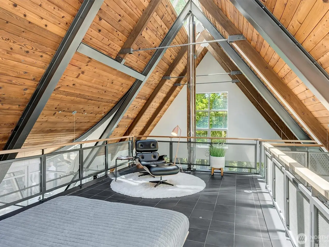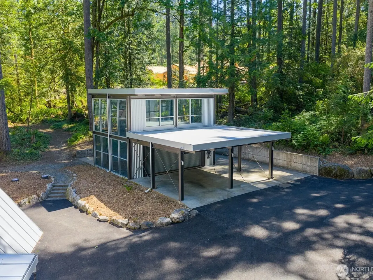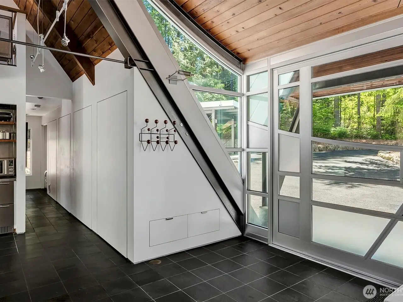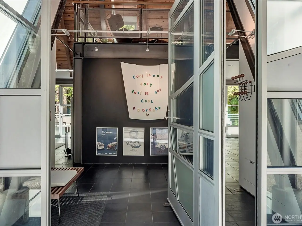 A dramatic steel-and-glass A-frame designed by renowned Sandler-Kilburn Architects, this awe-inspiring home is a bold expression of modern design set on over an acre of serene, wooded landscape. Striking and sophisticated, the home blends industrial elements with the warmth of natural materials. Inside, custom walnut cabinetry frames a sleek, contemporary kitchen with new cabinetry & refrigeration, while a Tulikivi soapstone fireplace anchors the living space with sculptural elegance. The primary suite offers a luxurious escape, featuring a stainless steel Japanese soaking tub for ultimate relaxation. A detached steel-and-glass garage or studio includes a separate meter. 3 heat sources and covered parking for 4 cars. Skylights and EV charger!
