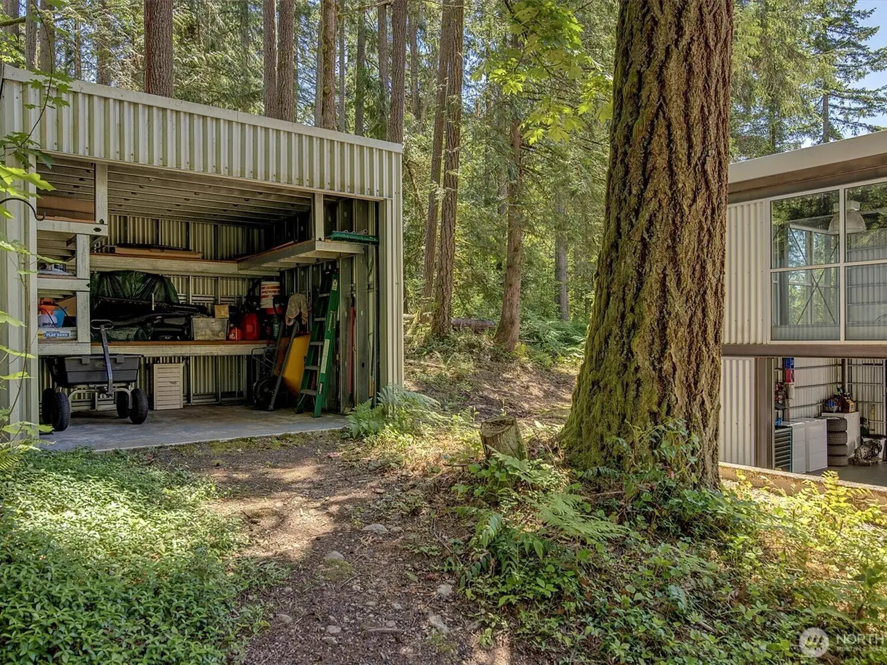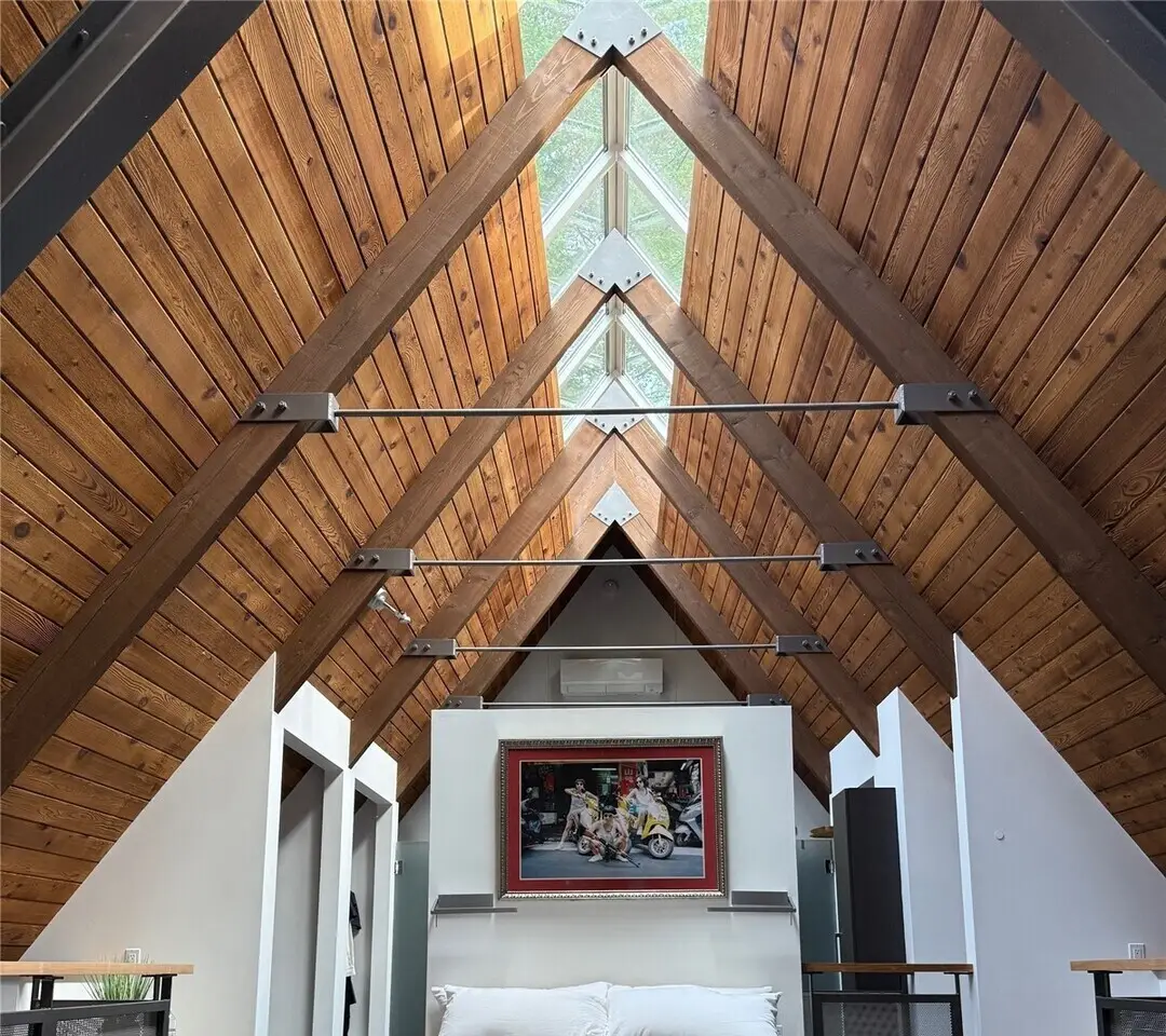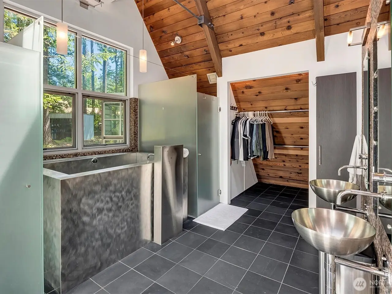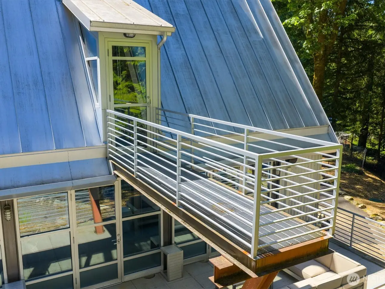 A dramatic steel-and-glass A-frame designed by renowned Sandler-Kilburn Architects, this awe-inspiring home is a bold expression of modern design set on over an acre of serene, wooded landscape. Striking and sophisticated, the home blends industrial elements with the warmth of natural materials. Inside, custom walnut cabinetry frames a sleek, contemporary kitchen with new cabinetry & refrigeration, while a Tulikivi soapstone fireplace anchors the living space with sculptural elegance. The primary suite offers a luxurious escape, featuring a stainless steel Japanese soaking tub for ultimate relaxation. A detached steel-and-glass garage or studio includes a separate meter. 3 heat sources and covered parking for 4 cars. Skylights and EV charger!