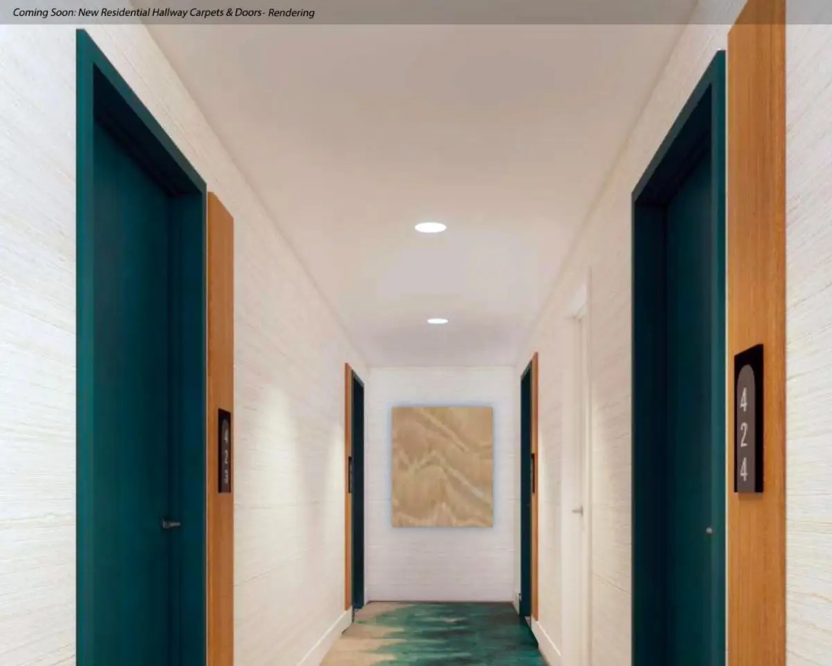 Landscaped rooftop with pool, hot tub, fitness center