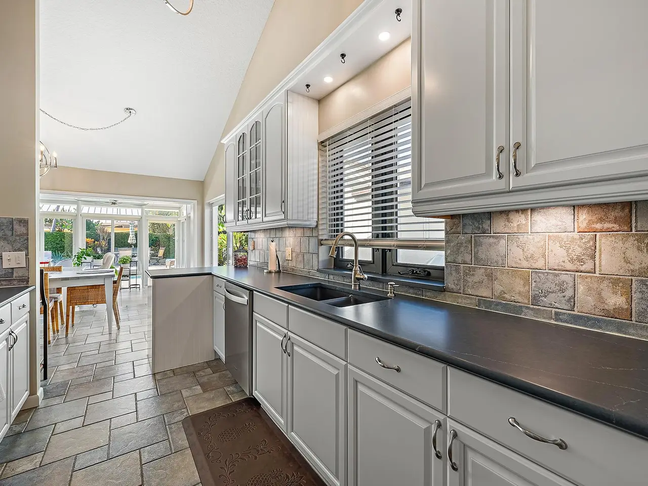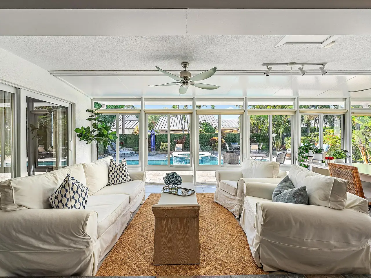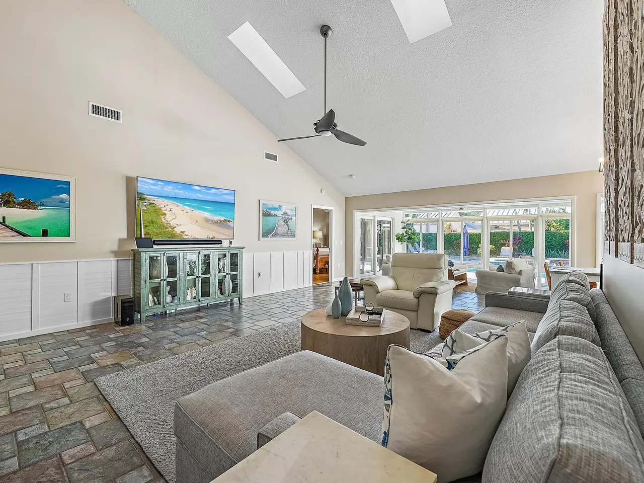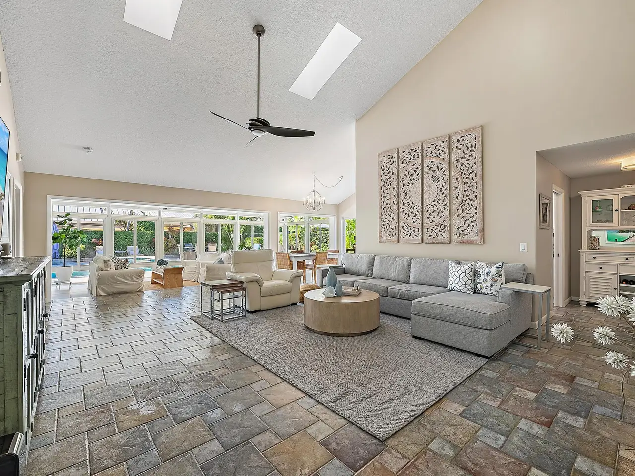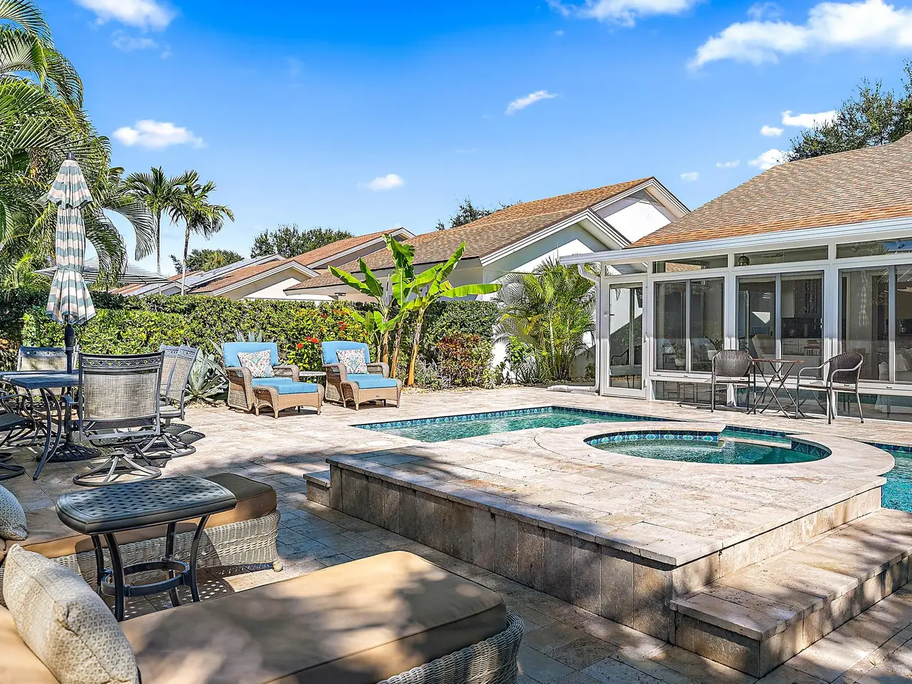 Nestled in the desirable coastal community of The Ridge at the Bluffs, this beautifully updated three-bedroom, two-bath home combines relaxed Florida living with timeless comfort and style. The light-filled, open floor plan showcases vaulted ceilings and spacious living areas that flow seamlessly to the gorgeous pool and patio area, creating an effortless indoor-outdoor lifestyle. The kitchen features stainless steel appliances, white cabinetry, and a breakfast area overlooking the pool - perfect for entertaining. The adjoining great room offers volume ceilings, a neutral palette, and expansive space that opens to the sunroom and outdoor living area. A versatile Florida room, framed in glass, serves as a bright second lounge or home office, blending indoor comfort with poolside views. The primary suite provides a tranquil retreat with wood flooring, generous closet space, and a fully remodeled spa bath featuring dual vanities, marble-style tile, and a frameless glass shower. Guest accommodations include two inviting bedrooms, one a loft-style suite with soaring ceilings, ideal for family, guests or a work-from-home setup. Additional highlights include a newly renovated guest bath, a dedicated laundry room with custom cabinetry, and an attached two-car garage. Step outside to enjoy the heated saltwater pool and spa, surrounded by tropical landscaping and travertine decking a private oasis designed for year-round enjoyment. Residents of The Ridge at the Bluffs enjoy resort-style amenities including a heated community pool, tennis and pickleball courts, basketball courts, and a clubhouse all within close proximity to the home. Ideally located just minutes from Juno Beach, Pelican Lake, premier golf clubs, and fine dining, this home embodies the very best of coastal living in one of Jupiter's most sought-after enclaves.