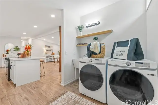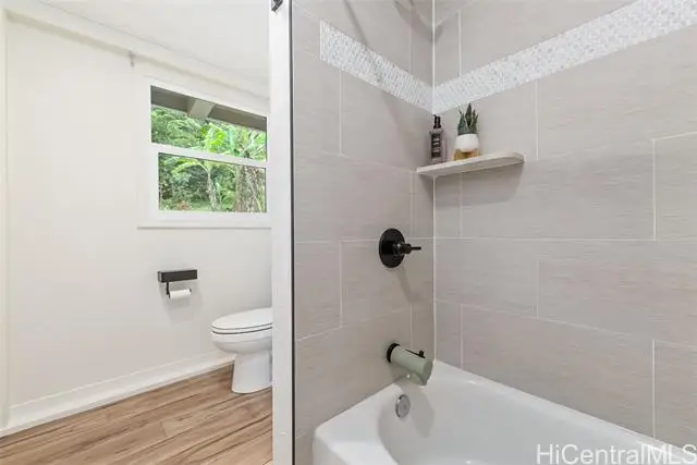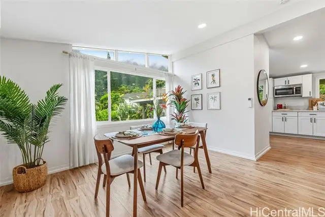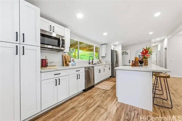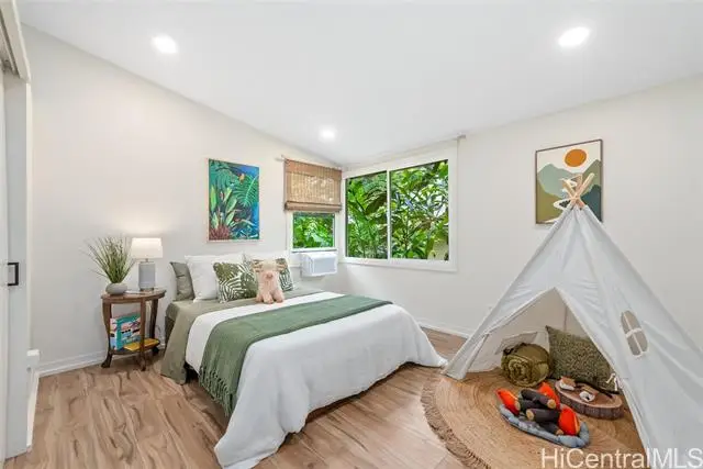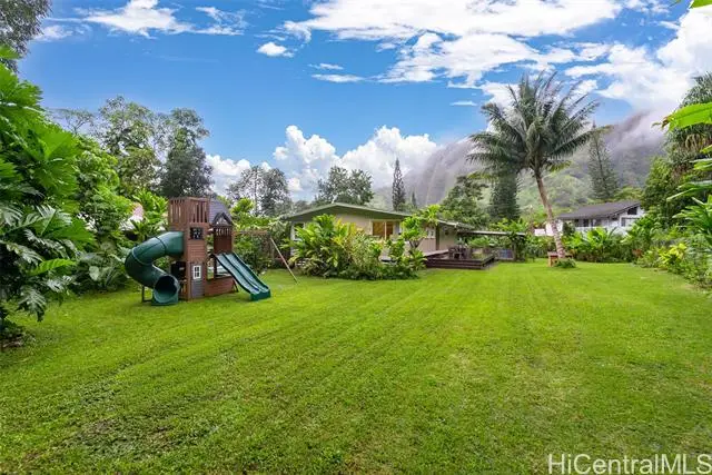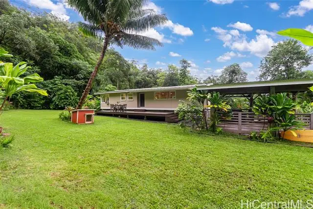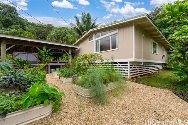This cozy home is situated at the entrance of over 8 acres of lush greenery, offering a truly tranquil escape from city life. While reaching the upper portion of the property is a hike, it rewards you with absolutely spectacular views. The level area of the lot features a spacious enclosed yard and a separate, thriving vegetable and herb garden. Inside, the home boasts a bright, open-concept floor plan with high vaulted ceilings. The numerous picture windows are perfectly positioned to capture the surrounding garden and majestic mountain views. The kitchen and laundry room feature newer appliances. Additionally, modern bathrooms and air conditioning makes for a comfortable and contemporary living experience. The large deck, approximately 360 square feet, provides ample space for outdoor entertaining and enjoying the clear night skies for stargazing. The convenience of this location—offering true island living with streams, hiking and beaches nearby while remaining accessible to Oahu’s major resources, including the main trauma center, Financial District, Military installations, and abundant dining and shopping—makes this a truly unique opportunity.
