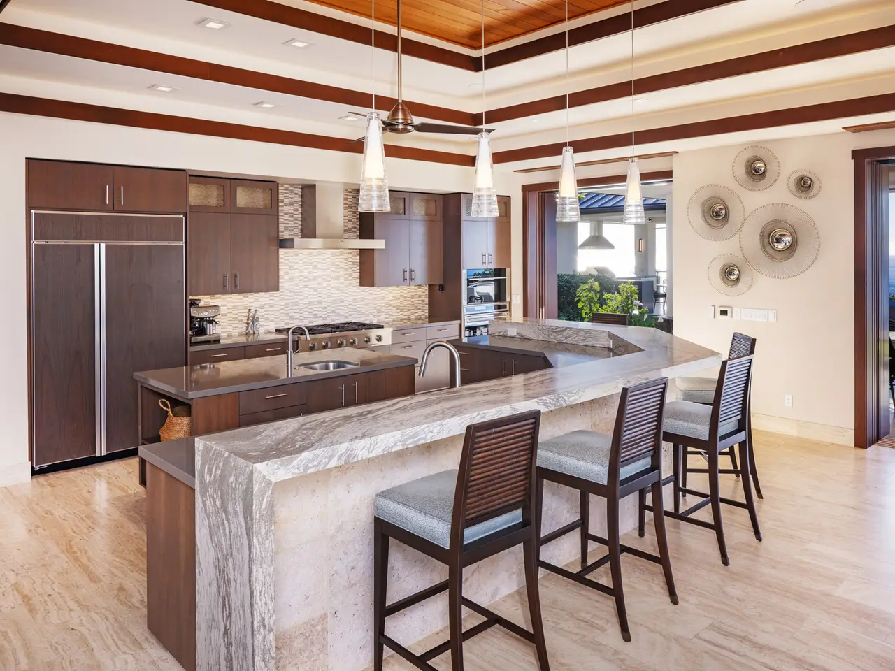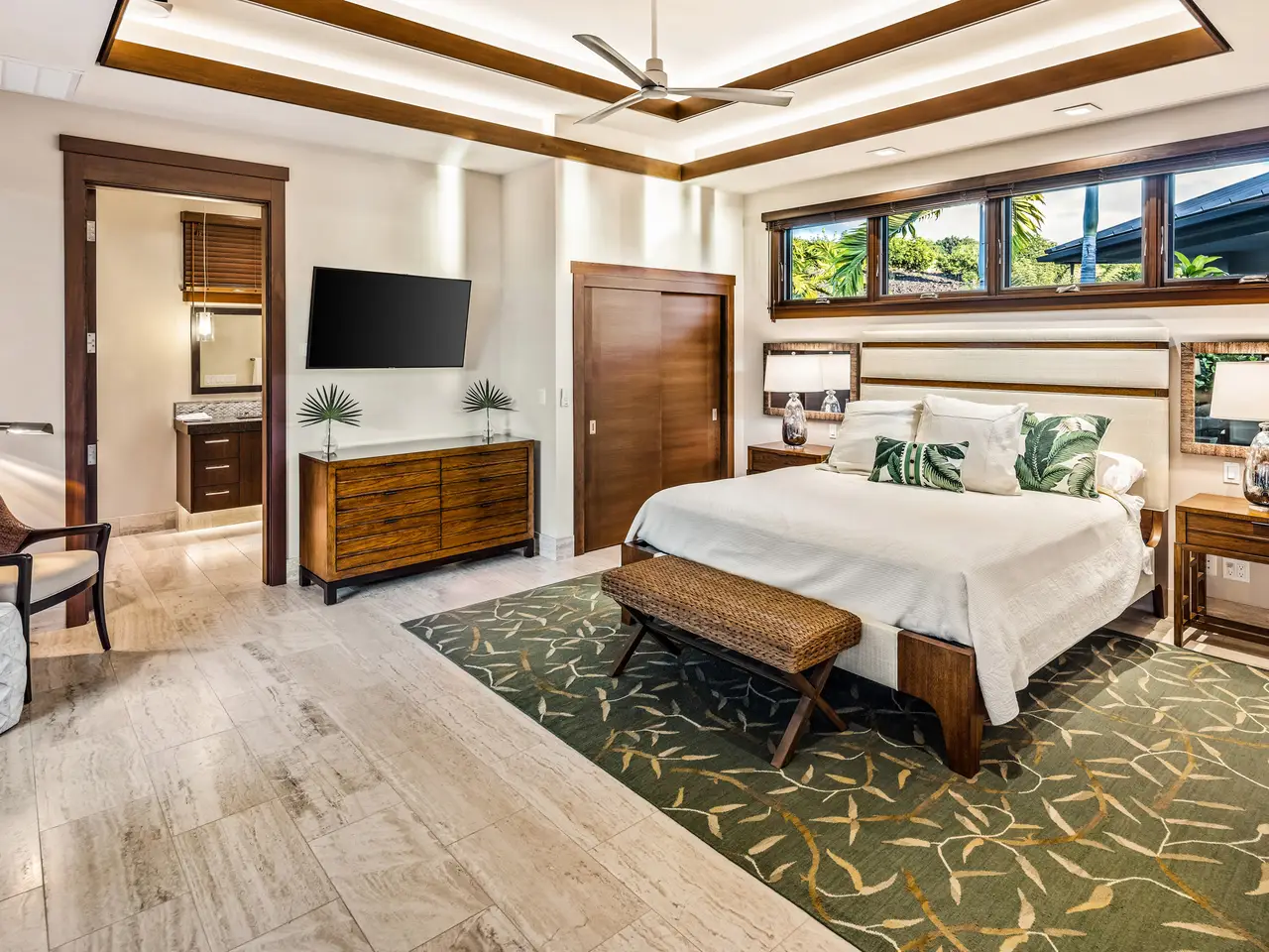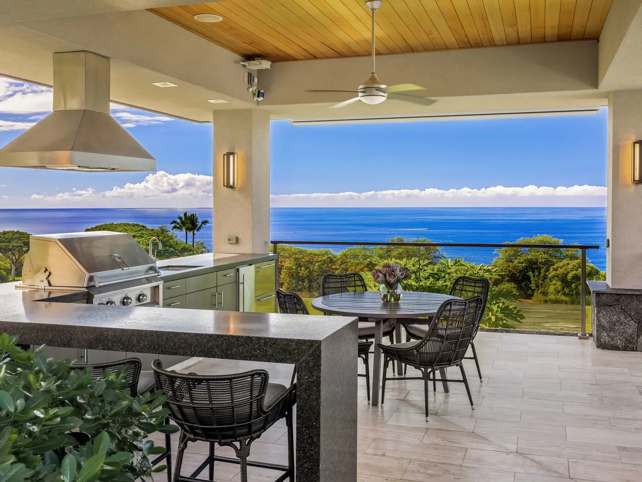 Hokuli‘a 116 stands as a truly remarkable residence along the golf course fairway within the exclusive community of Hokuli‘a. This property spans 1.15 acres and offers breathtaking views of the ocean and coastline. Designed to celebrate the natural beauty of Hawai‘i, this home combines refined architecture with an enviable location, providing the ideal setting for enjoying a peaceful and elegant island lifestyle. Refined Craftsmanship & Unique Indoor-Outdoor Living is reflected in every room and connects to lush landscaping, enhancing the indoor-outdoor flow and taking advantage of its natural environment. Pocket sliding doors open the interiors to an expansive covered lanai with stunning views. The home’s pod-style design features separate structures, or “pods,” for different functions such as bedrooms, living spaces, and the kitchen, all connected by breezeways and outdoor paths. Upon arrival, you are greeted by a roundabout that leads to a serene private courtyard, seamlessly blends into expansive social spaces that showcase stunning views. High ceilings with rich wood paneling create a warm and inviting atmosphere, while award winning built-in cabinet screens add both artistry and functionality. Fully furnished with luxurious finishes, this residence embraces open-air living, blending traditional tropical materials with modern aesthetics to create an elevated island-inspired experience, enhanced by gentle breezes and awe inspiring views from every corner. With more than 7,000 square feet under roof, the property includes a dedicated office, a spacious great room, 4 bedrooms, and 4.5 bathrooms. The private pool and spa tub provide a tranquil retreat, where you can start your mornings with a swim or end your evenings soaking in the vibrant hues of the Hawaiian sunset. A Hokulia Membership is included in the purchase price.