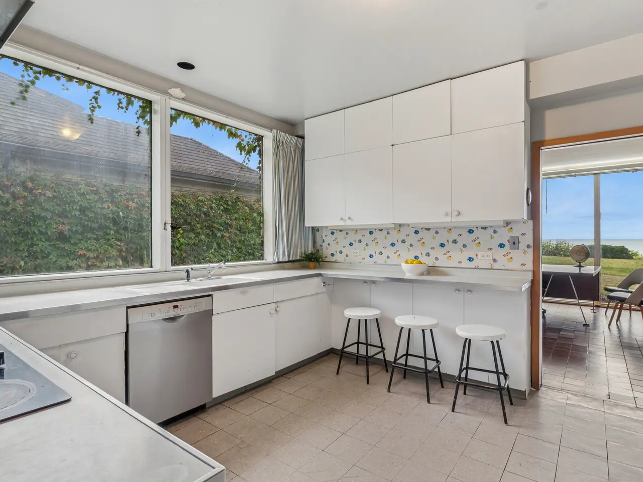 A rare lakefront opportunity in Kenilworth, set on nearly three quarters of an acre, features exceptional table land, a well-preserved bluff with a winding path to the lake, and a private lakefront! Designed by Keck and Keck in 1957, this one-level midcentury modern home showcases clean lines, expansive glass, and radiant heated floors throughout. At its center, a skylit atrium and clerestory windows create an ever-changing play of light. Shoji screens allow the space to shift from open gathering areas to a quiet retreat separated from the bedroom wing. The primary suite faces the lake, while three additional bedrooms line the peaceful south side. The main living areas open to panoramic lake views. A substantial seawall installed with adjoining neighbors protects a shoreline that naturally ebbs and flows. Walk to schools from kindergarten through high school and enjoy nearby Plaza del Lago with its high-end shops and restaurants.