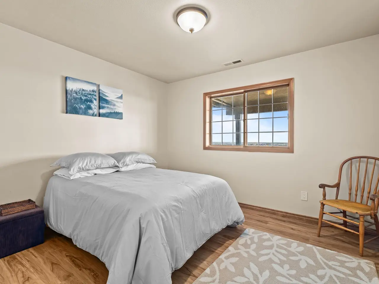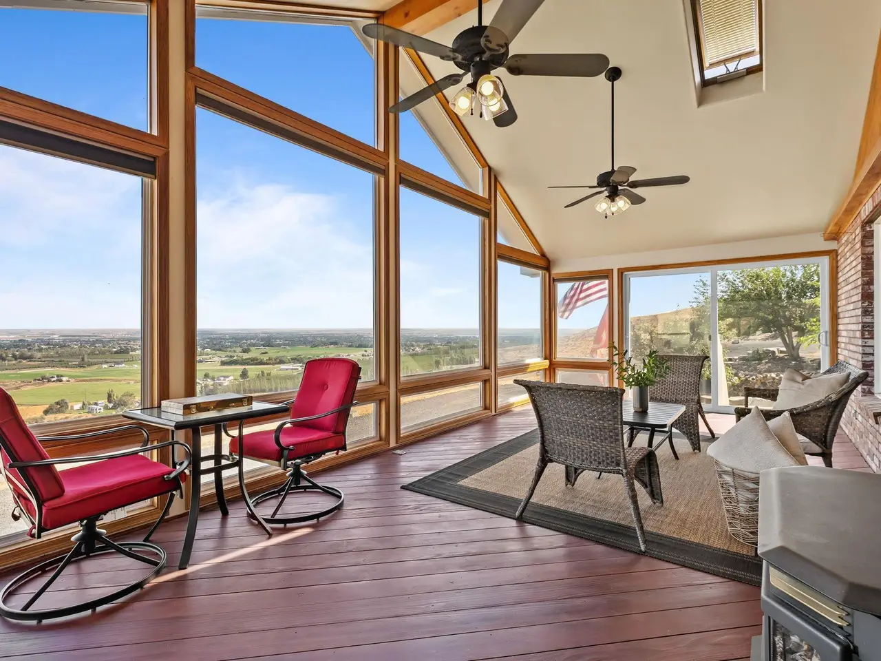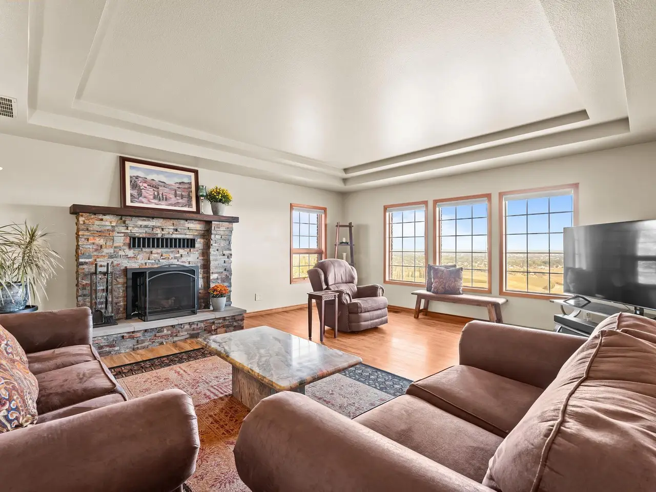 Experience the freedom of nearly 20 acres and some of the most breathtaking views in town. This private retreat blends wide-open spaces with a comfortable 4-bedroom home designed to capture the surrounding beauty. The main level features an open living and dining area with a cozy wood-burning fireplace, where windows frame the rolling landscape. A vaulted sunroom with gas fireplace provides a year-round sanctuary to enjoy the sunrise, sunsets, and changing seasons. The home includes one main-floor bedroom (currently an office) and a daylight basement with four additional bedrooms downstairs that include the primary suite. Outdoors, you'll find room for animals, gardening, and hobbies. A large shop with two full bays, an air compressor, a pellet stove for heating during cold months, and generous storage is perfect for projects and toys. Attached is a fully finished 2-bedroom, 2-bath apartment with laundry - ideal for guests, multi-generational living, or rental income. The property also features a chicken coop for fresh eggs, and a fire pit where family and friends can gather under the stars. Here you'll enjoy the best of both worlds: the tranquility of country acreage and the convenience of being just 10 minutes from shopping, schools, and everyday needs.