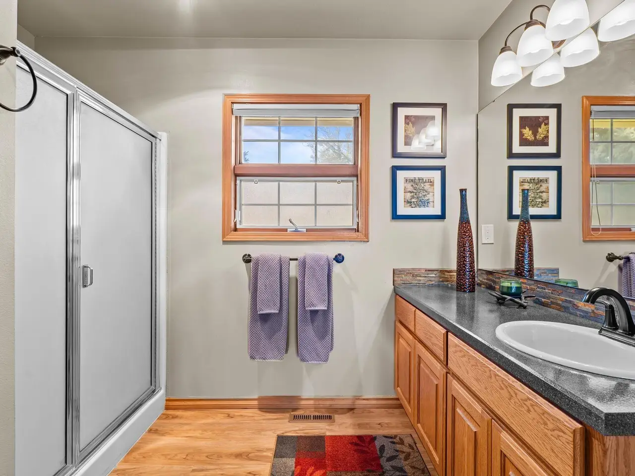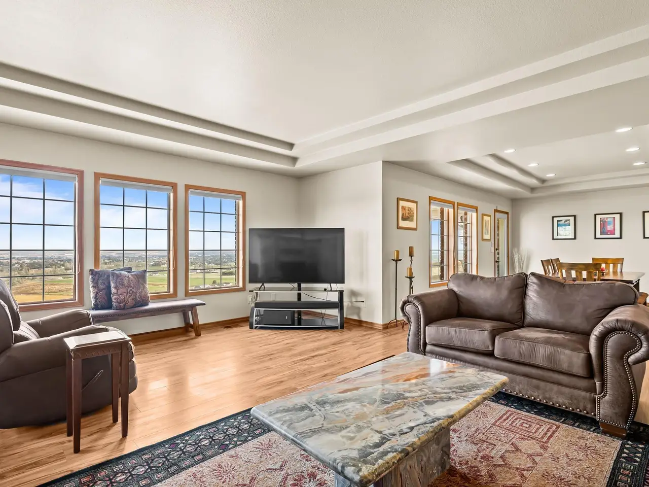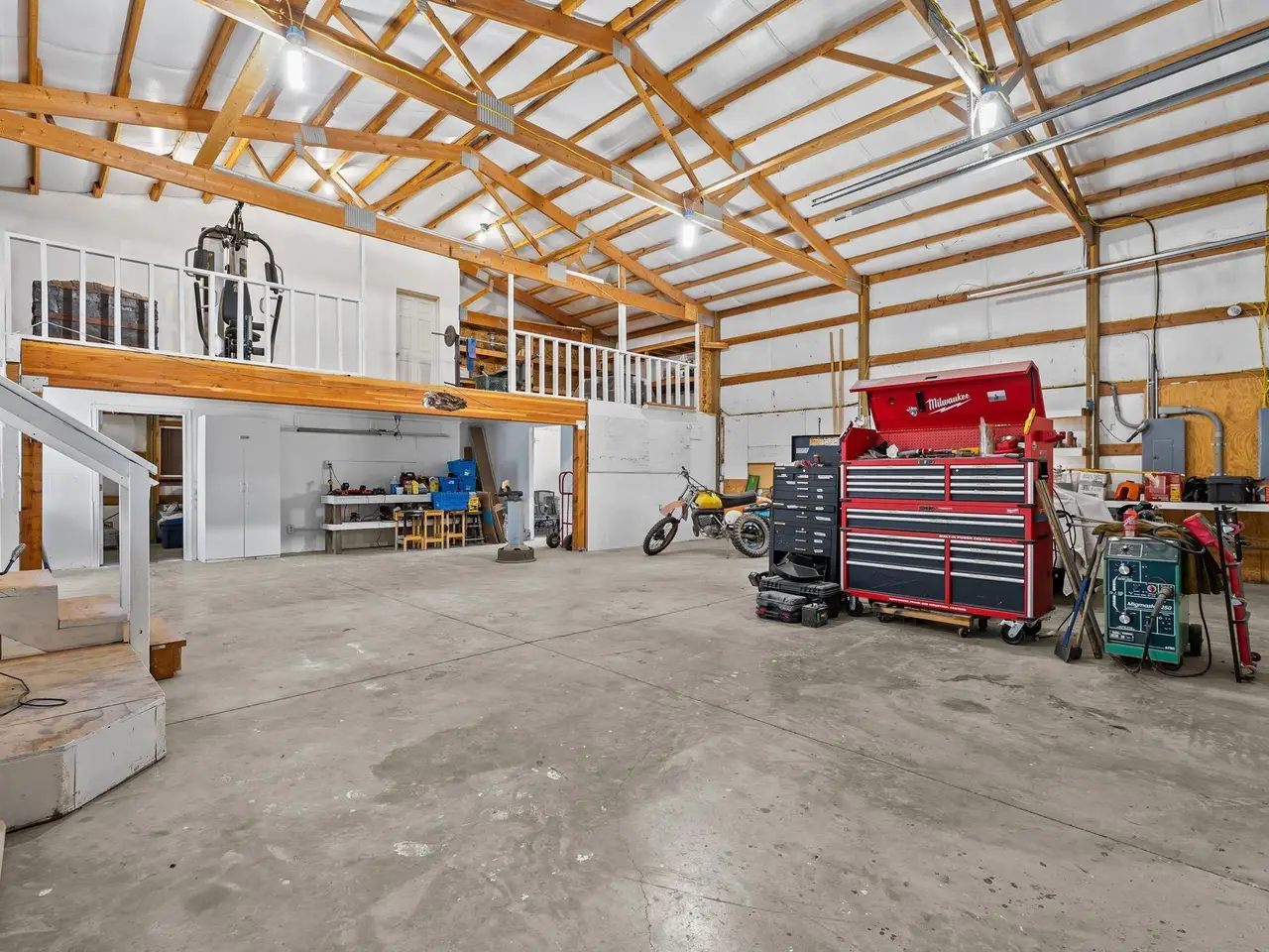Experience the freedom of nearly 20 acres and some of the most breathtaking views in town. This private retreat blends wide-open spaces with a comfortable 4-bedroom home designed to capture the surrounding beauty. The main level features an open living and dining area with a cozy wood-burning fireplace, where windows frame the rolling landscape. A vaulted sunroom with gas fireplace provides a year-round sanctuary to enjoy the sunrise, sunsets, and changing seasons. The home includes one main-floor bedroom (currently an office) and a daylight basement with four additional bedrooms downstairs that include the primary suite. Outdoors, you'll find room for animals, gardening, and hobbies. A large shop with two full bays, an air compressor, a pellet stove for heating during cold months, and generous storage is perfect for projects and toys. Attached is a fully finished 2-bedroom, 2-bath apartment with laundry - ideal for guests, multi-generational living, or rental income. The property also features a chicken coop for fresh eggs, and a fire pit where family and friends can gather under the stars. Here you'll enjoy the best of both worlds: the tranquility of country acreage and the convenience of being just 10 minutes from shopping, schools, and everyday needs.