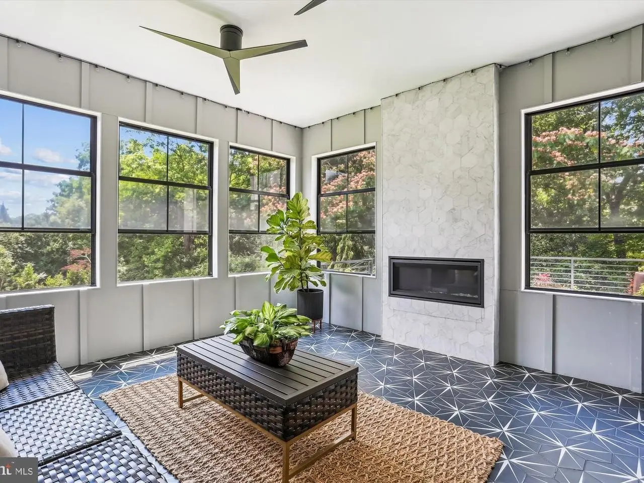 Screened-in porch with fireplace