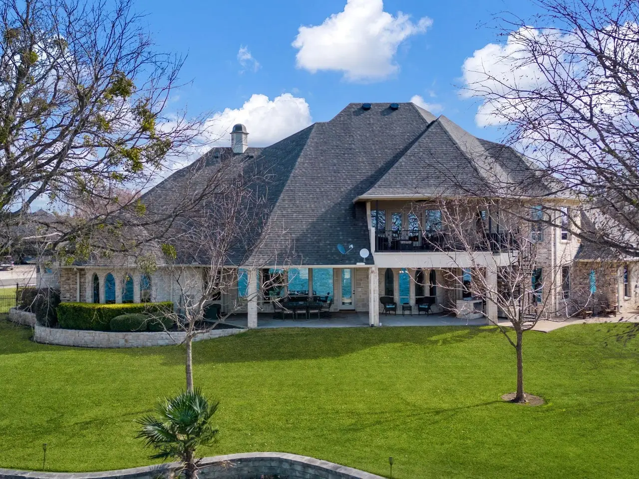 Welcome to this gorgeous two-story lake house, a true sanctuary for those who cherish waterfront living. Spanning over an acre with an impressive 426 feet of lakefront property, this home features 5 spacious bedrooms and 6 bathrooms, offering ample space for family and guests. The heart of the home is the expansive kitchen, complete with two islands and plenty of counter space. Enjoy high-end Thermador and KitchenAid appliances, as well as convenient roll-out shelves in the cabinets. The adjoining dining room and breakfast nook provide perfect settings for meals and entertaining. The inviting living room boasts built-ins, a cozy fireplace with gas logs and an electric starter, creating a warm ambiance. An office with built-ins offers a quiet space for work, while the stylish bar features a wine refrigerator and built-in wine shelving - ideal for hosting gatherings. The media room is a highlight, equipped with a projector, surround sound, built-ins, a sink, and a wine refrigerator, ensuring an exceptional movie experience. Retreat to the primary bedroom, complete with a sitting area, fireplace, en-suite bath with custom closet, a separate shower equipped with two shower heads, along with a private door leading to the back porch with stunning lake views. A second primary suite on the main level also features an en-suite bath and fireplace. The outdoor living space is just as impressive, featuring a back porch with an outdoor kitchen and spiral staircase leading to a balcony. Upstairs, enjoy a game room (with a pool table that stays), built-ins, a sink, wine refrigerator, and a door leading to a balcony. Three additional bedrooms upstairs provide comfort and privacy, including one with a large walk-in closet and balcony access. The dock features two boat lifts, two jet ski lifts, a sink, refrigerator, and a retractable boat cover. With three walk-in attics for additional storage, this lake house is the ultimate retreat for relaxation and recreation.