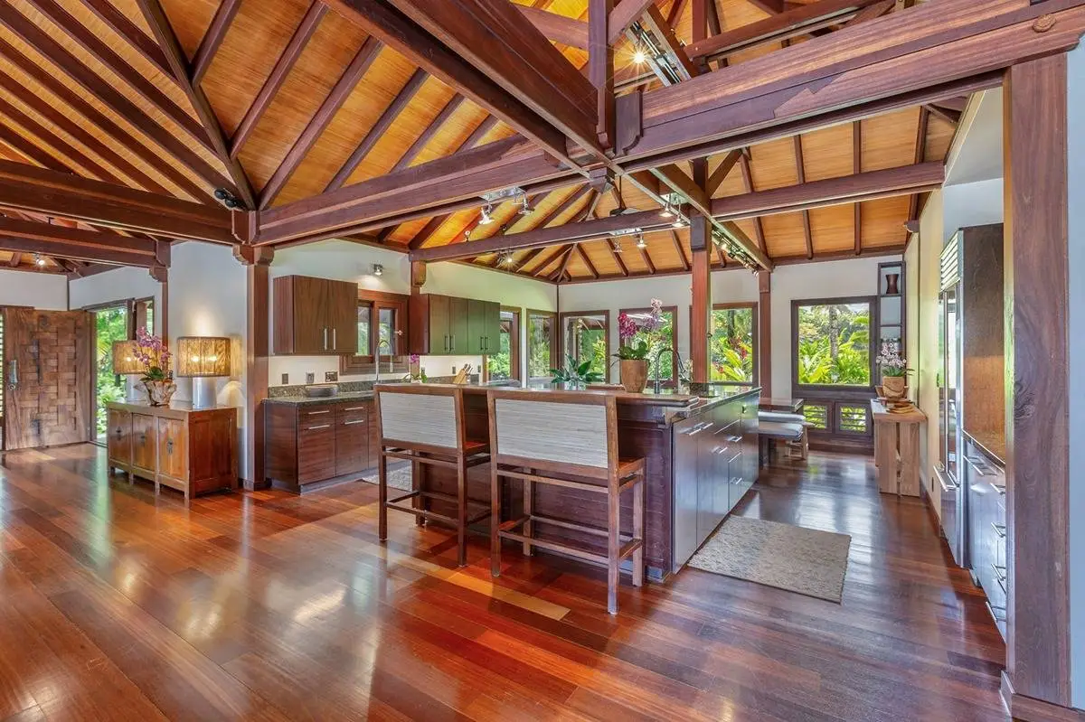 Tucked away in absolute seclusion, this expansive estate spans 3.5 acres and offers complete privacy and Bali-style luxury. With breathtaking views of Mt. Namahana as a picturesque backdrop, the 4502 sqft main residence offers four bedrooms and three and a half baths. The grand 1750 sqft great room, which includes a spacious gourmet kitchen, inviting living area, and elegant dining space, serves as the perfect venue for entertaining guests and large family gatherings. The separate bedroom suites are connected by open covered breezeways, leading to an outdoor living room-style lanai. Designed to embrace the tropical lifestyle, the residence offers extensive outdoor covered living areas and capitalizes on the refreshing tradewinds.Outside the great room, the infinity-edged salt-water pool and spa adorned with imported greenstone tiles create a captivating centerpiece, surrounded by over 3000 sqft of ipe decking and expansive outdoor covered living spaces. The spacious multi-purpose open living area downstairs is currently used as a gym. Additional features include an oversized two-car garage, air conditioning and a private detached "writer's cottage.” Distinguishing itself within the neighborhood, the house is meticulously framed with termite-resistant tropical hardwoods throughout. The home features a brand new cedar shake roof, complemented by copper gutters and rain chains. Lava stone accents adorn the exterior, while custom-carved stone art pieces are integrated into carefully selected areas of the home. Breathtaking tropical landscaping and water features complete the atmosphere. The short drive to Kilauea town offers numerous amenities and conveniences. World class golf is just a few minutes away in Princeville. Famed Hanalei Bay and countless breathtaking beaches and surf spots are also easily accessible from this ideal location on Kauai's North Shore. This is arguably one of the finest properties in Kalihiwai Ridge and the entire North Shore.