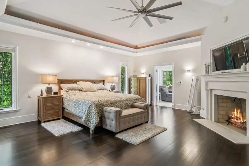 An extraordinary retreat on Bishop's Lake in Kildeer, this 5.5-acre estate blends rugged nature with sophisticated luxury. Just minutes from downtown yet worlds away in serenity, it offers sweeping lake views, mature trees, and a private resort lifestyle. Inside, the home stuns with a grand stairwell accented by a 20-foot stone waterfall, custom millwork throughout, and four fireplaces that create warmth and character in every season. The dramatic great room features soaring ceilings and walls of glass that frame ever-changing lake vistas and flood the space with natural light. At its center is a true highlight-an extraordinary $300K walnut kitchen, showcased on HGTV's "I Want That." Recently enhanced with new quartz counters and top-tier stainless appliances, it blends striking design with everyday functionality. Resort-style amenities extend beyond the walls: a treehouse-style gazebo, private beach with lake access for swimming and kayaking, and a year-round indoor pool/ hot tub with a waterfall that feels like a world-class spa. Wildlife is part of the daily rhythm here-swans gliding across the water, deer along the treeline, egrets soaring overhead, and excellent fishing right from your shoreline. Whether entertaining by the lake, enjoying quiet mornings on the beach, or relaxing fireside after a swim, this estate delivers a rare balance of natural beauty and sophisticated design in one of Kildeer's most coveted settings. Completing the picture is a massive three-car garage, featuring one oversized stall with a 10'10" door and nearly 30' deep- perfect for housing an RV, boat, or car rack.
