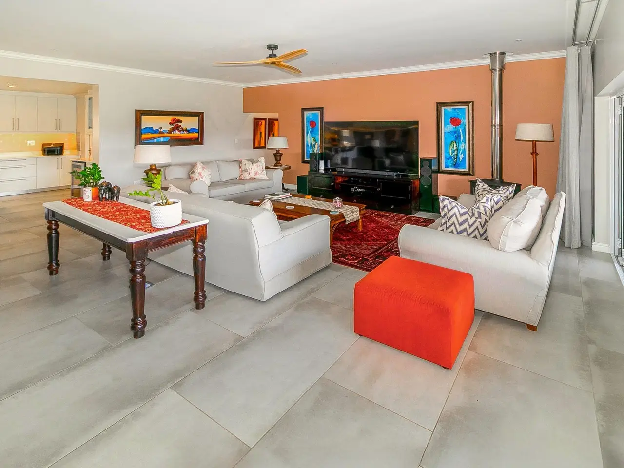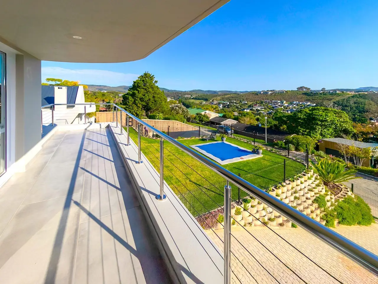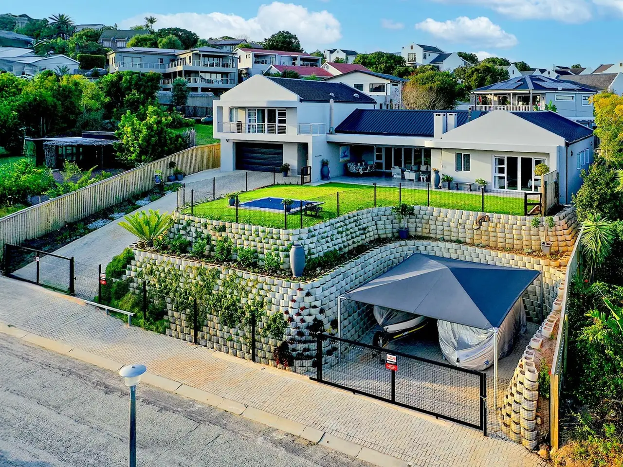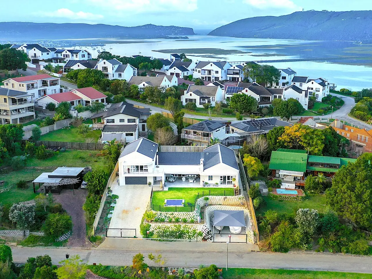 Stylish Modern Home with Views This newly completed 2024 double-storey home offers the perfect fusion of modern design, luxury finishes, and practical features - all set against the stunning backdrop of Knysna's mountain landscape. North-facing and thoughtfully laid out, it is ideal for both family living and entertaining. The open-plan living and dining area features a central fireplace and flows seamlessly onto a vast undercover patio, equipped with a built-in braai and pizza oven, ideal for relaxed gatherings. A small swimming pool adds a touch of luxury, while the flat rooftop deck above offers panoramic views, ideal for sundowners and stargazing. The stylish kitchen is equipped with a SMEG gas hob, gas geyser, walk-in pantry, and separate scullery, complemented by a wine cellar for the enthusiast. A lounge/study area provides additional flexible living space. The home offers generously sized bedrooms, two of which are en-suite, all with high-end finishes, ceiling fans, and spacious showers. On the ground floor, you'll find the main en-suite bedroom, along with two additional bedrooms that share a full bathroom, as well as a guest toilet. The upper level features a large en-suite bedroom with a walk-in wardrobe and private access to the rooftop area. Additional features include a double extra-length garage with space for three vehicles, covered parking for a boat and caravan, two 15,000L water tanks, an alarm system, an outside toilet for workmen, and ceiling fans in both the lounge and two en-suite bedrooms. With quality finishes throughout, this is a meticulously designed home offering space, comfort, and elegant living in a prime Knysna location.