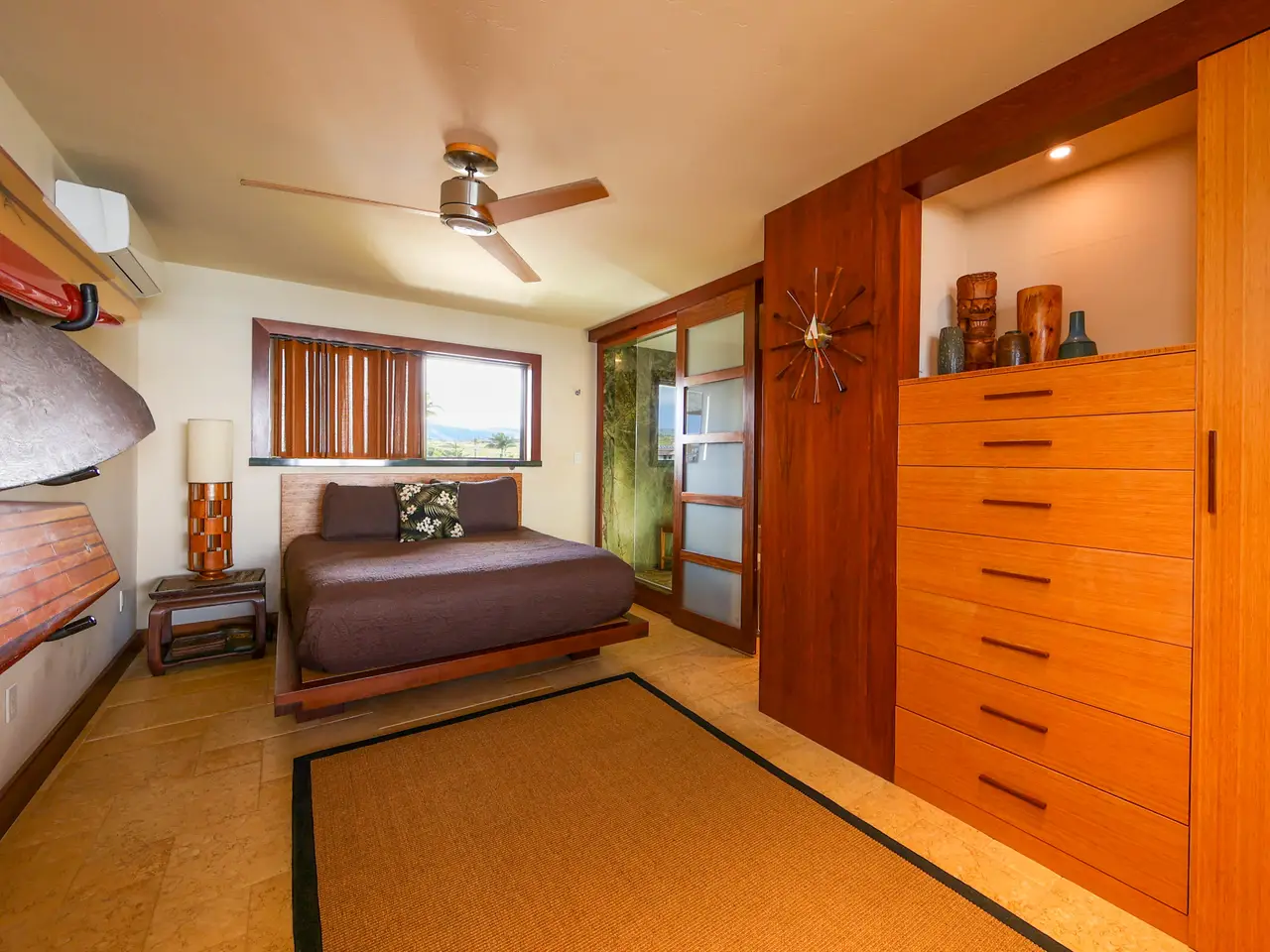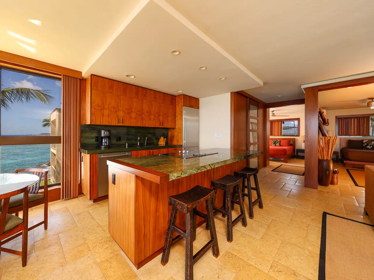 Iconic, rare and meticulously crafted, Kuhio Shores 413 is the most remarkable oceanfront condominium listed on Kauai. Located on the top floor of the four-story Kuhio Shores, its floor-to-ceiling windows and lanai overlook Kauai's pristine Poipu coastline and three renowned surf breaks, inspiring the designer's unique blend of mid-century & Asian surf vibe. Kuhio Shores 413 interiors feature custom Koa cabinetry and Brazilian Cherrywood shoji doors, Egyptian tile flooring, recessed lighting, split air conditioning, modern appliances, vintage mid-century and custom-designed furnishings, and a collection of Hawaiiana objet d'art. To discover a residence on Kauai of this caliber in a location of this quality is highly uncommon. Well-maintained by the owners who enjoy their home for 4 months annually, Kuhio Shores 413 is a sought-after vacation rental and is being offered for sale fully furnished. Residents of Kuhio Shores enjoy surf breaks and sunsets, whales and sea turtles, snorkel spots, coastal bike rides and walks, in addition to maintained grounds, barbecue facilities, and elevators. Lawai Beach, Poipu's Baby Beach, and The Shops at Kukui'ula are nearby. FACTS AND FEATURES Interior SF: 953 SF Lanai SF: 106 SF Location & Access: Top Floor Access by Elevators Views: Unobstructed Ocean, Ocean Horizon, Coastline Orientation: South Cooling: Split Air Conditioning System Living: Brazilian Cherrywood featured walls and shoji privacy doors, vintage mid-century and custom-designed furnishings. Kitchen: Custom Koa & Ipe wood cabinetry, SubZero refrigerator, macauba and Rain Forest marble counters in a custom green. Primary Bedroom Suite: Custom built-in platform bed and bamboo cabinetry. Its ensuite features Rain Forest floor-to-ceiling marble-slab shower, macauba vanity top. 2nd Bedroom: Custom built-in platform bed and bamboo cabinetry. 2nd Bathroom: Rain Forest marble-slab shower, macauba vanity top.