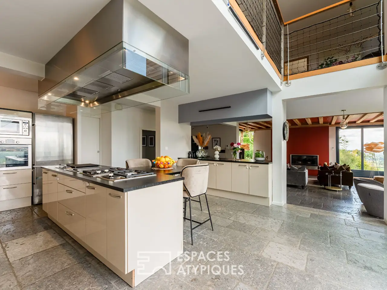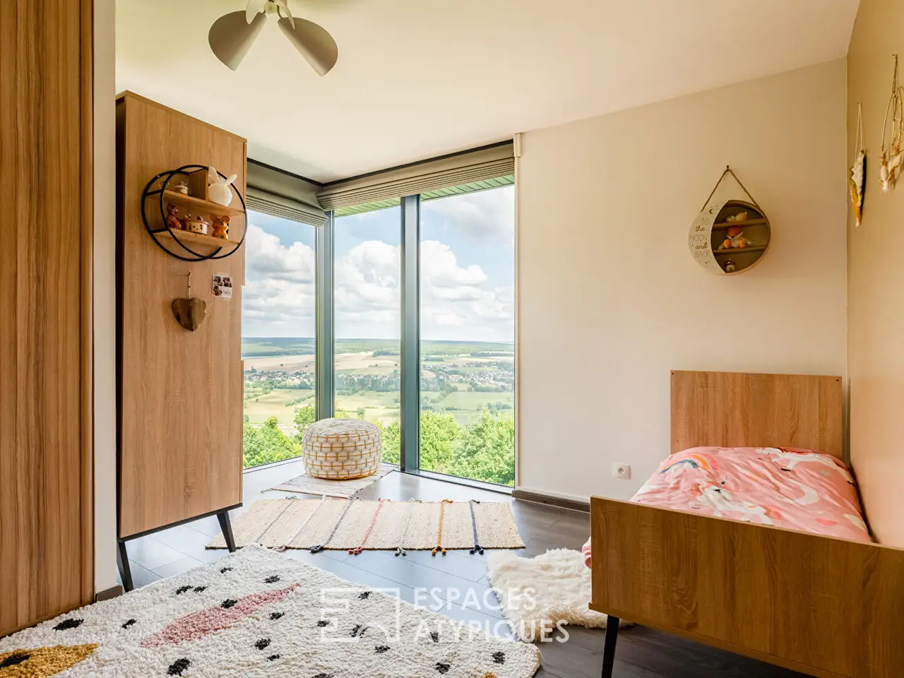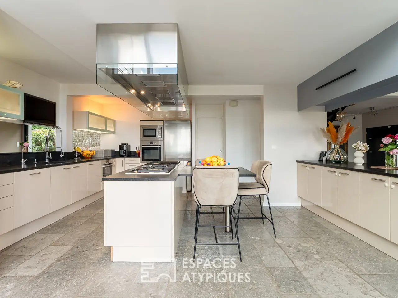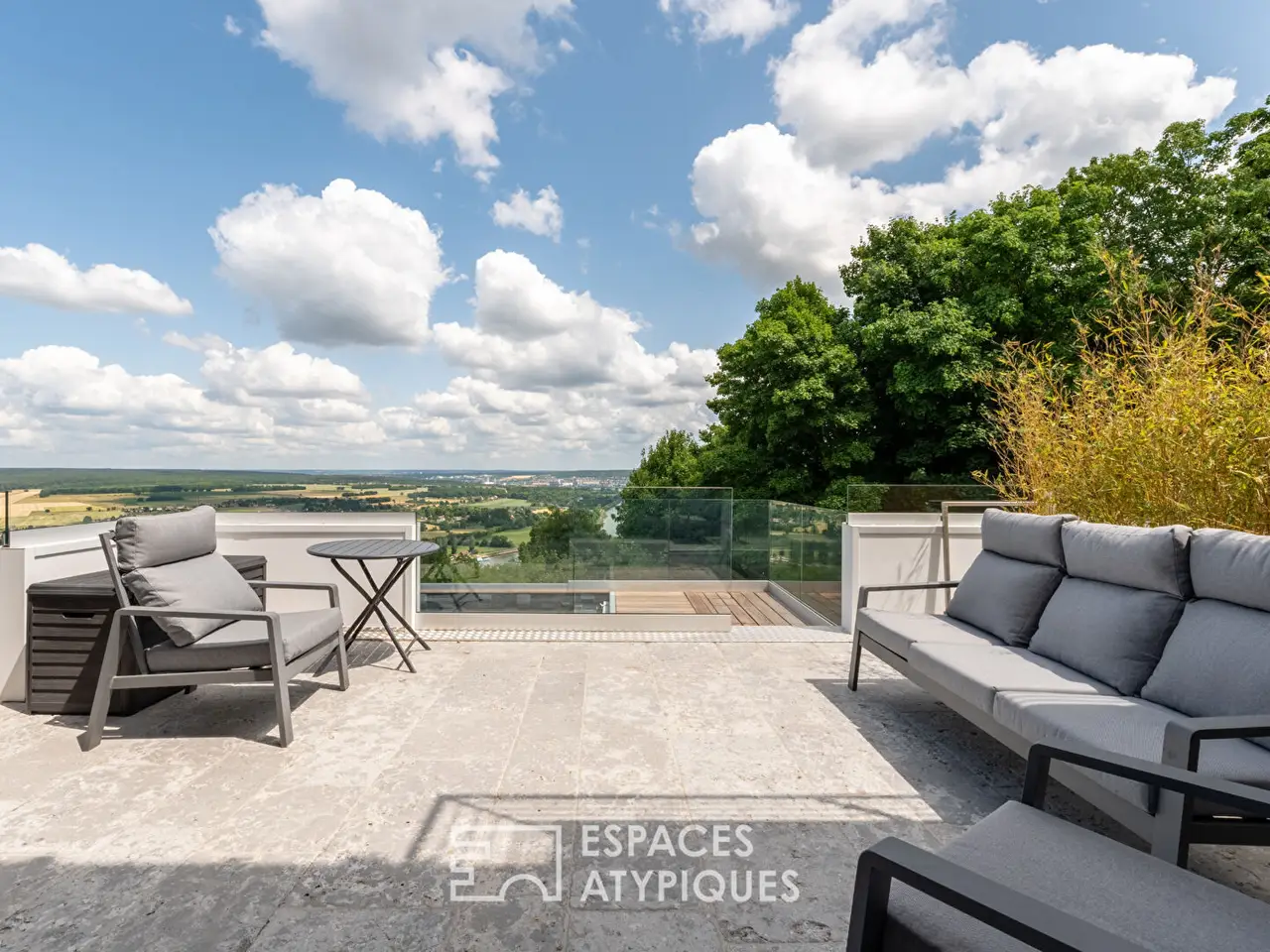 Located on the heights of La Bouille, this 294 m2 contemporary house sits on a 1,800 m2 plot. Its cubic design and clean lines make it a striking architectural achievement, designed to fully embrace the landscape thanks to large bay windows and several terraces with panoramic views of the Seine Valley. Spread over three levels, the house is organized around a dual-aspect living space on the ground floor, entirely clad in Burgundy stone. The open-plan kitchen with a central island and professional range hood opens onto a dining room and a bright living room, structured around a fireplace and a unique view of the river. A 44 m2 terrace with a swimming pool, suspended above the valley, extends the interior space and offers an exceptional visual and sensory experience. Upstairs, the sleeping area includes a large 39m2 landing, a master suite with a dressing room and bathroom, and two additional bedrooms. On the garden level, there are two additional bedrooms with bathrooms, as well as an office. This level also features a laundry room, a cellar, and a closed garage that can accommodate two to three vehicles. In a quiet location, 5 minutes from the A13 motorway and 15 minutes from Rouen, this house with its distinctive architecture offers a privileged living environment combining nature, modernity, and accessibility. Information on the risks to which this property is exposed is available on the Georisques website: www.georisques.gouv.fr ENERGY CLASS: C / CLIMATE CLASS: A Estimated average annual energy expenditure for standard use, based on 2021 energy prices: between €3,220 and €4,440. REF. 11335EAR Additional information * 8 rooms * 5 bedrooms * 3 bathrooms * Floor : 3 * 3 floors in the building * Outdoor space : 1800 SQM * Parking : 2 parking spaces * Property tax : 4 445 € Energy Performance Certificate Primary energy consumption c : 153 kWh/m2.year High performance housing