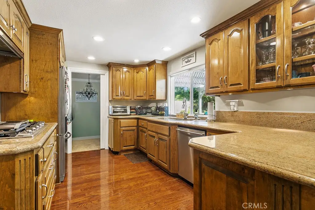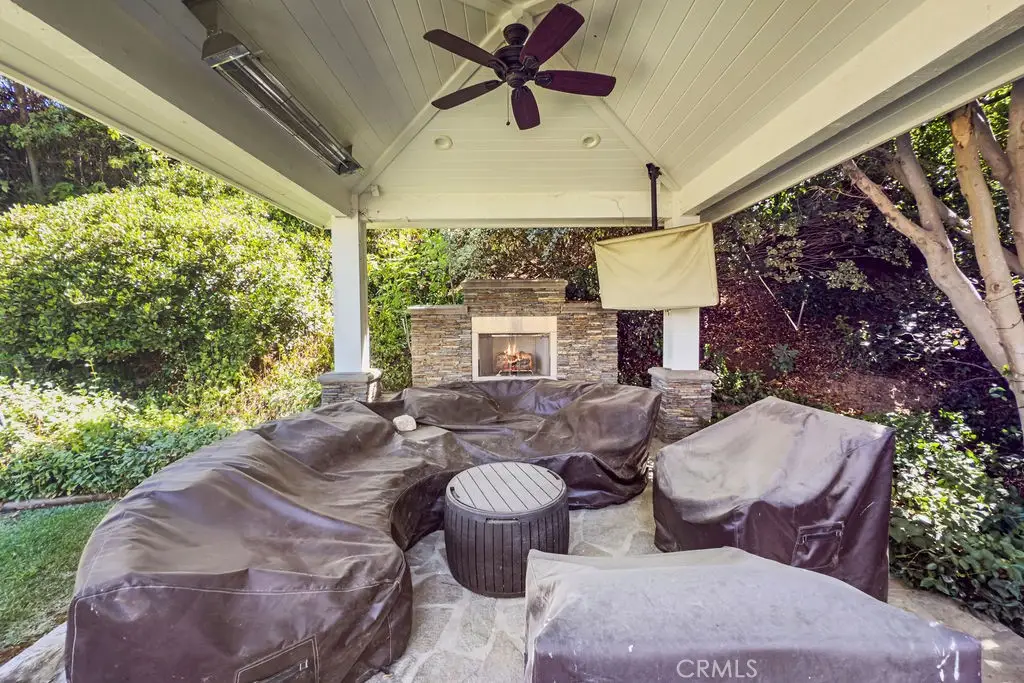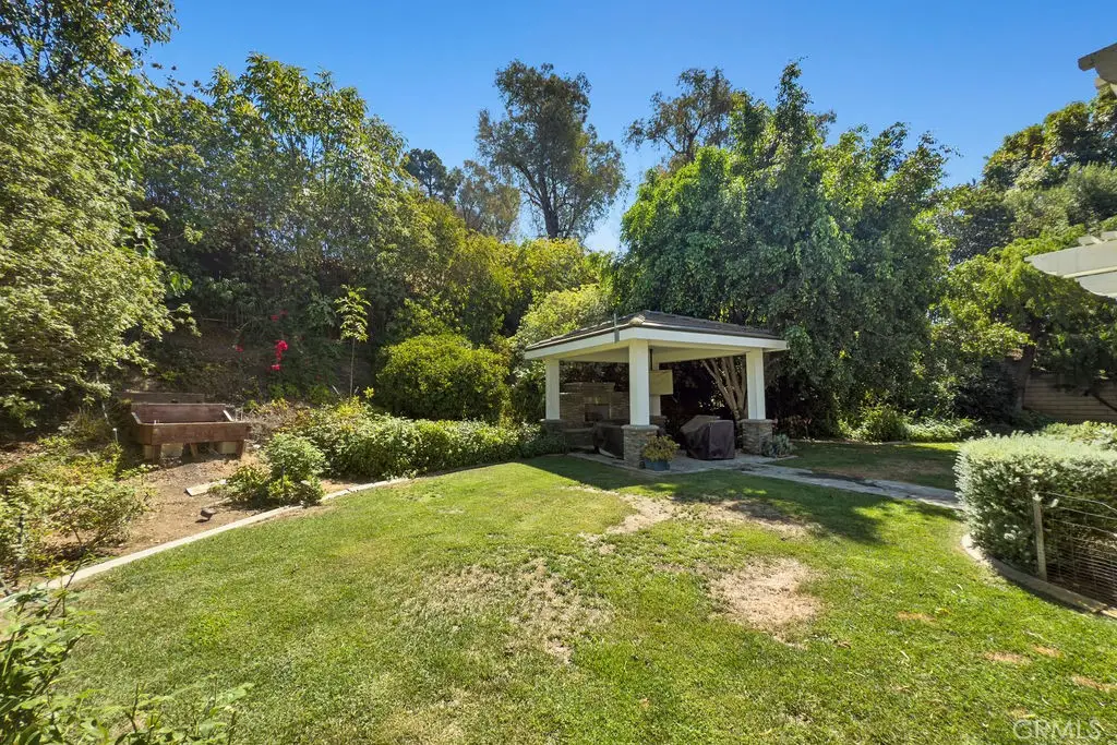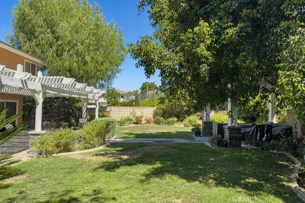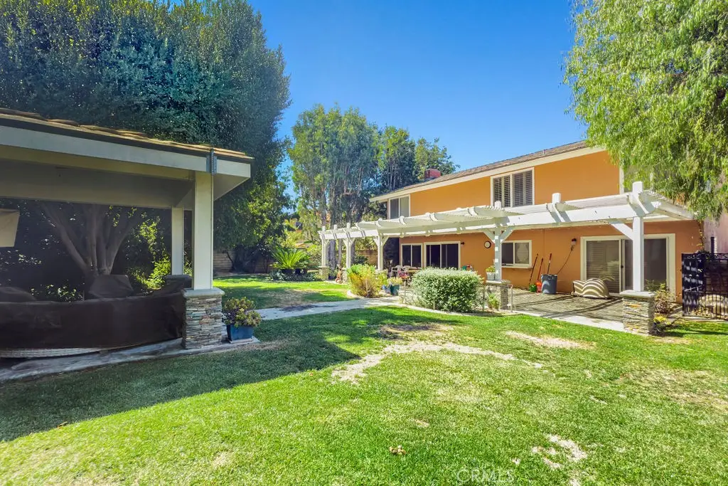 Country Hills East - Meticulously Maintained Cul-de-Sac Home Leaded glass entry doors welcome you into a stunning two-story foyer. Travertine flooring flows seamlessly through the formal living and dining rooms, creating an elegant first impression. The upgraded kitchen is a chef's delight, featuring beautiful custom pecan cabinetry, granite countertops, and stainless steel appliances. Open to the kitchen, the spacious family room is warm and inviting with matching pecan cabinetry, rich wood flooring, a stone fireplace, and recessed lighting. A sliding glass door extends the living space outdoors to a truly one-of-a-kind backyard retreat. Designed for year-round entertaining, it boasts exquisite hardscape, lush greenery, detailed stonework, and a large covered gazebo complete with an outdoor fireplace and TV. Upstairs, you'll find generously sized bedrooms with vaulted ceilings and cedar-lined closets. One bedroom is currently set up as an office with a built-in desk. The remodeled hall bathroom features the same high-quality finishes carried throughout the home for a cohesive design. The primary suite offers a bright, airy retreat with a romantic fireplace, a spa-inspired en-suite with dual vanities, and an expansive mirrored closet. Additional highlights include custom woodwork, plantation shutters, solid wood doors, and thoughtful upgrades throughout. Conveniently located near shopping, dining, movie theaters, and beautiful Laguna Lake, this home truly has it all.