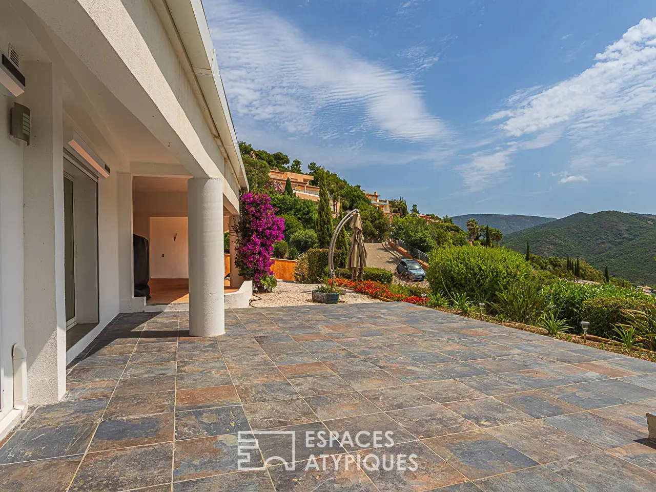 In the lush green setting of the private Valcros estate in La Londe-les-Maures, this architect-designed villa of approximately 250 sqm flourishes on a landscaped plot of 1,300 sqm, offering a striking panoramic view of the sea, the golf course, and the surrounding hills. Its contemporary silhouette dialogues with nature and invites tranquility. Extremely well designed to combine volume, comfort, and light, the property reveals, from its private elevator, a vast living space of 90 sqm extended by a contemporary kitchen with clean lines and functional spaces. The south-facing master suite invites calm with its custom-made dressing room and bathroom overlooking the jacuzzi and the swimming pool. Upstairs, a suite, bathed in light, opens onto an intimate solarium, while a spacious independent one-bedroom apartment on the garden level offers an ideal space to welcome family or guests. Outside, large terraces invite you to relax facing the sea, between a sparkling swimming pool and shaded corners conducive to contemplation. The peaceful and preserved environment allows you to savor the sweetness of the South in complete serenity and at any time, from sunrise to sunset. Just a few minutes from the beaches, golf course and amenities, this property stands out for its unique character and elegance, designed for a life focused on comfort and light. ENERGY CLASS: C 119 kWh/m2.year - CLIMATE CLASS: A 3kg CO2/m2.year Estimated average amount of annual energy expenditure for standard use, established from 2021 energy prices between EUR2,160 and EUR2,980. For more information on risks, visit the Georisques website: www.georisques.gouv.fr. ?Muriel CLADE 06.51.66.21.71. REF. 11193 Additional information * 6 rooms * 4 bedrooms * 4 shower rooms * 2 floors in the building * Outdoor space : 1350 SQM * Parking : 4 parking spaces * 40 co-ownership lots * Property tax : 1 500 € Energy Performance Certificate Primary energy consumption c : 119 kWh/m2.year High performance housing