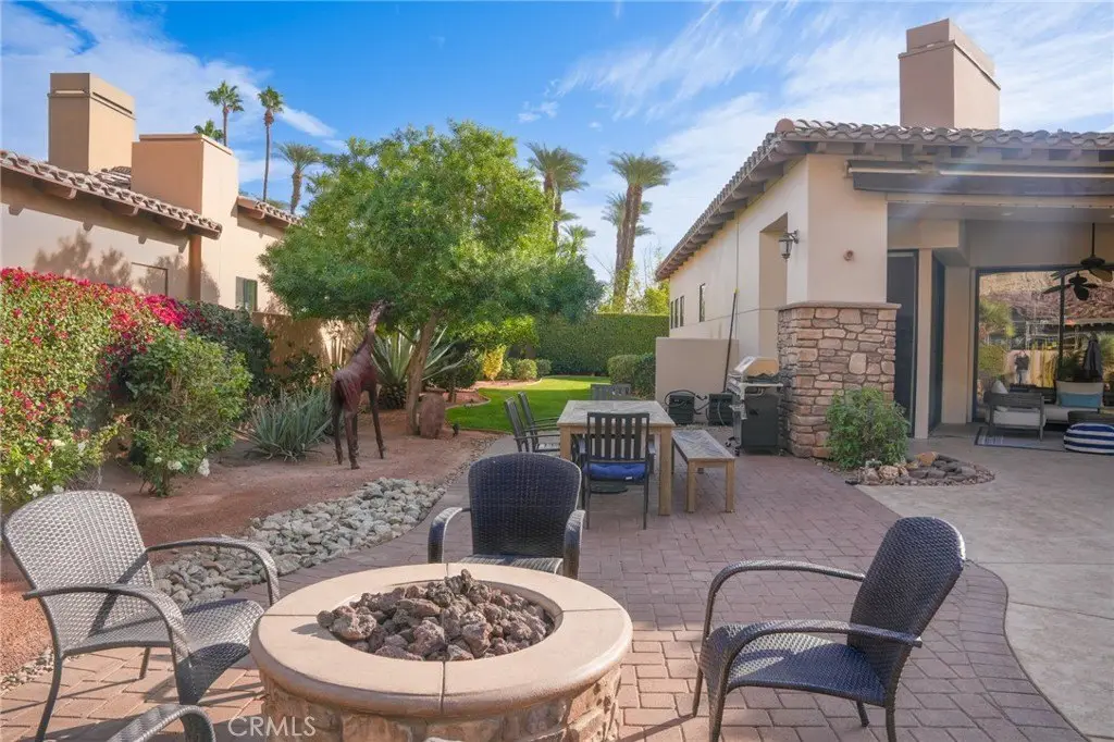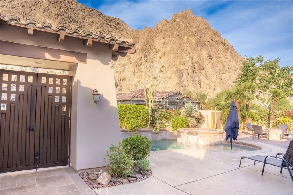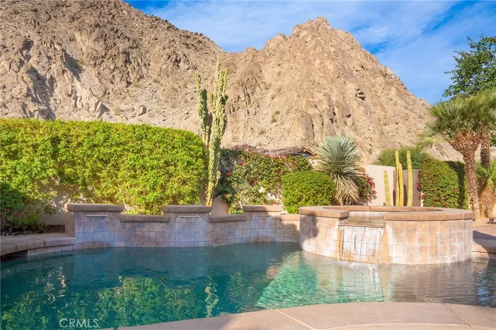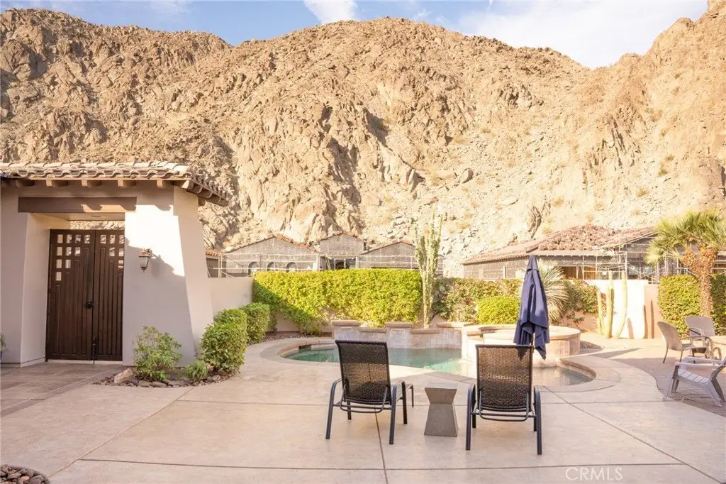 Experience the epitome of luxury living with unparalleled views and a prime location in the esteemed Point Happy Estates of La Quinta. This FULLY FURNISHED TURN KEY retreat is nestled against the majestic mountains in a tranquil neighborhood, this rare opportunity offers a secluded retreat within walking distance to exquisite dining, shopping, and coffee shops. Perfectly positioned for outdoor enthusiasts, it's just minutes away from exceptional hiking trails. Step inside to discover a home adorned with exquisite upgrades, including a Thermidor gas range, built-in stainless steel refrigerator, and luxurious travertine tile floors complemented by lofty 12' ceilings. Recent upgrades include a new 2-zone A/C system, garage A/C, patio misters, and a retractable awning, ensuring comfort and convenience year-round. Wake up to breathtaking mountain vistas from your primary suite, complete with a cozy fireplace for added ambiance. Indulge in the spa-like primary bathroom featuring a walk-in shower and spacious dual sinks. Two additional generously sized guest bedrooms offer private en-suite bathrooms, providing the perfect accommodations for visitors. Entertain in style in the open-concept living room, seamlessly flowing onto the poolside patio, where the awe-inspiring mountain views serve as a stunning backdrop. Enjoy the serenity of your own private oasis amidst meticulously manicured grounds on an oversized lot. Discover the ultimate blend of luxury, comfort, and natural beauty in this extraordinary La Quinta retreat.