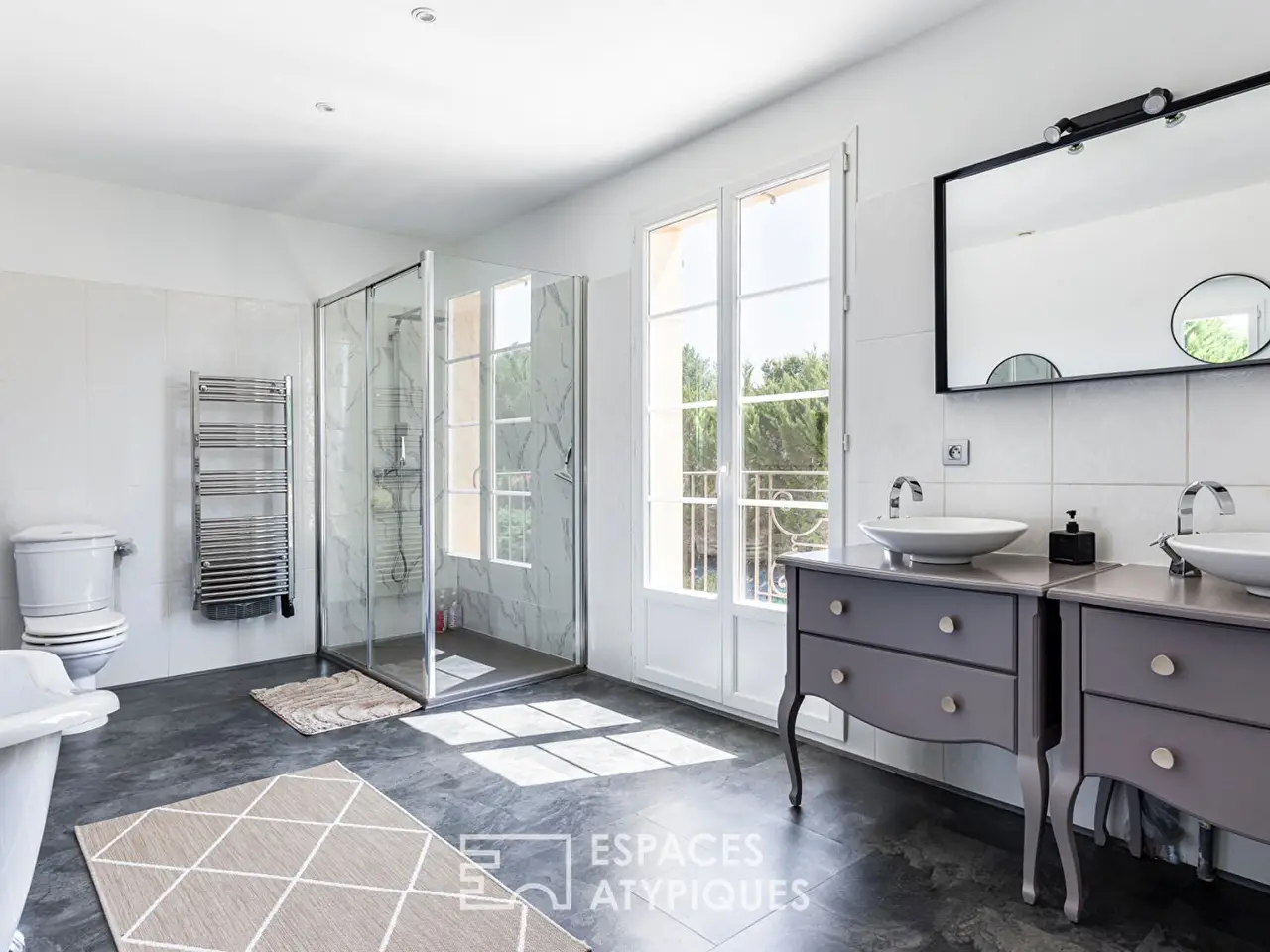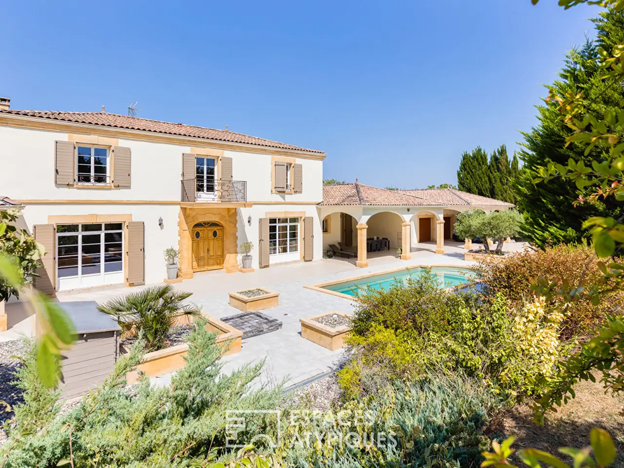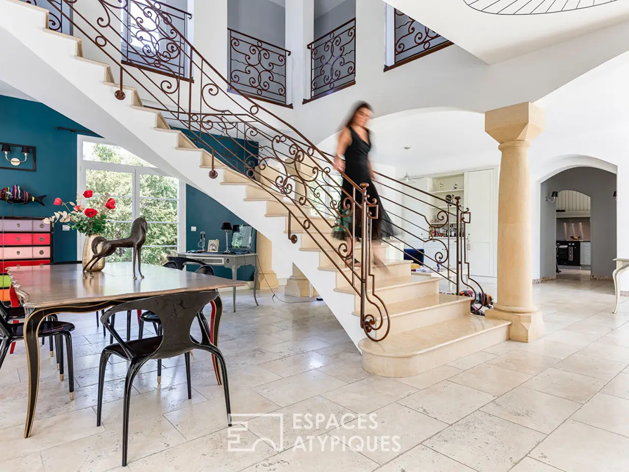 Located in Labastide-Saint-Sernin, this architect-designed villa, built in 2008, offers 375 sqm of living space on a wooded plot of approximately 2600 sqm, with no overlooking views. This exceptional property, enhanced by a salt-water swimming pool and several terraces, is distinguished by its generous volumes and unique architecture, inviting you to truly fall in love with it. Upon entering, the villa reveals a spectacular living room of over 150 sqm, enhanced by a 3-meter ceiling height, Turkish travertine flooring, a Dordogne stone fireplace, and a central Jerusalem marble staircase. This living space is naturally organized into several atmospheres: living room, dining room, reading corner, and billiard area, allowing for easy projection into this elegant living environment. The fully equipped kitchen, with a surface area of over 25 sqm, extends into an adjoining pantry. The ground floor also houses an exceptional master suite of approximately 75 sqm, including a 40 sqm bedroom, a separate 10 sqm dressing room, and a 25 sqm bathroom with a 5-person spa and walk-in shower. A gym, a separate toilet, and plenty of storage space complete this level. The upper floor leads to four large bedrooms and a 14 sqm bathroom with a bathtub and shower. Upstairs, four bright bedrooms and a large bathroom allow for harmonious family life. The carefully landscaped garden offers a 9×4 flat-bottomed salt-water swimming pool, ideal for relaxation. The villa benefits from a vast covered terrace of over 50 sqm, extended by a second uncovered terrace, perfect for entertaining and enjoying the sunny days. Thermal comfort is ensured by underfloor heating via an air/water heat pump on the ground floor and reversible air conditioning upstairs. Its excellent energy rating confirms its optimization. A well, an automatic watering system, a motorized gate and an electric garage door enhance the outdoor amenities. This property is located in a peaceful residential environment, close to local amenities, offering a privileged living environment. This architect-designed villa, with its unique features and high-end services, represents a rare opportunity on the real estate market. Shops and schools 5 minutes, Blagnac Airport 25 minutes, Highway 12 minutes REF. 12083 Additional information * 11 rooms * 5 bedrooms * 3 bathrooms * Floor : 1 * 1 floor in the building * Outdoor space : 2700 SQM * Parking : 6 parking spaces * Property tax : 4 498 € Energy Performance Certificate Primary energy consumption b : 108 kWh/m2.year High performance housing