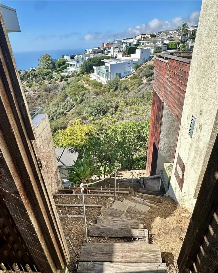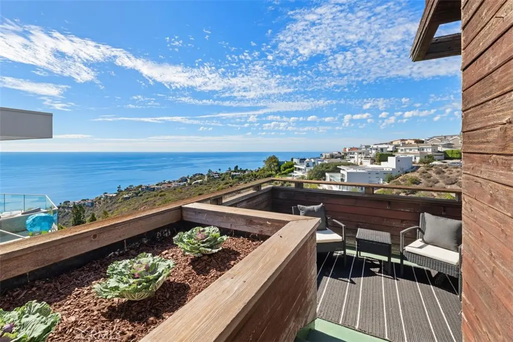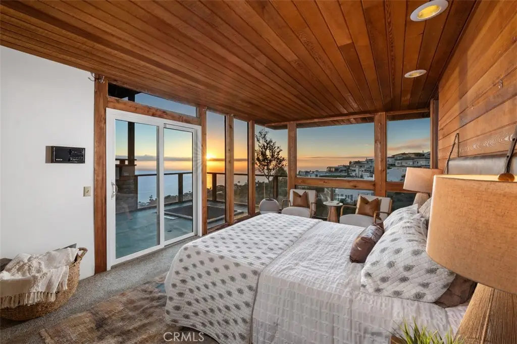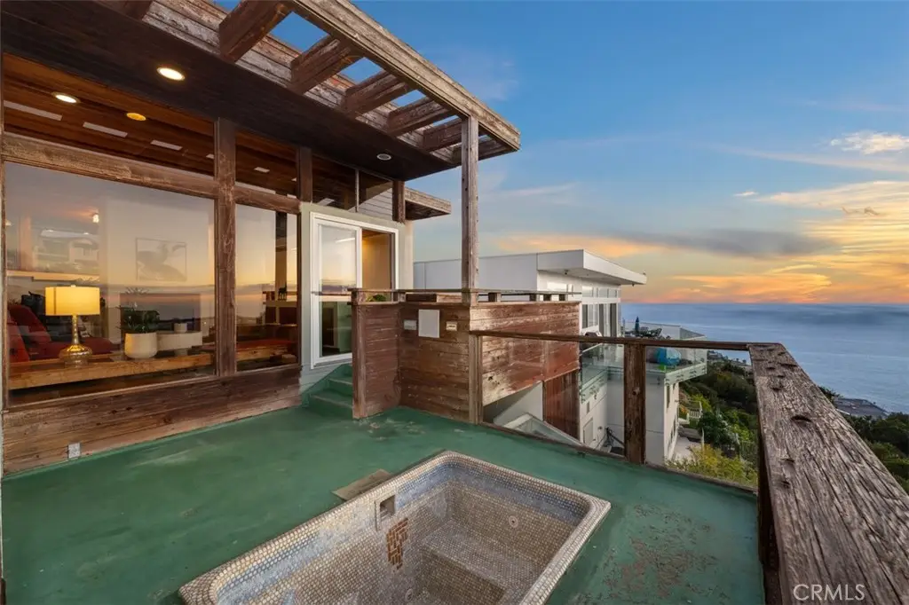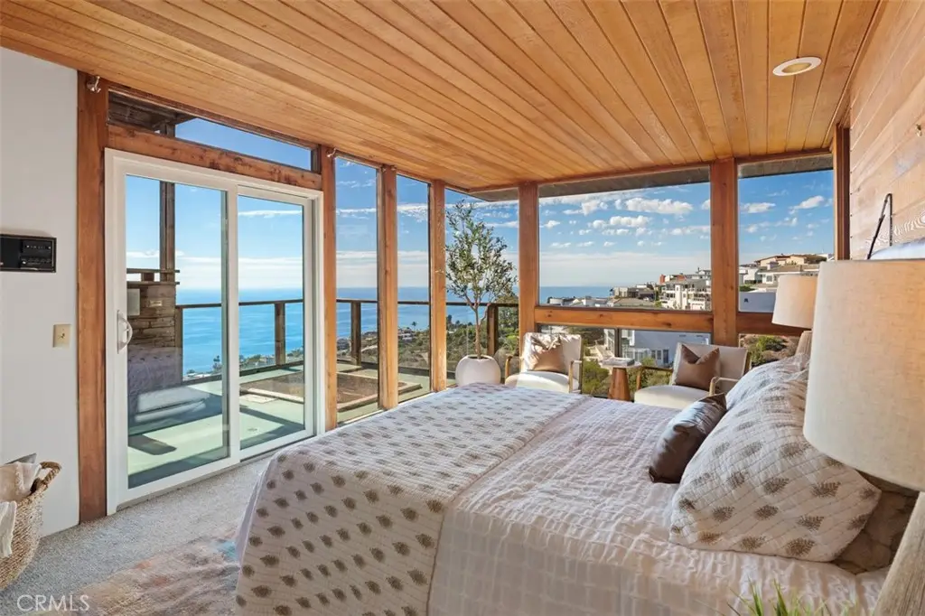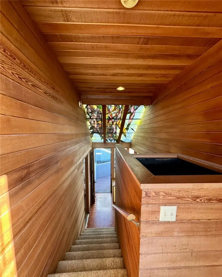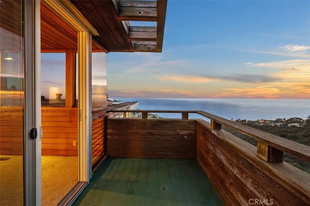 Perched atop Balboa Avenue, just steps from Moulton Meadows Park, this 1977 mid-century residence offers panoramic views of the Pacific Ocean, canyon, and coastline. Designed by award-winning architect Blair Ballard, recognized by the Laguna Beach Architectural Guild for excellence in residential design, this home reflects Frank Lloyd Wright's organic architecture philosophy of blending structure and setting in harmony. Its multi-level layout features cedar plank walls and ceilings, expansive glass, strong horizontal lines and a timeless mid-century modern aesthetic. Two exquisite handcrafted stained-glass installations by Mogens Abel, revered wood carver and longtime Festival of Arts exhibitor, are set in the entry and kitchen ceilings and beautifully infuse the space with color, artistry and Laguna's creative spirit. The primary suite offers stunning ocean views through walls of windows and includes a walk-in closet and a step-down shower with a full-length view window. Sliding glass doors open to the deck with a sunken jacuzzi for enjoying the spectacular sunset views over Victoria Beach. Two additional bedrooms off the main entrance hallway are ideal for a home office or guest room. Both the family room and upper-level den offer captivating ocean views and refreshing coastal breezes. The side yard patio opens to a trellis covered potting shed and leads down the hill to an ocean-facing greenhouse. While the home requires some restoration, it is solidly constructed and full of character, including the original built-in seating, hardware and cabinetry. Don't miss this rare opportunity to personalize and revive a living piece of Laguna Beach's celebrated art culture and architectural legacy.