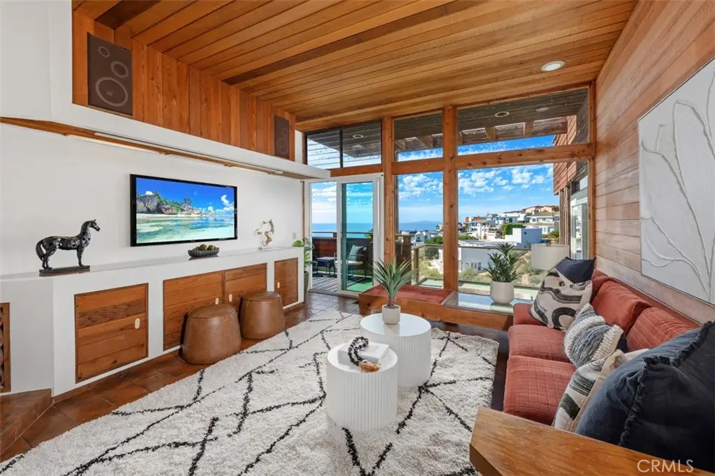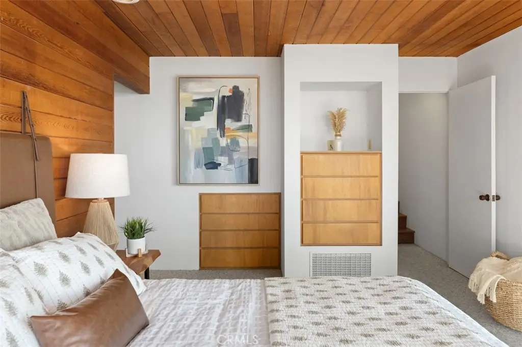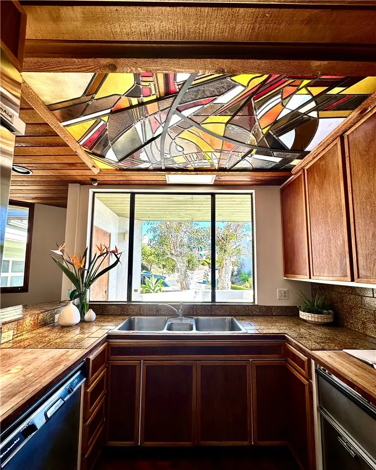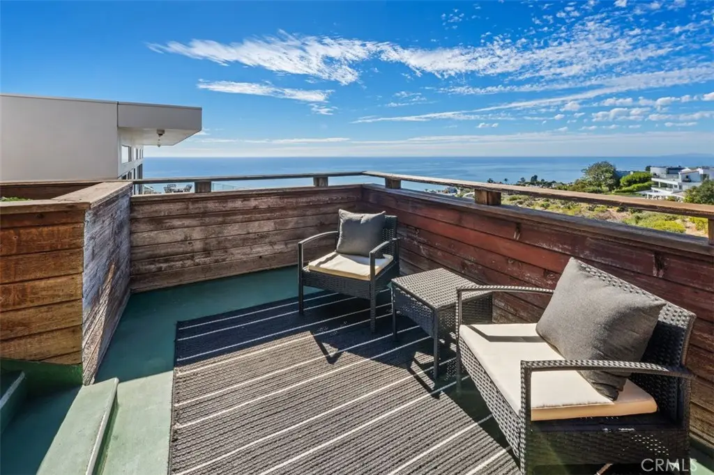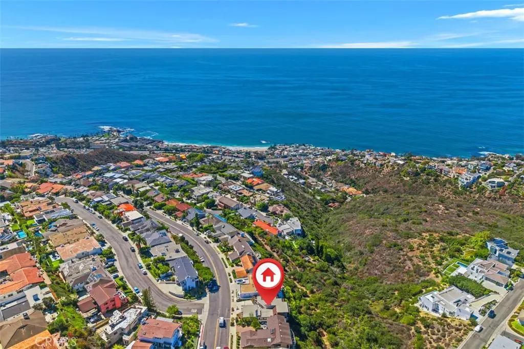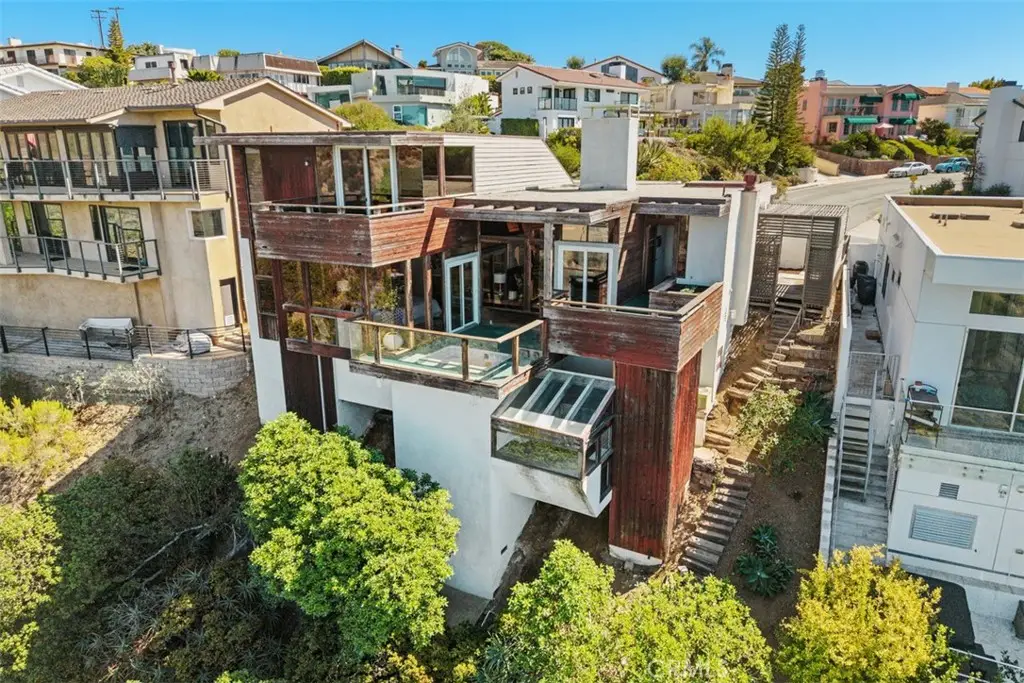 Perched atop Balboa Avenue, just steps from Moulton Meadows Park, this 1977 mid-century residence offers panoramic views of the Pacific Ocean, canyon, and coastline. Designed by award-winning architect Blair Ballard, recognized by the Laguna Beach Architectural Guild for excellence in residential design, this home reflects Frank Lloyd Wright's organic architecture philosophy of blending structure and setting in harmony. Its multi-level layout features cedar plank walls and ceilings, expansive glass, strong horizontal lines and a timeless mid-century modern aesthetic. Two exquisite handcrafted stained-glass installations by Mogens Abel, revered wood carver and longtime Festival of Arts exhibitor, are set in the entry and kitchen ceilings and beautifully infuse the space with color, artistry and Laguna's creative spirit. The primary suite offers stunning ocean views through walls of windows and includes a walk-in closet and a step-down shower with a full-length view window. Sliding glass doors open to the deck with a sunken jacuzzi for enjoying the spectacular sunset views over Victoria Beach. Two additional bedrooms off the main entrance hallway are ideal for a home office or guest room. Both the family room and upper-level den offer captivating ocean views and refreshing coastal breezes. The side yard patio opens to a trellis covered potting shed and leads down the hill to an ocean-facing greenhouse. While the home requires some restoration, it is solidly constructed and full of character, including the original built-in seating, hardware and cabinetry. Don't miss this rare opportunity to personalize and revive a living piece of Laguna Beach's celebrated art culture and architectural legacy.