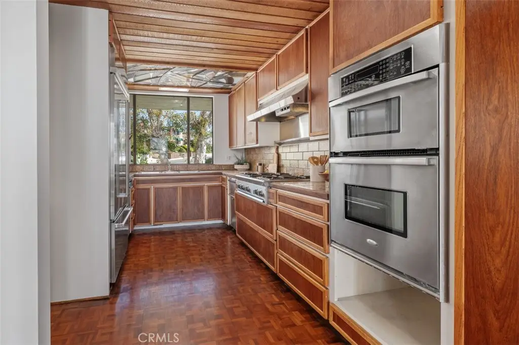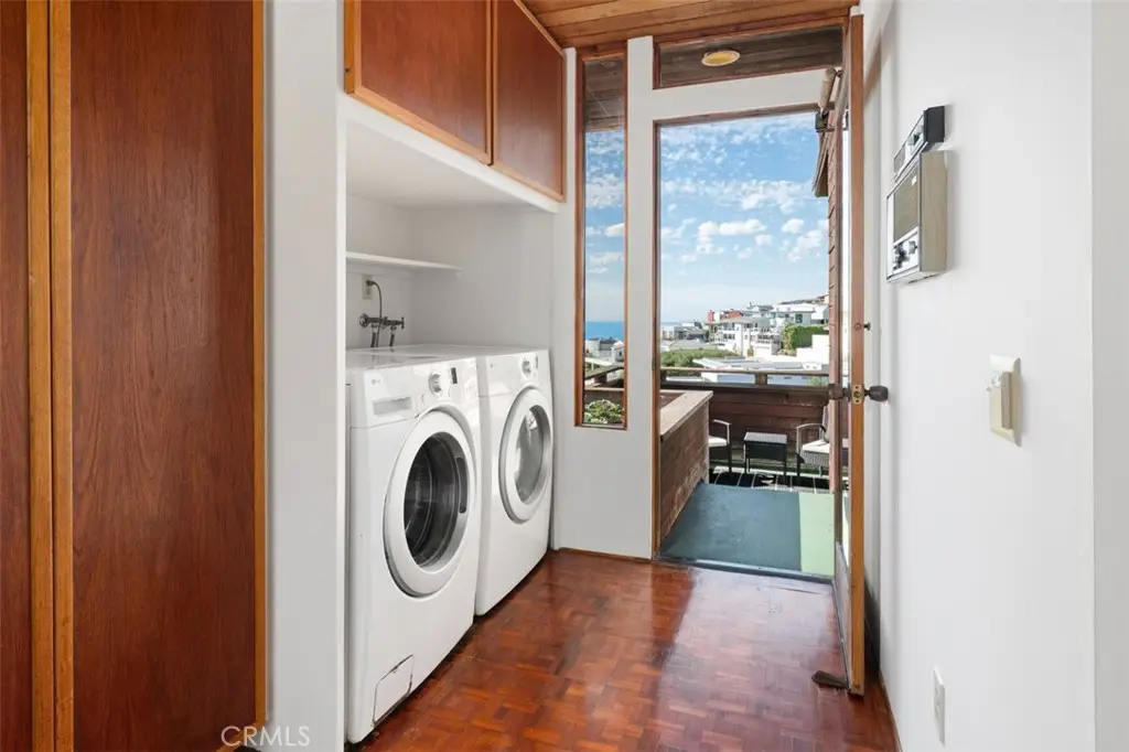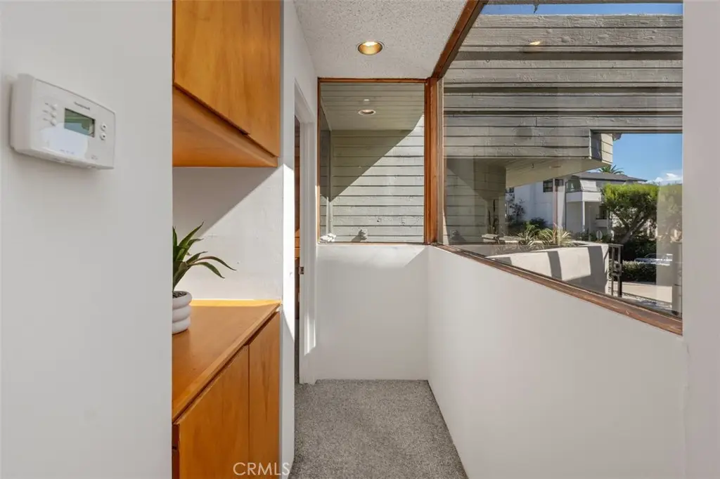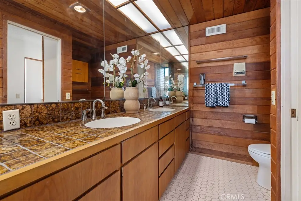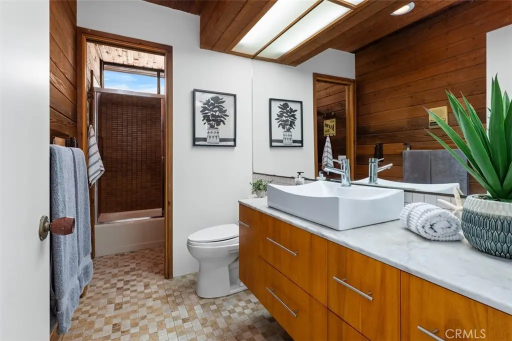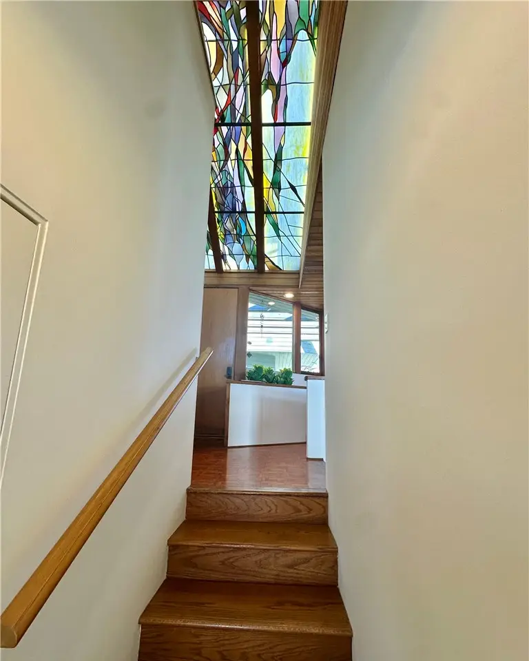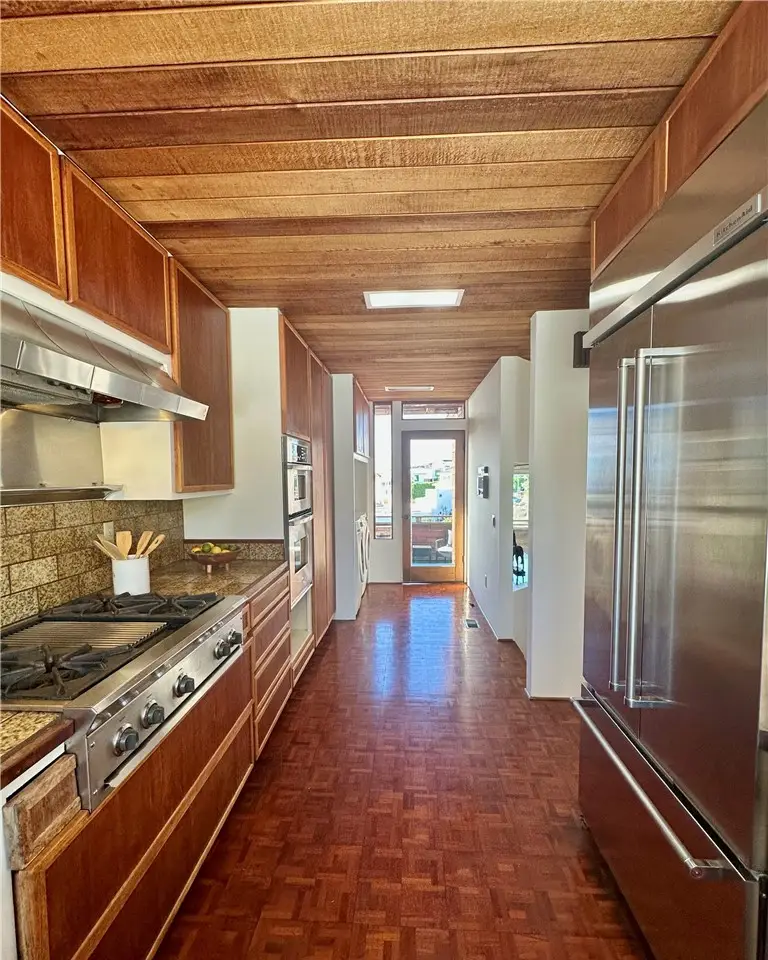 Perched atop Balboa Avenue, just steps from Moulton Meadows Park, this 1977 mid-century residence offers panoramic views of the Pacific Ocean, canyon, and coastline. Designed by award-winning architect Blair Ballard, recognized by the Laguna Beach Architectural Guild for excellence in residential design, this home reflects Frank Lloyd Wright's organic architecture philosophy of blending structure and setting in harmony. Its multi-level layout features cedar plank walls and ceilings, expansive glass, strong horizontal lines and a timeless mid-century modern aesthetic. Two exquisite handcrafted stained-glass installations by Mogens Abel, revered wood carver and longtime Festival of Arts exhibitor, are set in the entry and kitchen ceilings and beautifully infuse the space with color, artistry and Laguna's creative spirit. The primary suite offers stunning ocean views through walls of windows and includes a walk-in closet and a step-down shower with a full-length view window. Sliding glass doors open to the deck with a sunken jacuzzi for enjoying the spectacular sunset views over Victoria Beach. Two additional bedrooms off the main entrance hallway are ideal for a home office or guest room. Both the family room and upper-level den offer captivating ocean views and refreshing coastal breezes. The side yard patio opens to a trellis covered potting shed and leads down the hill to an ocean-facing greenhouse. While the home requires some restoration, it is solidly constructed and full of character, including the original built-in seating, hardware and cabinetry. Don't miss this rare opportunity to personalize and revive a living piece of Laguna Beach's celebrated art culture and architectural legacy.