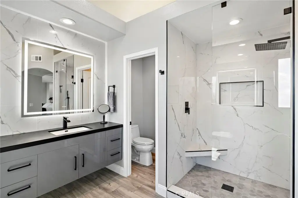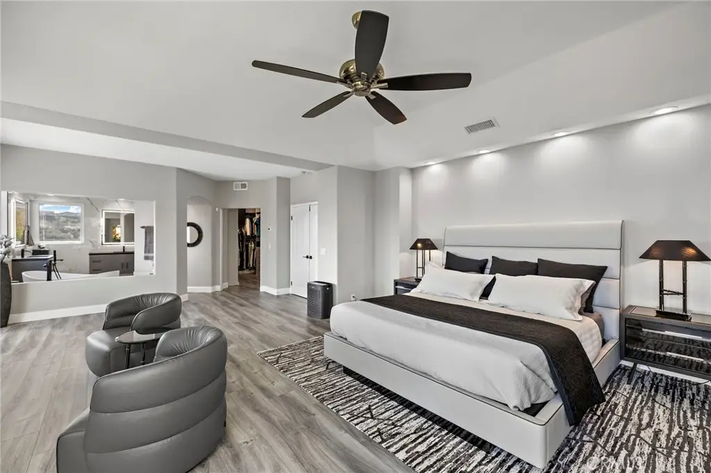 • Luxurious primary suite with modern linear fireplace