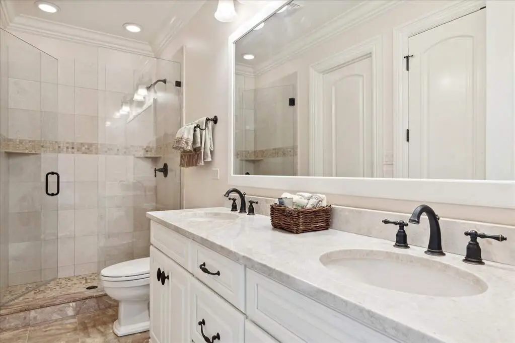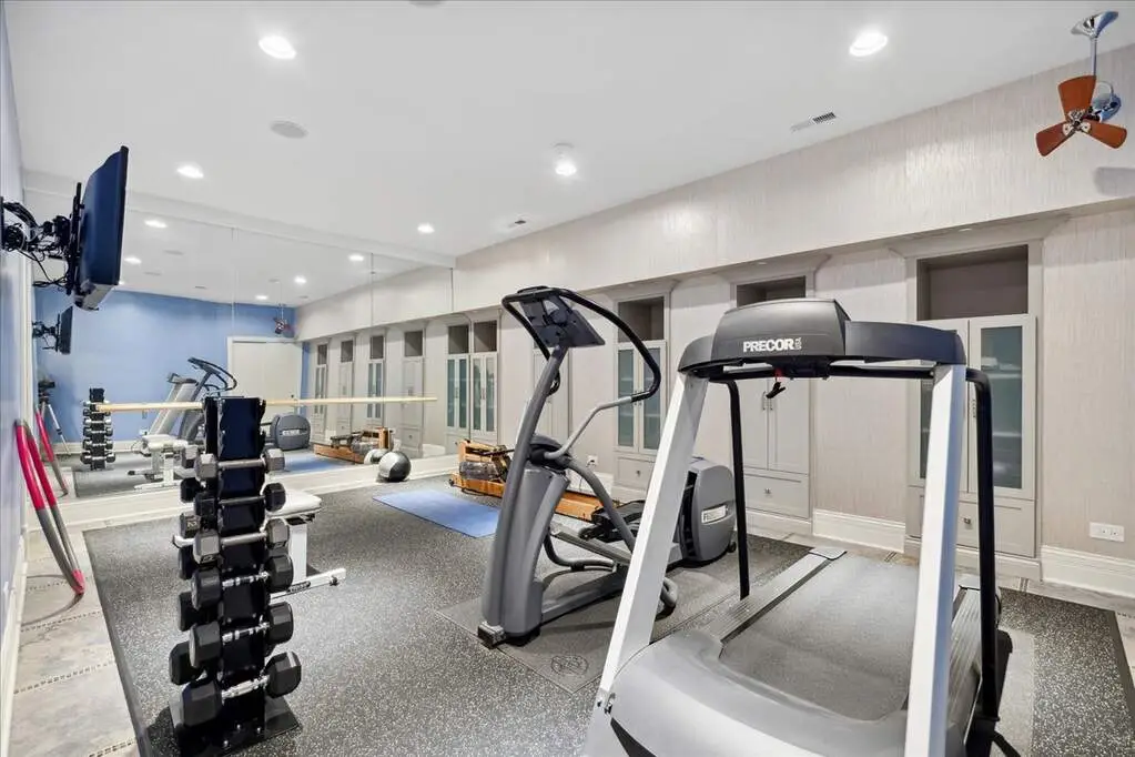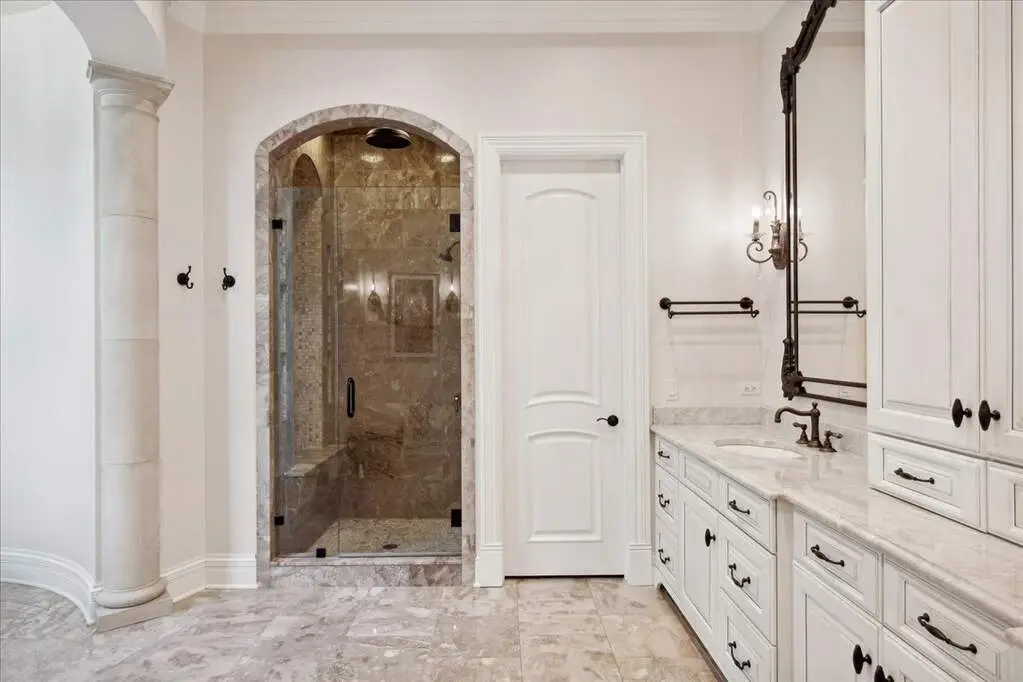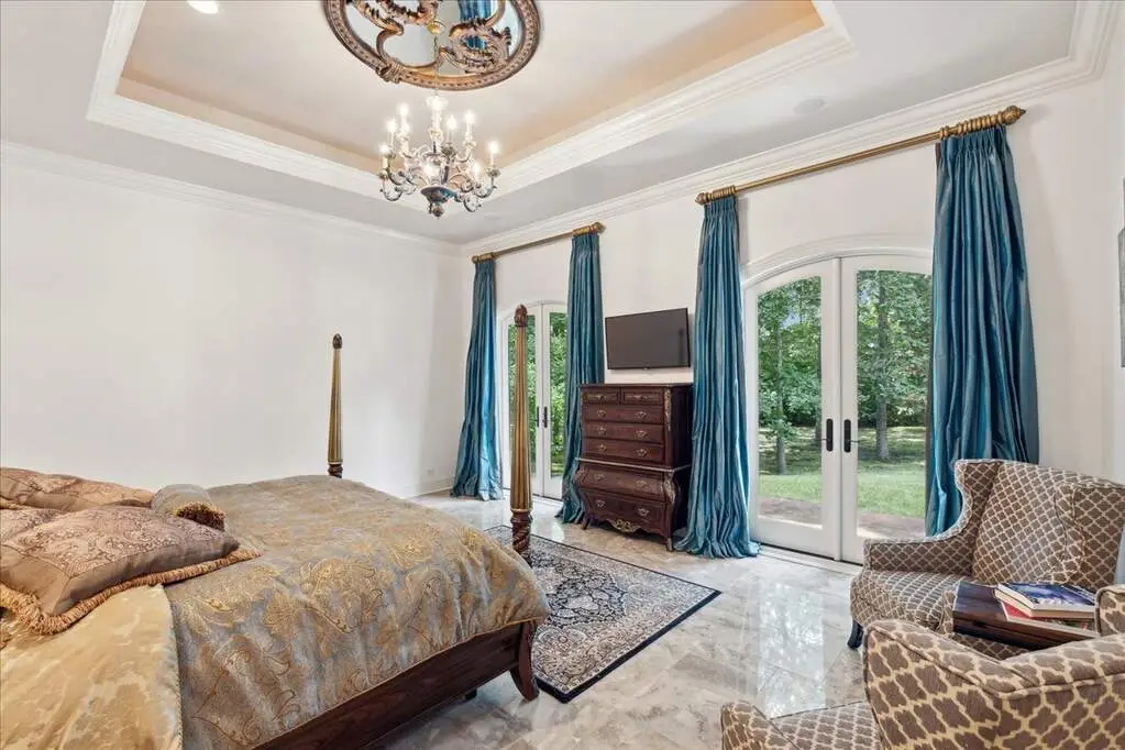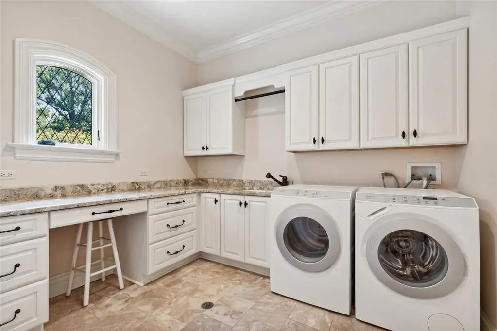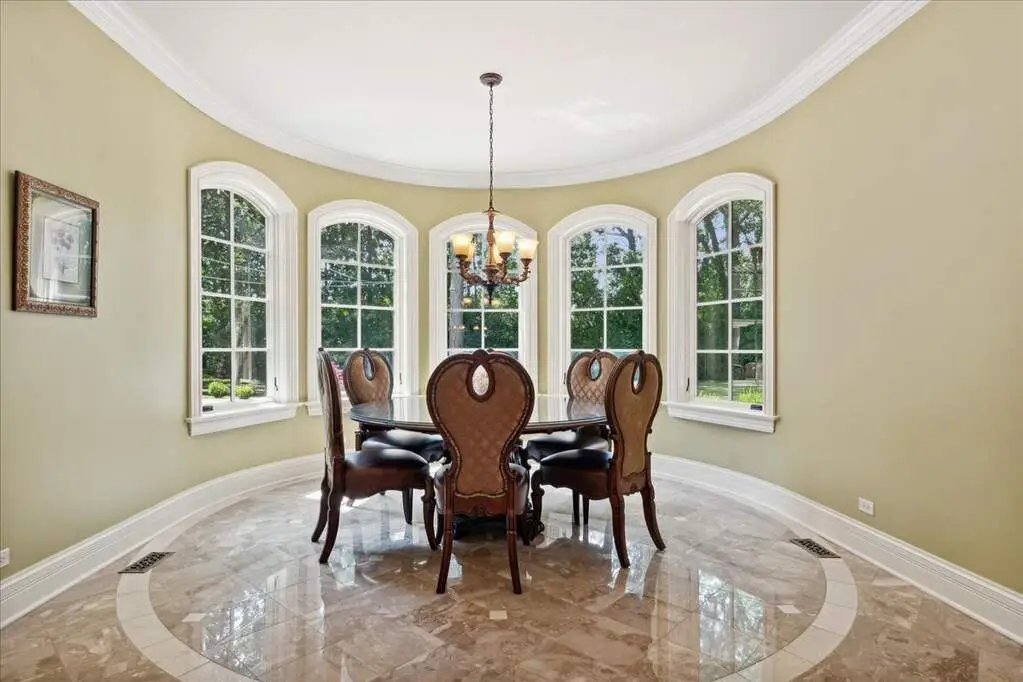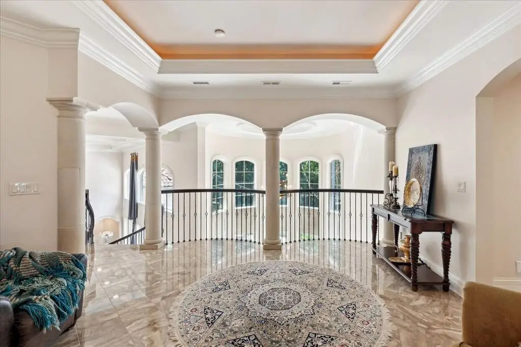 This exceptional 5,700 SF Mediterranean-style villa, crafted with stucco and stone and crowned with a clay tile roof, was meticulously designed and built by the current owners in 2012. The home boasts soaring ceilings and expansive windows that frame views of the beautifully manicured grounds and gardens. Distinctive architectural details and millwork enhance its elegance, while heated marble floors throughout add a touch of luxury. Guests are welcomed into a grand foyer that overlooks a two-story living room featuring a coffered ceiling, a stone fireplace, and three sets of glass doors leading to the patio. The formal dining room, with its stunning domed ceiling and adjacent bar area, is perfect for entertaining. The chef's kitchen, complete with a breakfast room, showcases granite and Taj Mahal quartzite countertops, a spacious breakfast bar with seating for four, two walk-in pantries, a Wolf double oven with a six-burner stove, oversized Subzero refrigerator with freezer and frig drawers, and two Miele dishwashers. This space flows seamlessly into the family room, which opens to an outdoor patio equipped with a built-in grill, serving space, and a gas-start fire pit, all overlooking the meticulously landscaped 1.63-acre property. The first-floor primary suite is a retreat in itself, featuring a tray ceiling, two custom-designed walk-in closets, built-in cabinetry, and an opulent bath with a unique copper-pounded tub, a separate shower, a double vanity, and an adjacent private office. A wrought iron bridal staircase leads to the upper level, where you'll find four large bedrooms, four luxurious bathrooms, plus a spacious loft. The English basement exceeds expectations with its deep window wells allowing natural sunlight to illuminate the space. This extraordinary level includes a fitness room with five lockers, a sauna and steam shower, a game room with a billiard area, a dance floor with a disco ball, a fully equipped wet bar with a mirrored backsplash, a wine beverage center, and a theater room. Exceptional in every way-this home is a must-see!