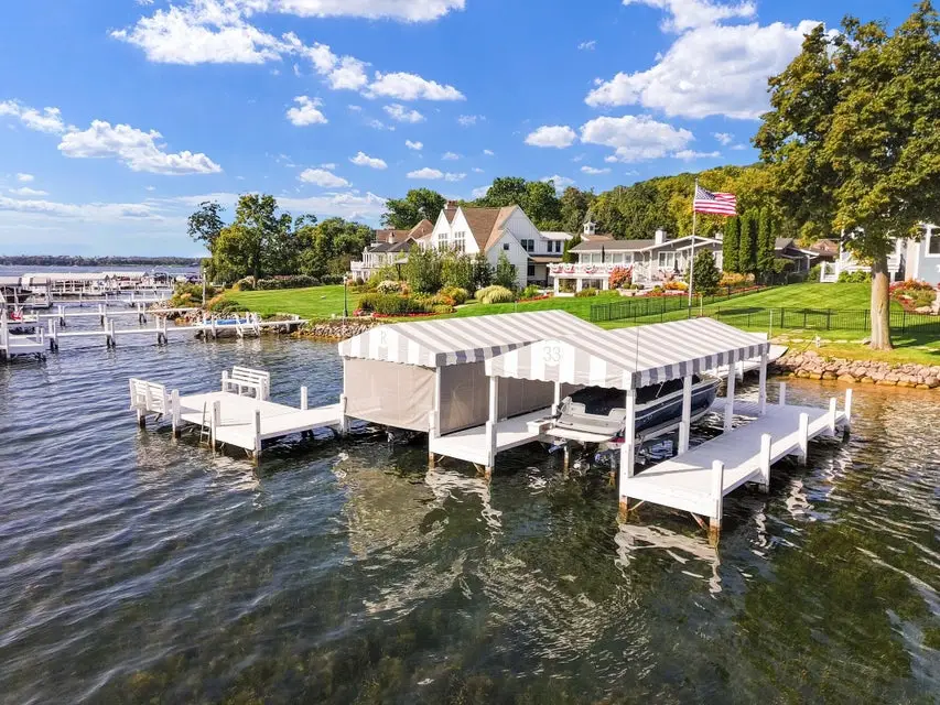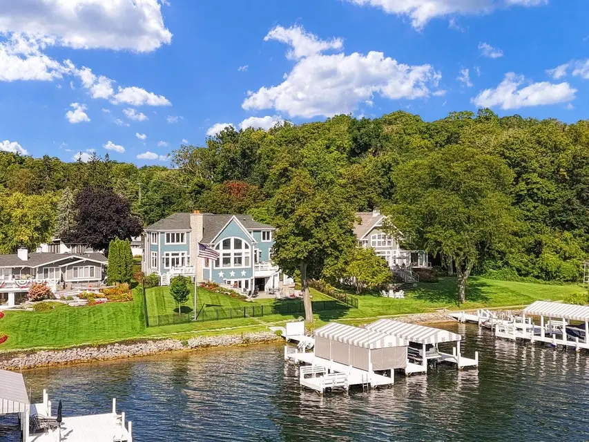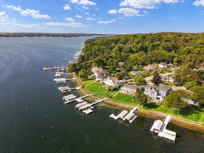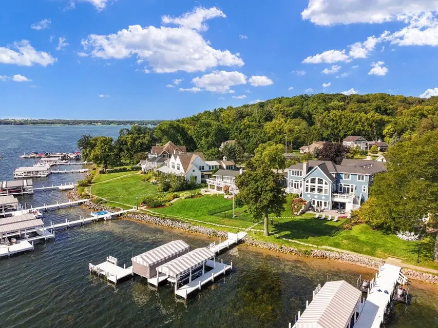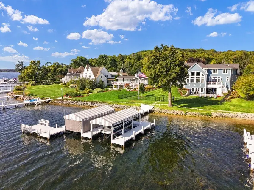 Stunning panoramic views come with this level lake frontage luxury home built in 2018. Sweeping lake views on all 3 levels from almost every room. Close to 7000 sq. ft of living space. Beautiful kitchen with 6ft Subzero frig and Viking 60'' double oven and hidden walk-in pantry. Main floor laundry and main floor in-suite master with steam shower and huge closet with island, 2 other in-suite bedrooms and one jack & jill. Exquisite landscaping with fenced yard and irrigation system. Lower-level family room with entertaining bar and walkouts to lower-level patio with screened porch. Lots of storage area too. 2 canopied piers. 102 feet of frontage, three-car garage and huge paved driveway. Turnkey, just bring your clothes. Jump on the lake path and you are one mile to downtown Lake Geneva!