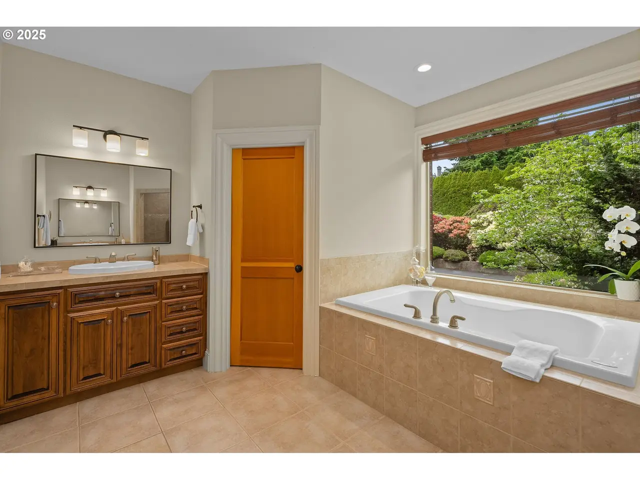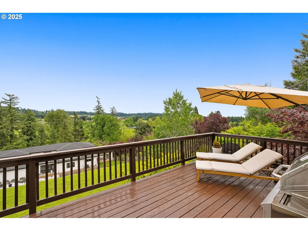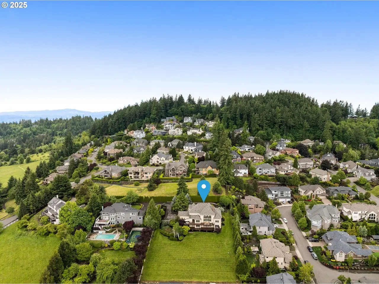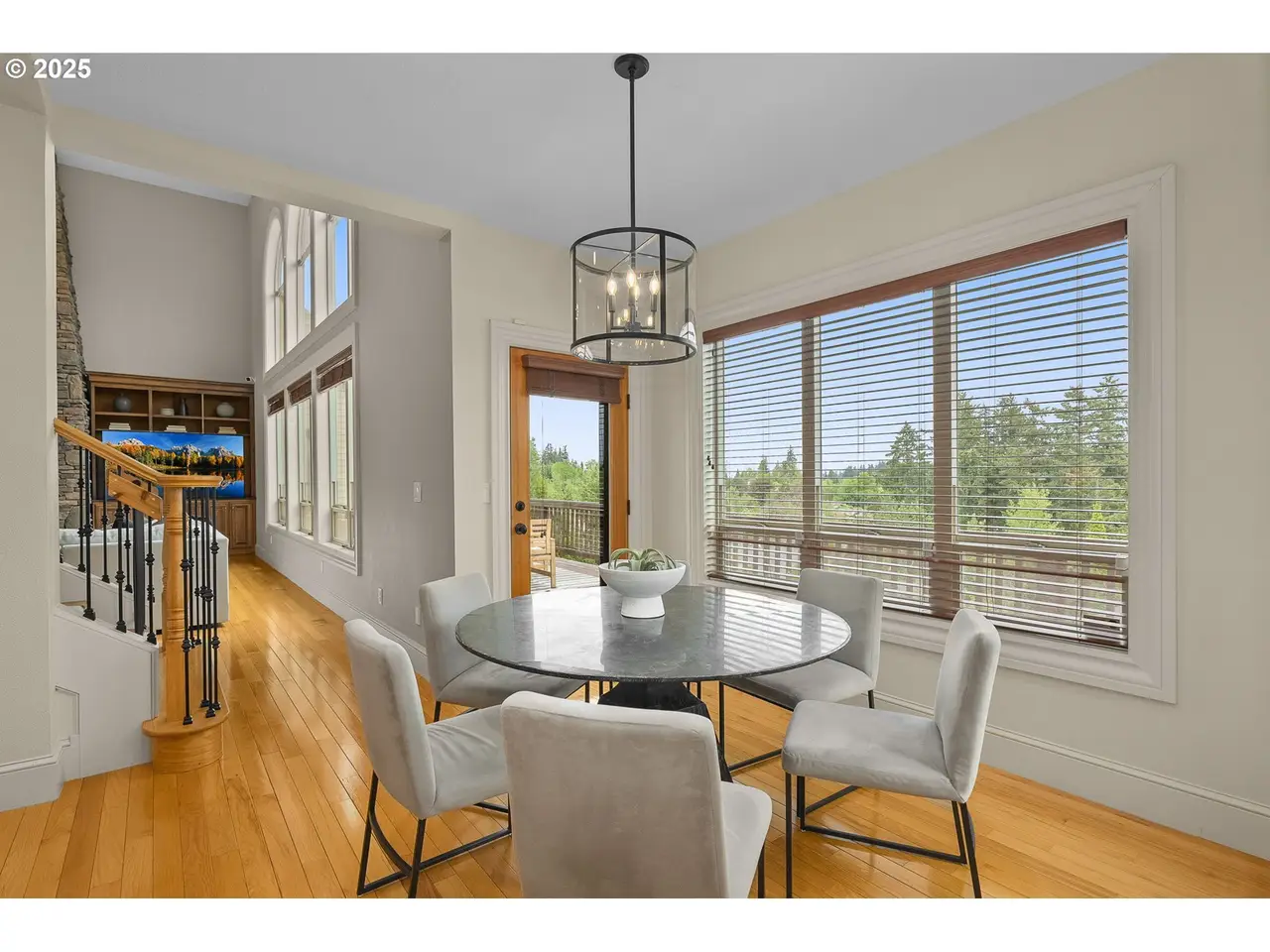 Tucked at the end of a secluded drive and enveloped by nearly an acre of property, this home offers a rare opportunity to own a grand, private estate just minutes from the heart of Lake Oswego. With over 6,300 square feet of masterfully designed living space, this extraordinary residence blends timeless sophistication with modern comforts. A dramatic foyer leads into an expansive great room, where soaring ceilings and floor-to-ceiling stonework frame a striking fireplace. Rich hardwood floors flow into the formal dining area and spacious formal seating area, creating a refined yet welcoming atmosphere. The gourmet kitchen is designed to impress, featuring slab granite countertops, a large island, walk-in pantry, top-of-the-line stainless appliances, and both a breakfast nook and direct access to an expansive entertaining deck with panoramic views. The main-level primary suite is a private retreat, complete with its own stunning vistas, deck access, dual walk-in closets, and a spa-like bath with double sinks, a soaking tub, and elegant tile finishes. Upstairs, three generously sized bedroom suites provide comfort and autonomy for family or guests, each offering walk-in closets and en suite bathrooms. The lower level is dedicated to recreation and entertainment, featuring a fully equipped bar and game room, a professional-grade home theater, and spacious home gym with custom mat flooring. A second oversized primary suite on this level includes its own exterior entrance - ideal for multigenerational living or a private guest escape. Outside, the manicured gardens, raised beds, covered deck, and expansive yard space all create a tranquil oasis for both entertaining and quiet relaxation. Ideally located just minutes from boutique shopping, fine dining, top-rated golf courses, parks and the new Lake Oswego Recreation & Aquatic Center. For the discerning buyer who values serenity as well as access to amenities, this home is the best of both worlds.
