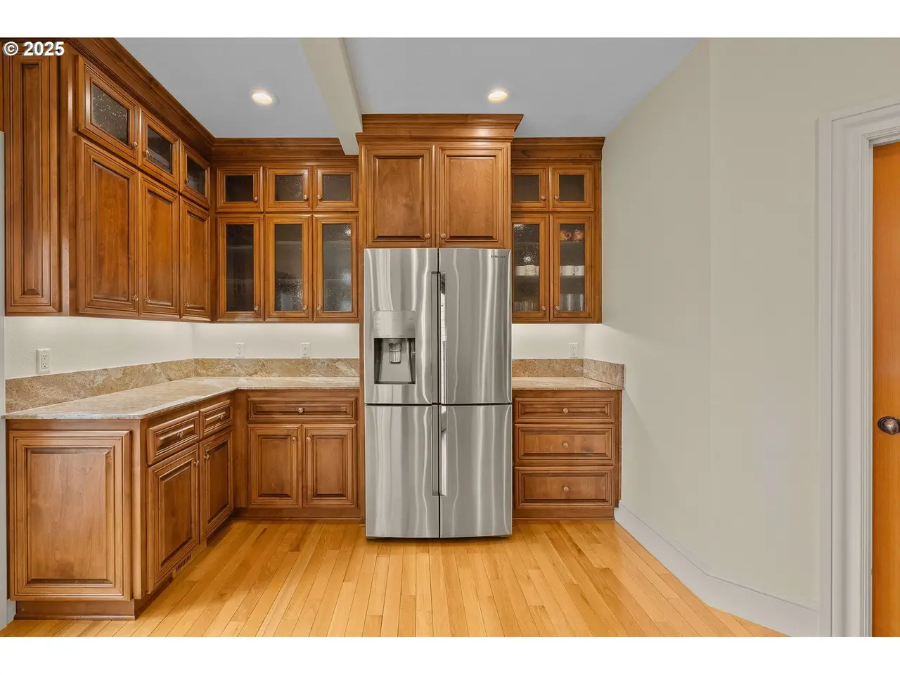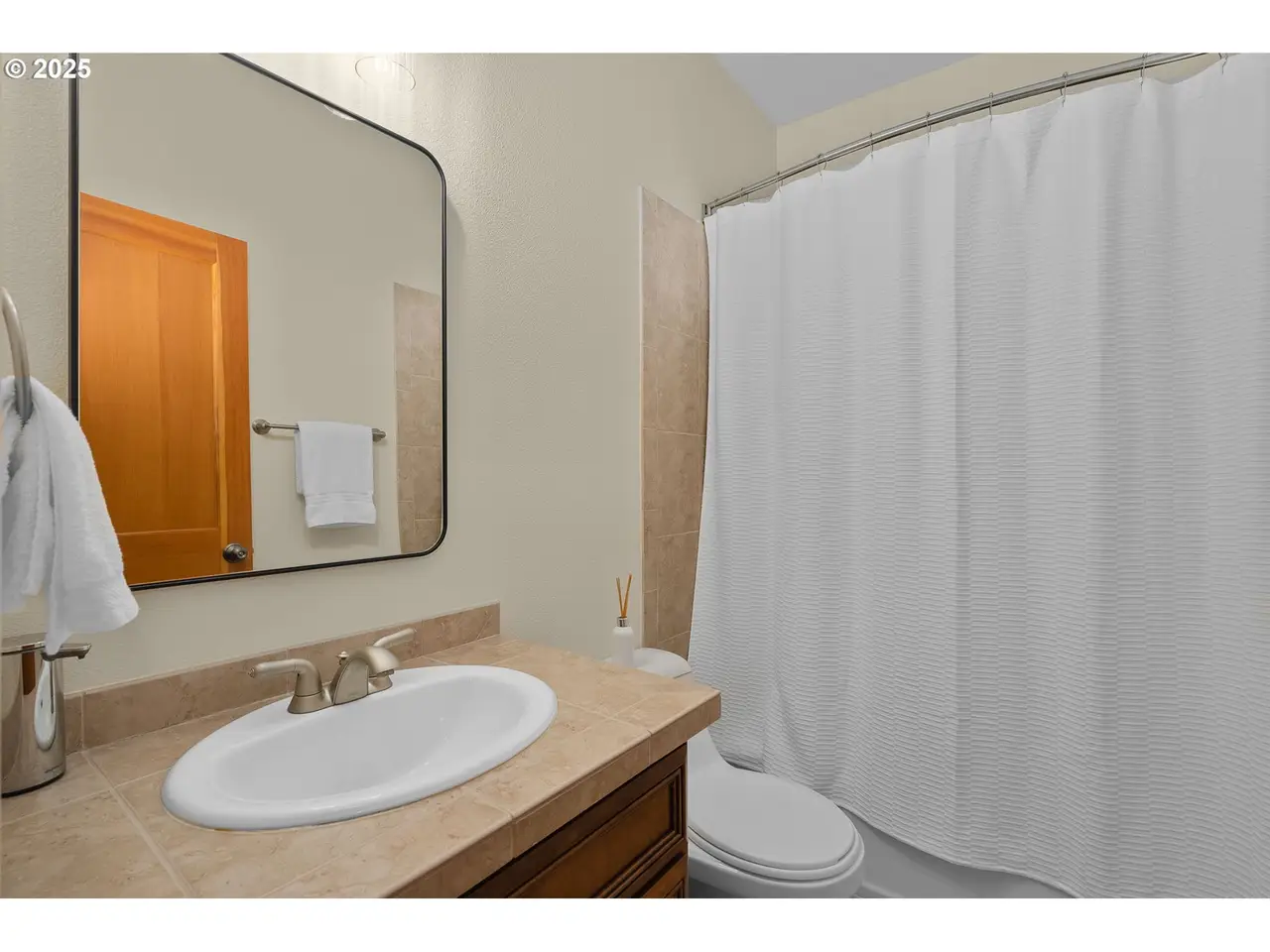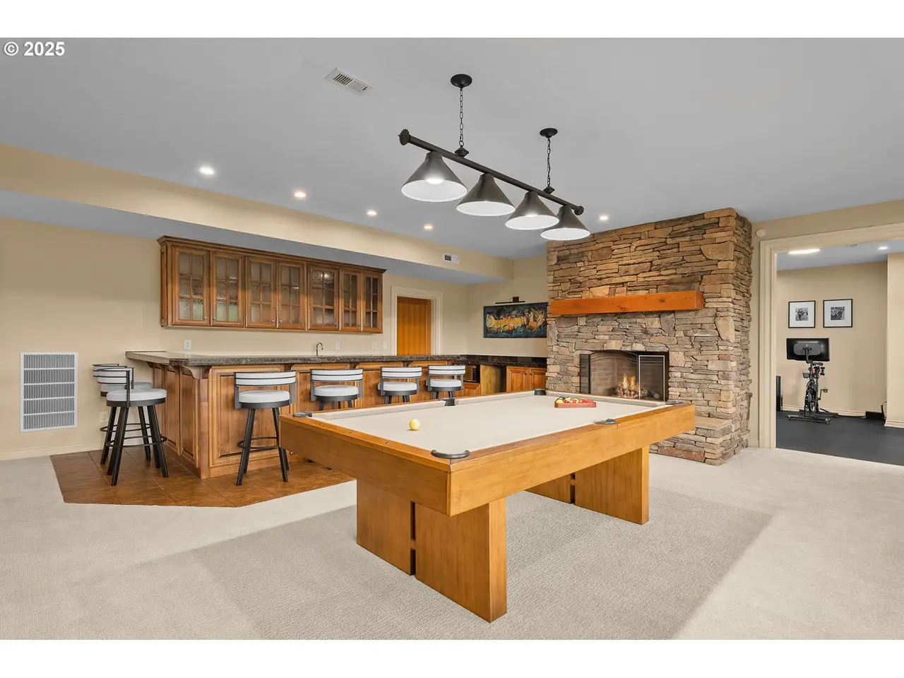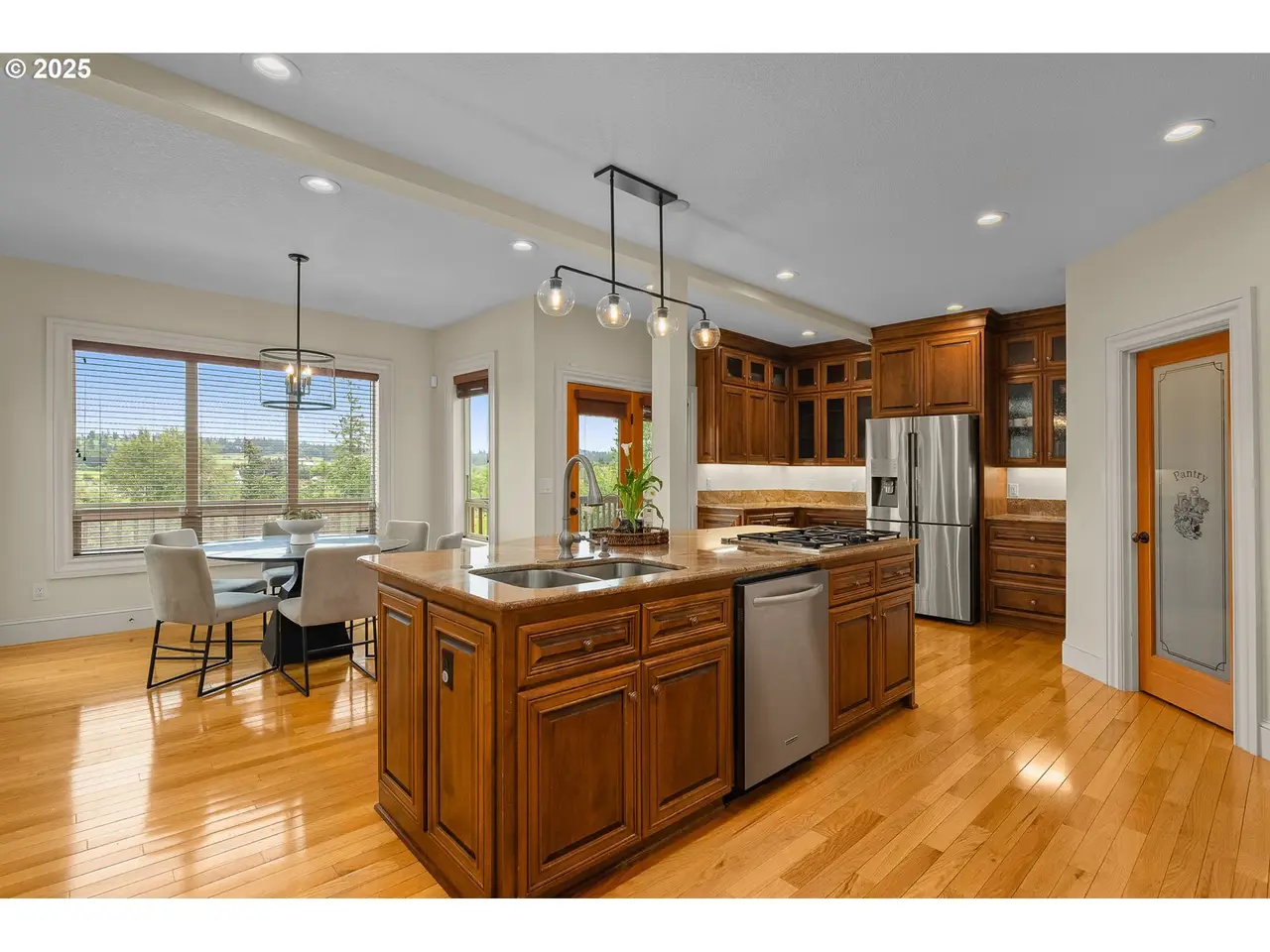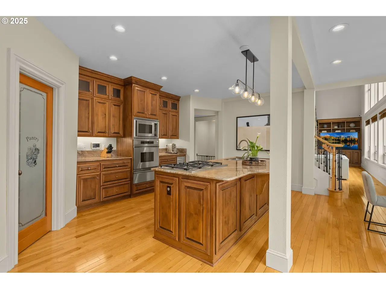 Tucked at the end of a secluded drive and enveloped by nearly an acre of property, this home offers a rare opportunity to own a grand, private estate just minutes from the heart of Lake Oswego. With over 6,300 square feet of masterfully designed living space, this extraordinary residence blends timeless sophistication with modern comforts. A dramatic foyer leads into an expansive great room, where soaring ceilings and floor-to-ceiling stonework frame a striking fireplace. Rich hardwood floors flow into the formal dining area and spacious formal seating area, creating a refined yet welcoming atmosphere. The gourmet kitchen is designed to impress, featuring slab granite countertops, a large island, walk-in pantry, top-of-the-line stainless appliances, and both a breakfast nook and direct access to an expansive entertaining deck with panoramic views. The main-level primary suite is a private retreat, complete with its own stunning vistas, deck access, dual walk-in closets, and a spa-like bath with double sinks, a soaking tub, and elegant tile finishes. Upstairs, three generously sized bedroom suites provide comfort and autonomy for family or guests, each offering walk-in closets and en suite bathrooms. The lower level is dedicated to recreation and entertainment, featuring a fully equipped bar and game room, a professional-grade home theater, and spacious home gym with custom mat flooring. A second oversized primary suite on this level includes its own exterior entrance - ideal for multigenerational living or a private guest escape. Outside, the manicured gardens, raised beds, covered deck, and expansive yard space all create a tranquil oasis for both entertaining and quiet relaxation. Ideally located just minutes from boutique shopping, fine dining, top-rated golf courses, parks and the new Lake Oswego Recreation & Aquatic Center. For the discerning buyer who values serenity as well as access to amenities, this home is the best of both worlds.