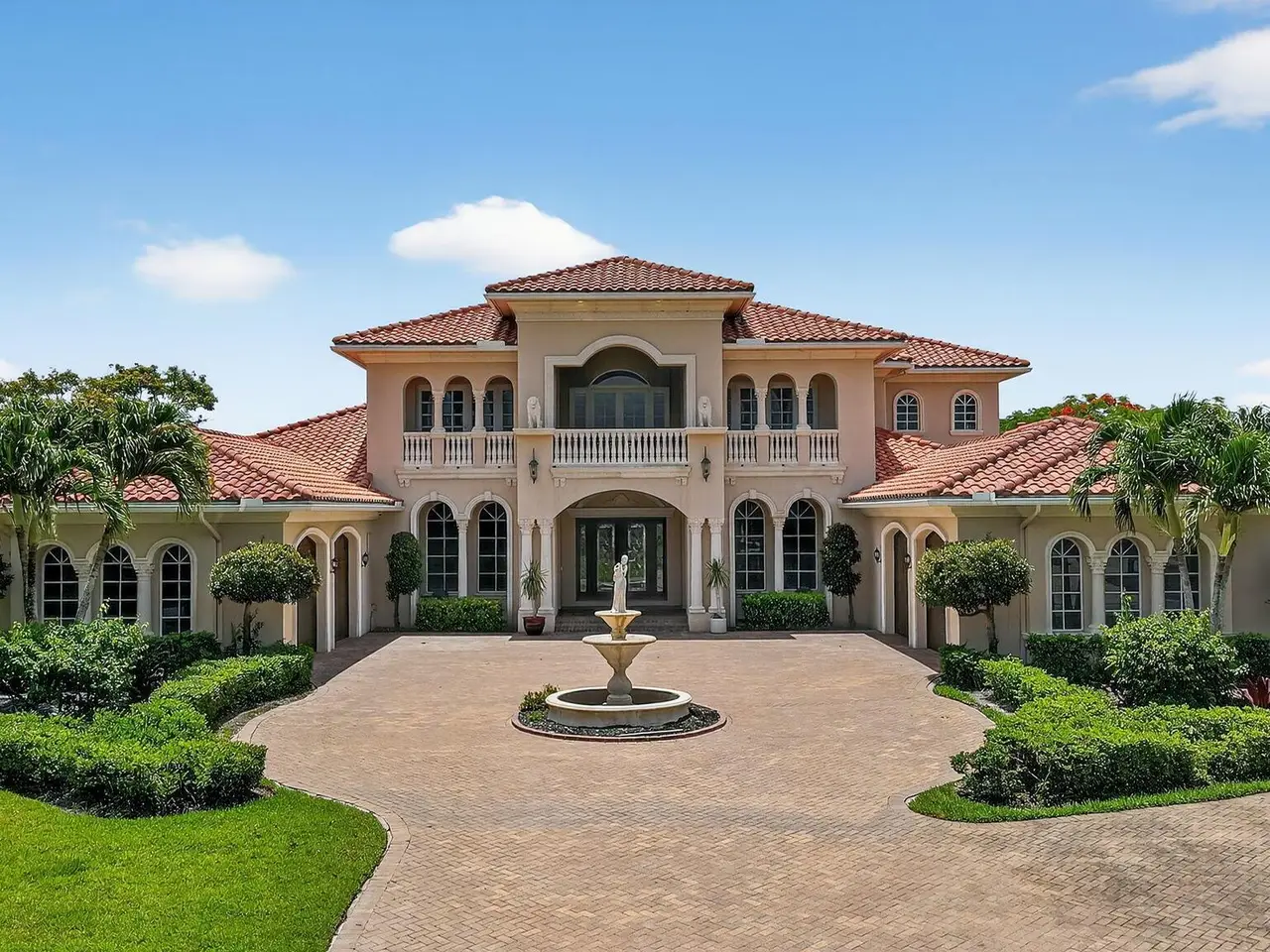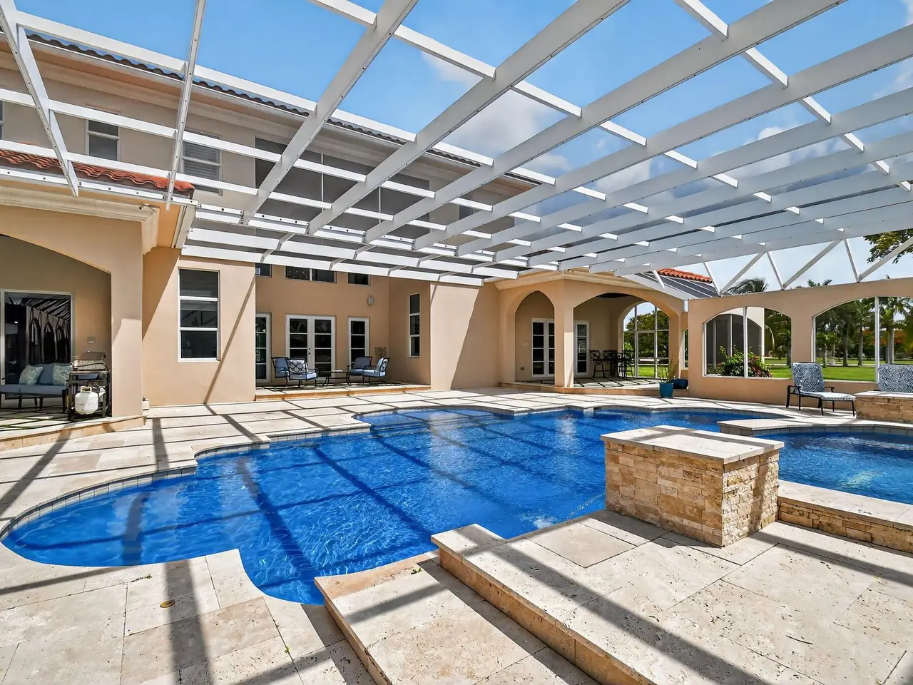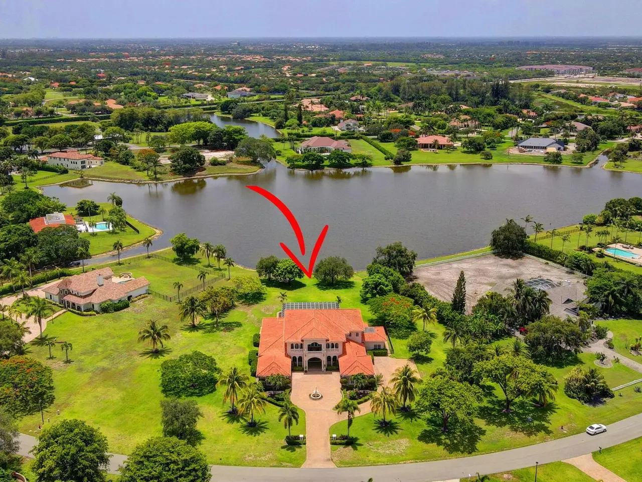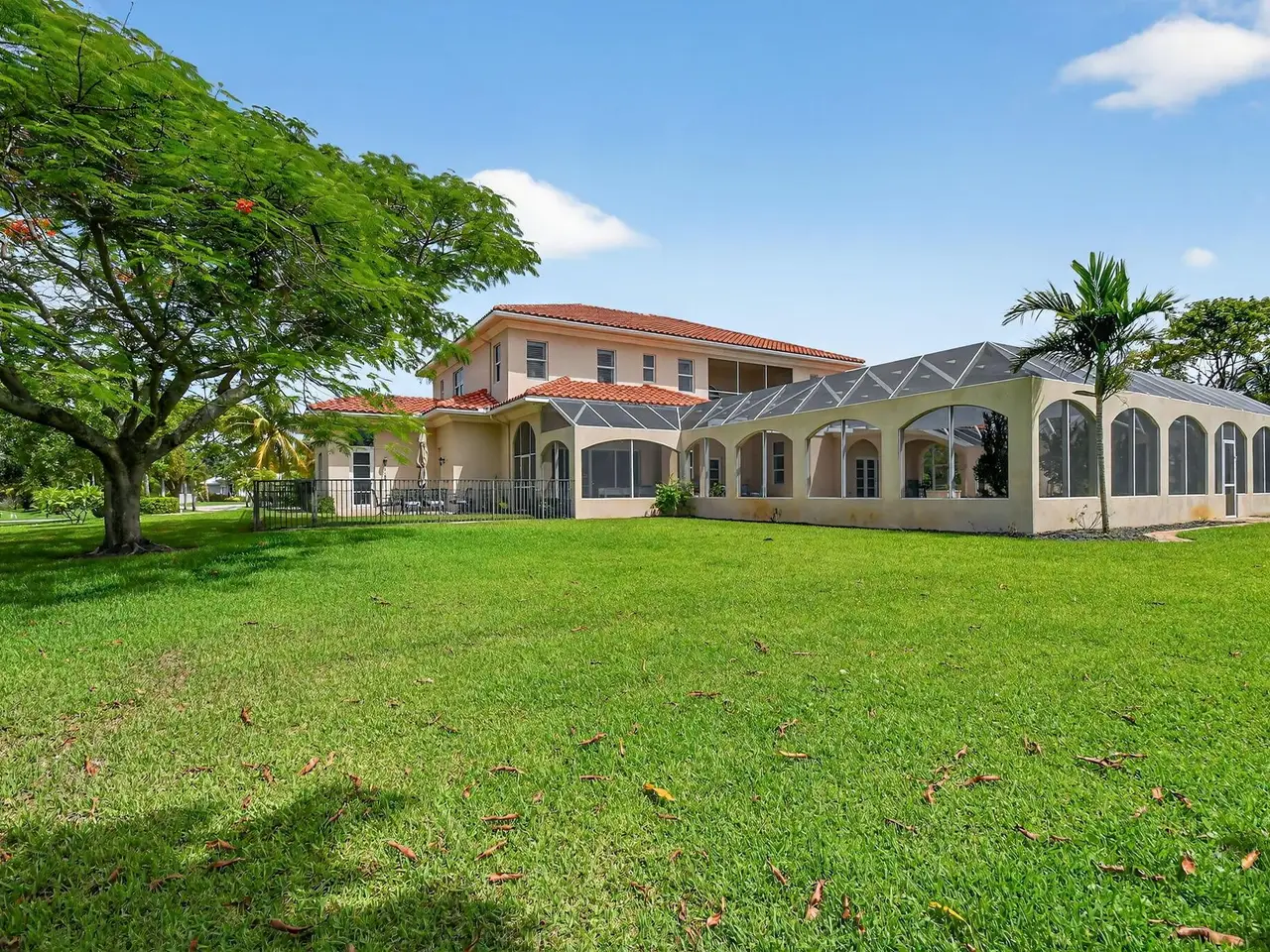 Casual elegance & exquisite craftsmanship define this magnificent custom-built home featuring 6 bedrooms, 7.5 bathrooms & 4 car garage. Situated on over 2 acres, the estate welcomes you with a wide circular driveway & fountain centerpiece. In the grand foyer, gleaming marble floors, a dazzling crystal chandelier & soaring ceilings create an unforgettable first impression. A breathtaking winding staircase sets the tone for the sophisticated design found throughout. The chef's island kitchen is a culinary dream, with 2 wall ovens, a Sub-Zero refrigerator & gas stove- perfect for entertaining or everyday luxury. Nearly every main room showcases a unique ceiling design, adding character & charm at every turn! Outside is your resort-style oasis. The pool/spa area is framed by elegant walled arches, creating a serene Mediterranean retreat. Multiple balconies & patios offer the perfect setting for al fresco dining, relaxation or entertaining. Wander down to the peaceful lakeside patio and soak in the views. Equestrians, your horses are welcome! Despite the serene seclusion, this exceptional home is conveniently located near restaurants, shops, cultural venues, & the Palm Beach International Airport. This one-of-a-kind estate is where timeless design meets modern luxury. Come experience it for yourself!