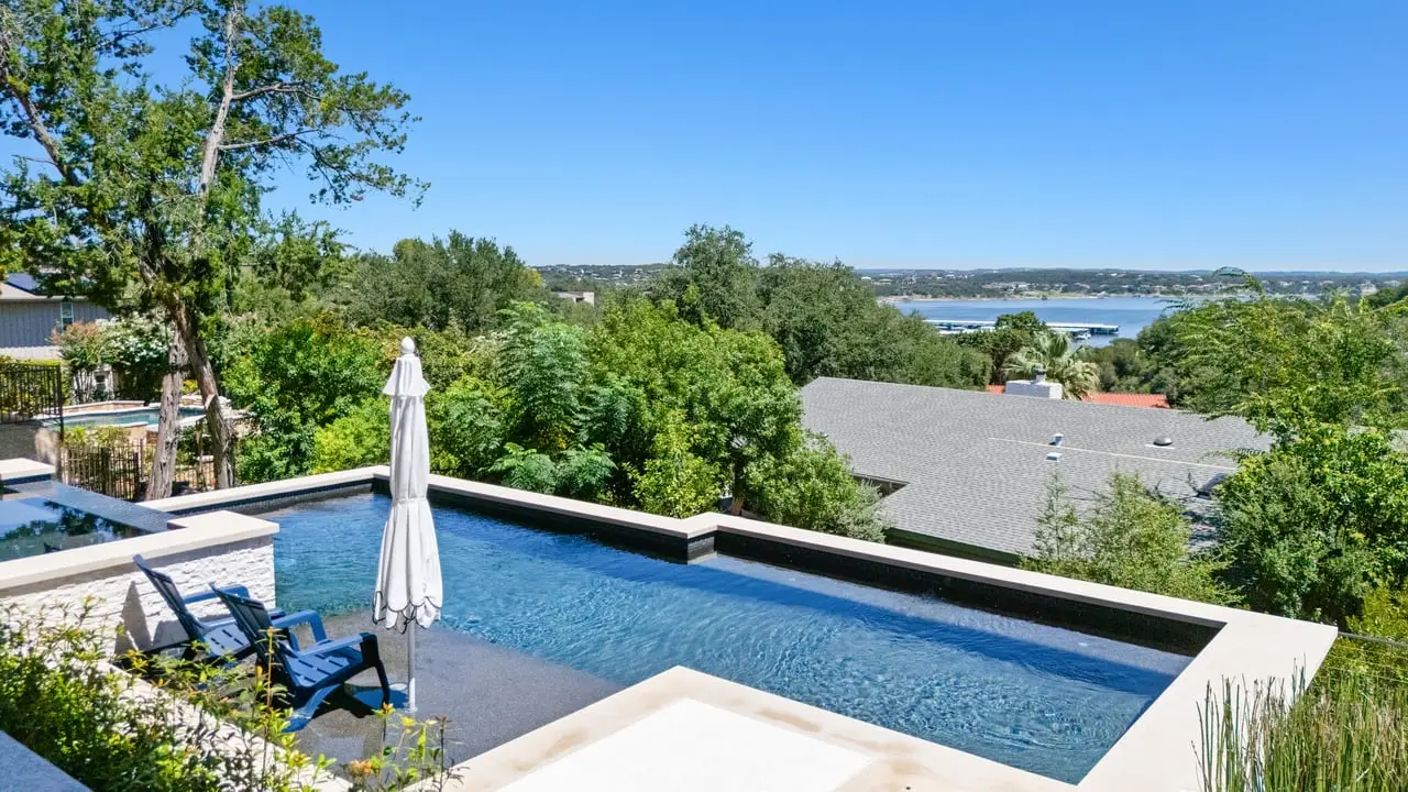 This breathtaking modern residence in the heart of Lakeway boasts captivating views of Lake Travis. Crafted by Strobel Custom Homes in a new construction endeavor, every aspect of this home has been meticulously considered. Luxurious touches abound, from the striking iron staircase encased in glass to the distinctive and modern light fixtures. Thoughtful splashes of color accentuate the space perfectly, complemented by multiple fireplaces both indoors and outdoors. The primary bath features a stunning granite wall, and the expansive floor-to-ceiling windows allow for an abundance of natural light and views of the sparkling pool and lake. A chic wet bar, complete with a serving window to the pool deck, adds an element of sophistication. The well-designed floorplan includes two bedrooms on the main level and two on the lower level, along with an office/flex space that overlooks the inviting pool. The outside entertaining areas both on the main and pool level give way to lake views, duel sided fireplaces, outdoor kitchen, swim up bar area and abundant pool decking. All construction information is available on property website.  806sunfish.com