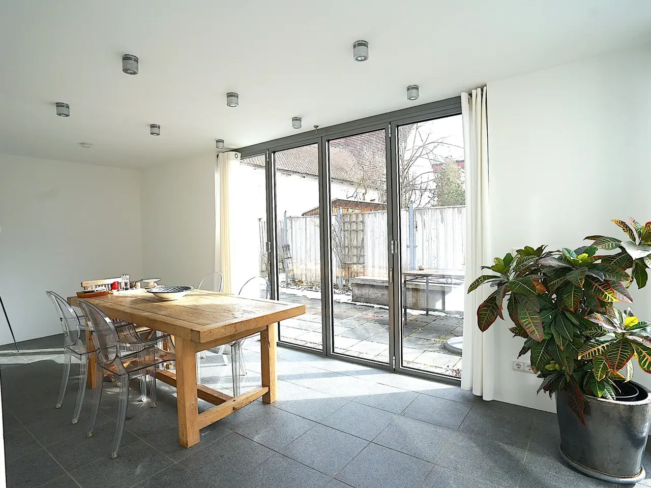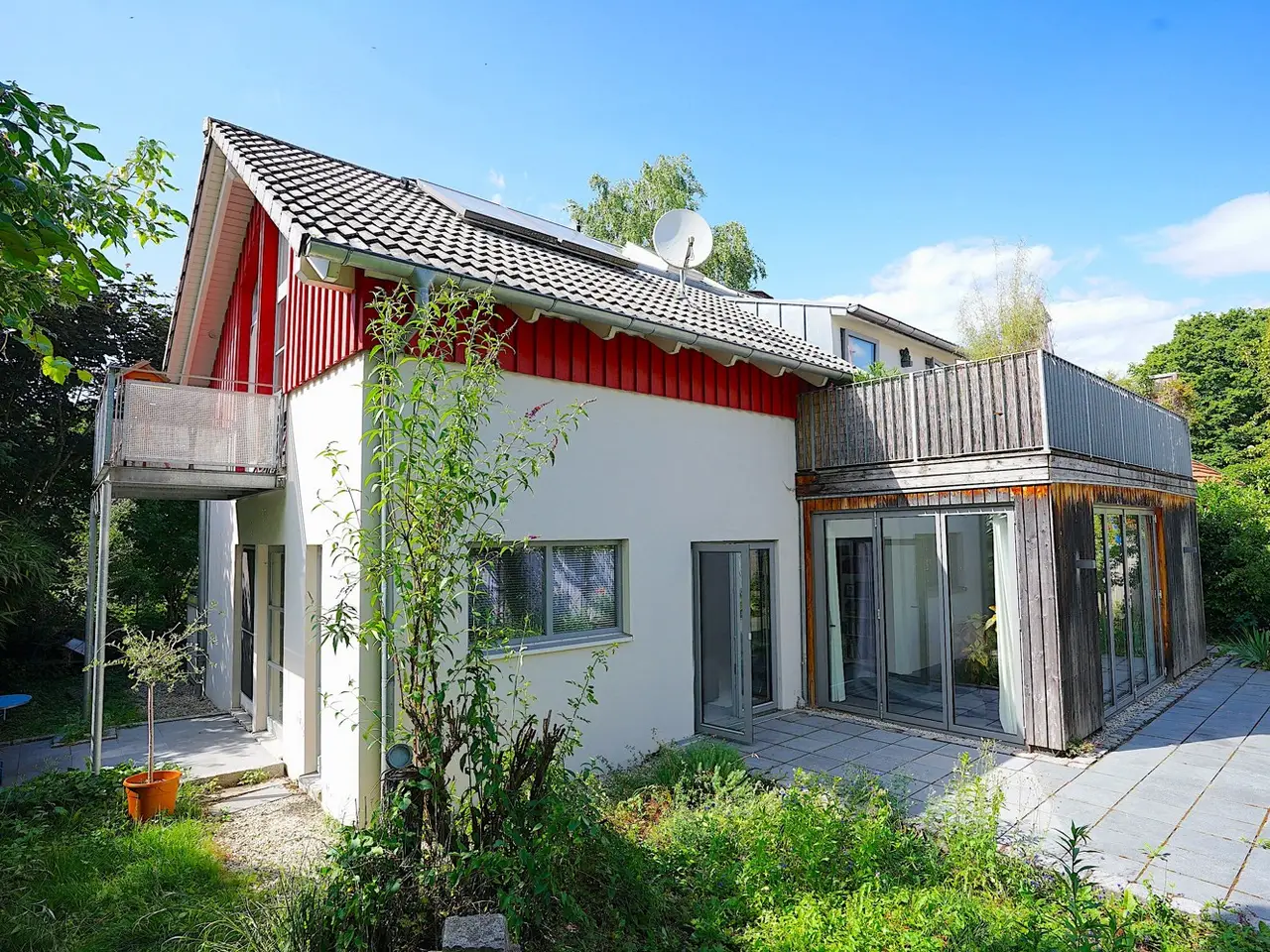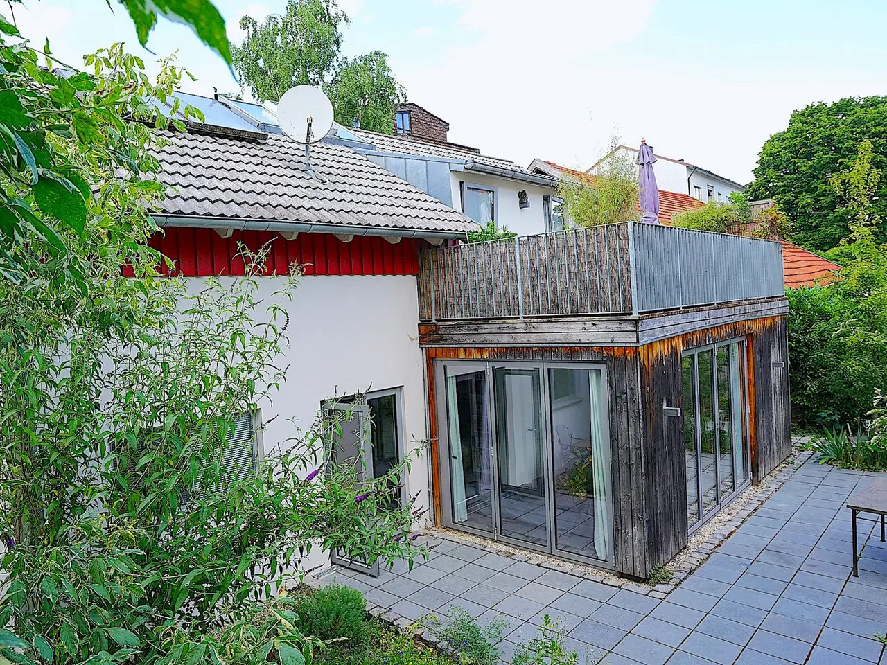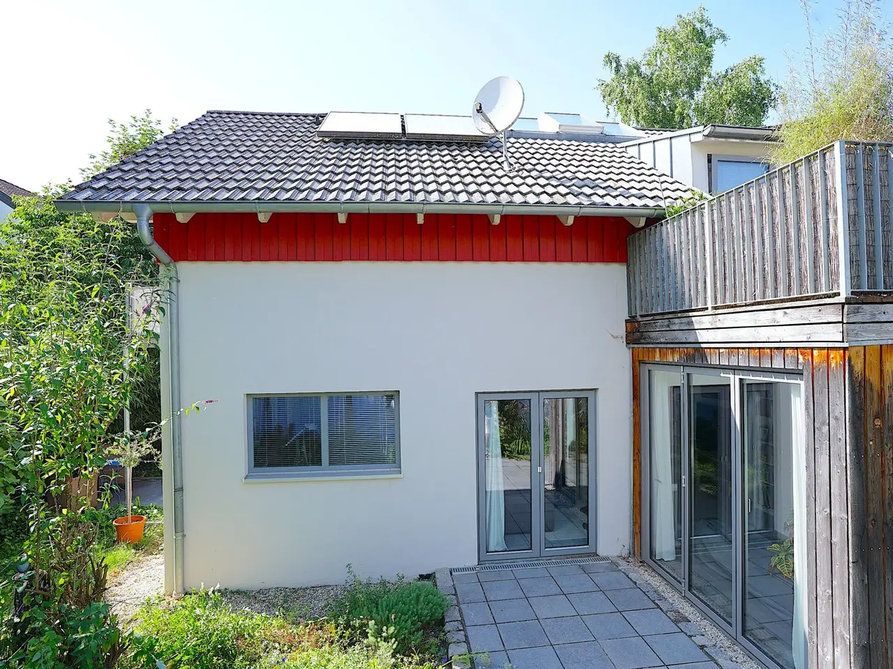 The energy-efficient house was built in 2005 in timber frame construction and extended in 2010 with an attractive living space and a roof terrace. With approx. 168 square meters of living space, there is enough room for one or two families. Thanks to the intelligent arrangement of the individual rooms, the house can be lived in entirely on the first floor in old age. The top floor apartment is accessed internally via the hallway, but can also be reached via the additional external staircase. This means that both residential units can be used independently. On the first floor, there are two connected living rooms and two bedrooms/study rooms. The spacious entrance area has room for a checkroom as well as a washing machine and dryer. Straight ahead is the very bright living/dining room with an open kitchen and another living room with a conservatory. The bedroom on the east side is quiet and protected from the sun. The bathroom has a double washbasin, WC, bath and shower. From both living rooms, you can access the south-facing terrace, which can also be extended to the west side if required. From the study, you also have direct access to the beautiful west-facing terrace. On the upper floor there is a spacious and bright living room with a west-facing balcony and two bedrooms, both with direct access to the roof terrace. The upper floor also has a practically equipped kitchen, a hallway with storage niche and a bathroom with bathtub and towel radiator. The low-maintenance and barely visible garden offers both sufficient space and enough design options to enjoy sunny days barbecuing with friends or relaxing. The largely enclosed carport has light, a power connection and an electric roller shutter. One or two additional vehicles can be parked in the area in front of the carport. The purchase price includes both kitchens, two outdoor sheds, the bathroom furniture, the carport and the outdoor parking space, with a total new value of around € 55,000. The house will impress you with its high-quality fittings and low consumption costs. You have been looking for such an exciting town house with flexible usage options for a long time. If you are interested, we look forward to hearing from you.