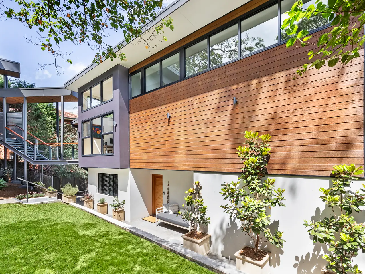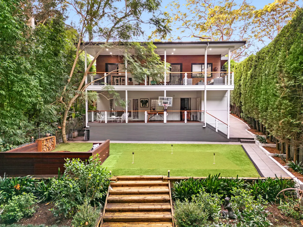 Ideally set at the end of a quiet cul-de-sac, this architecturally designed residence presents spacious family living ideal for multigenerational families and entertainers. With two floors of living spaces and dual home entry, this large home boasts generous entertaining balconies, terraces, and lounges, all surrounded by nature with enviable privacy. The interiors with soaring vaulted ceilings and glass feature windows allow a continuous flow of natural light and air, all in an enviable position only metres to the Lane Cove Golf Course and a short stroll to village shops and aquatic centre. - Expansive living and dining floor with soaring vaulted ceilings, gas fire - Gourmet gas kitchen with stone island, Vintec fridge, walk-in pantry - Main floor with optional guest bedroom/home office, master with luxury ensuite and windowfront tub - Four bedrooms on lower floor with second master ensuite, casual lounge - Multiple lounge and entertaining spaces, private putting green, firepit - Timber floors, air conditioning, guest powder room, double carport - External laundry with powder room, main bathroom with spa bath