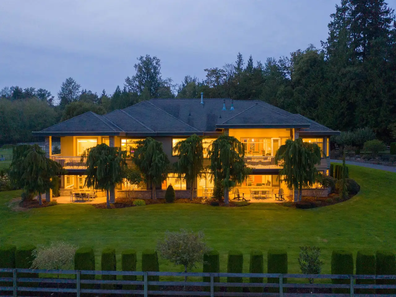 Outstanding 28.39-acre Equestrian Estate, 1000’ tree-lined commercial grade driveway with dual automated gates. Highlights include a boutique 3-stall barn, Olympic-sized outdoor arena, rolling grass pastures, and 4 km of private riding trails. The fully renovated 6412 SF, 6-bed, 6-bath home offers 10’ ceilings, two luxury kitchens, spa-inspired baths, gym, and stunning Mount Baker views. Property includes irrigated lawns, fenced paddocks, hay fields, fruit trees, and organic gardens. A rare opportunity for turnkey country living, with first class equestrian facilities.